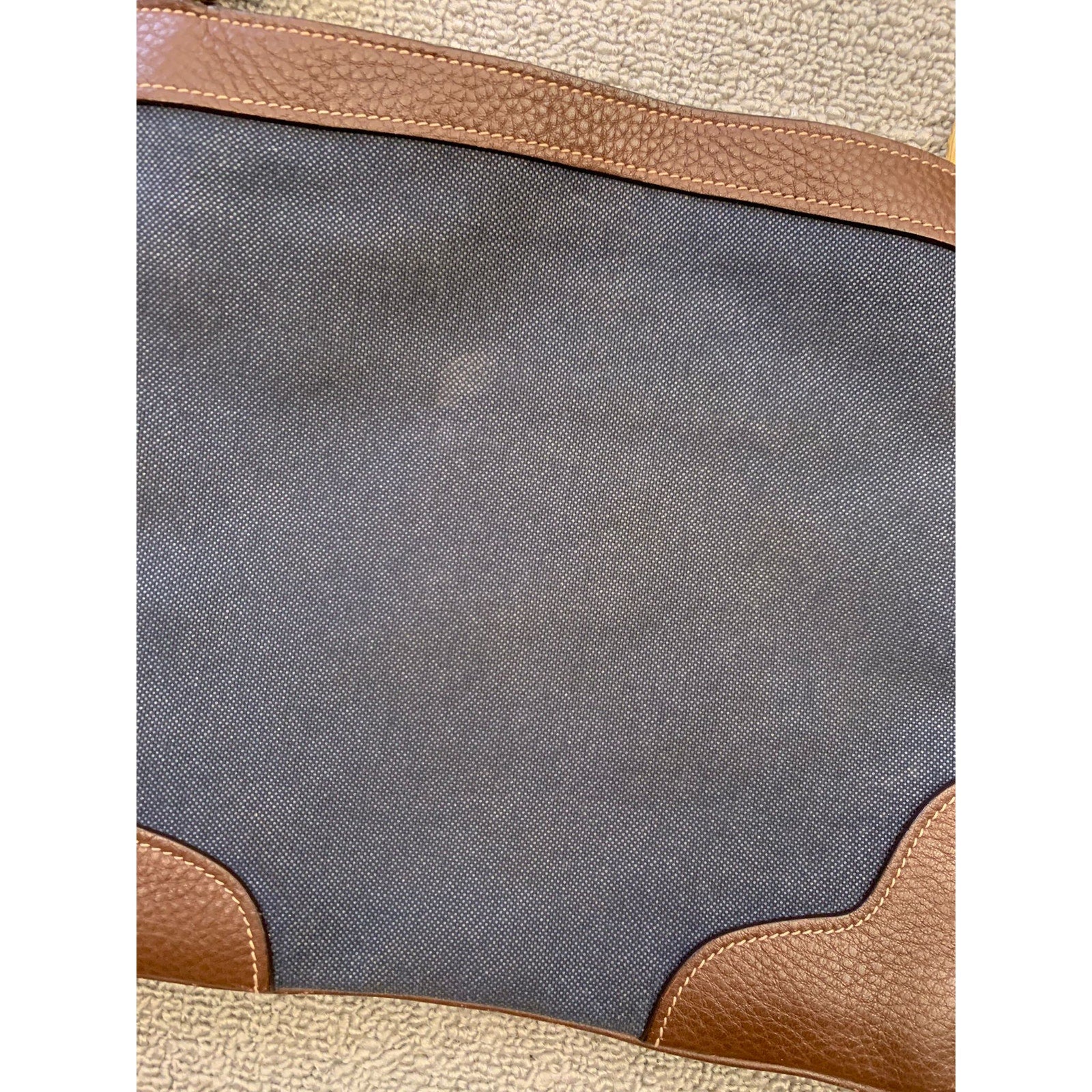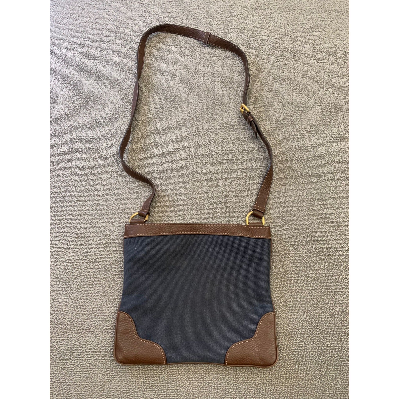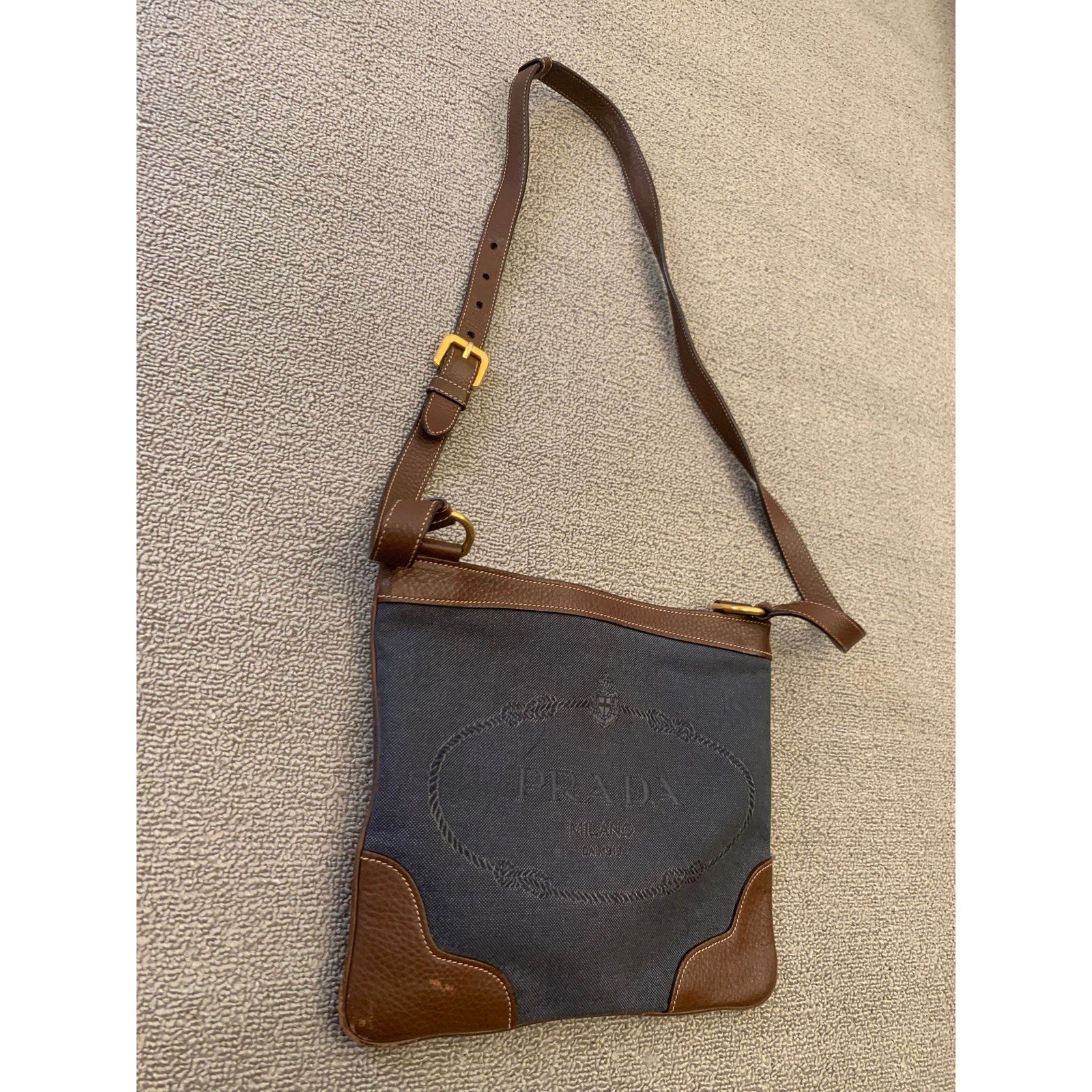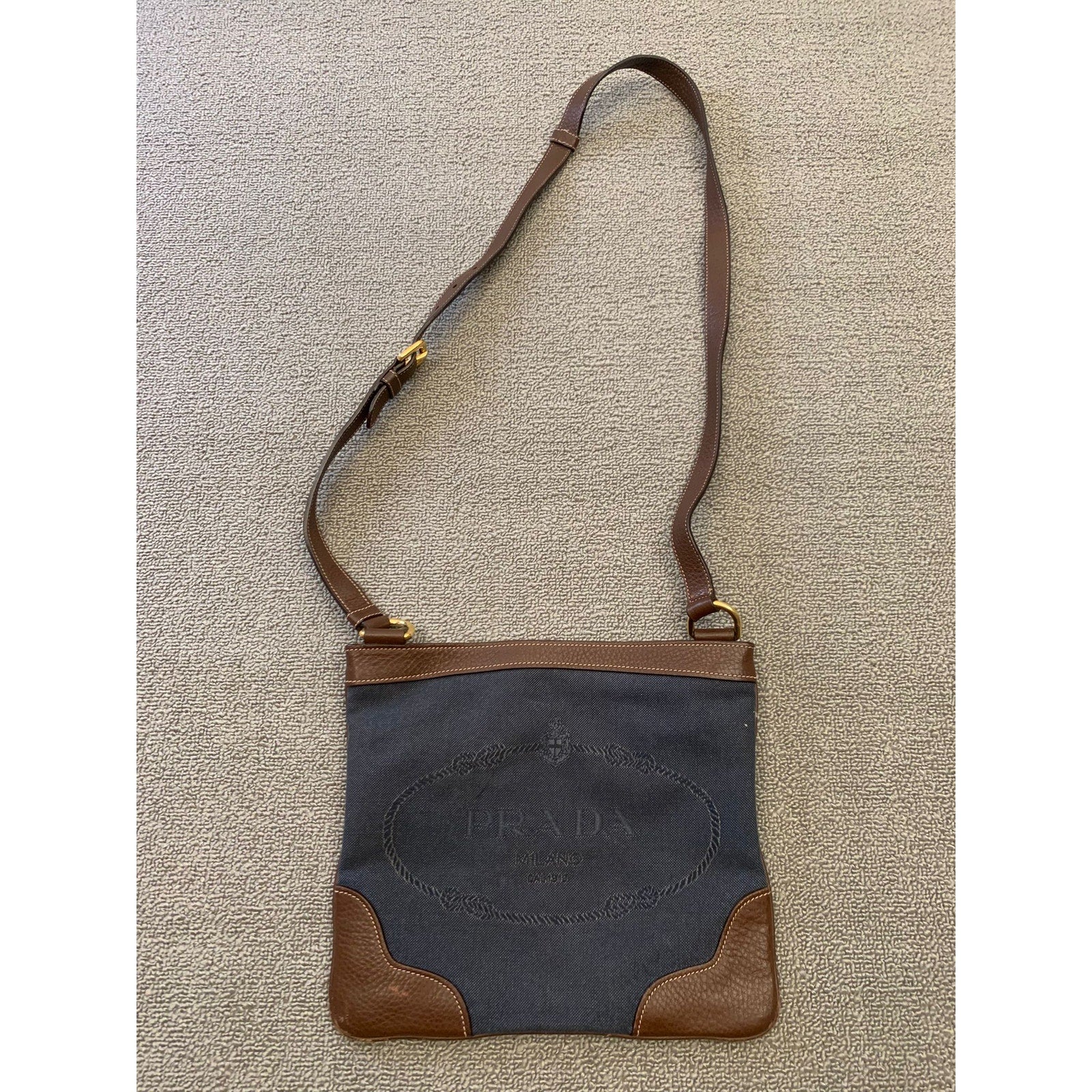A sleek Prada crossbody bag, featuring a combination of durable blue canvas and rich brown leather trim. Crafted with an adjustable leather shoulder strap, gold-tone hardware, and the signature PRADA MILANO label on the front. Inside lining appears clean with an inner zip pocket visible.