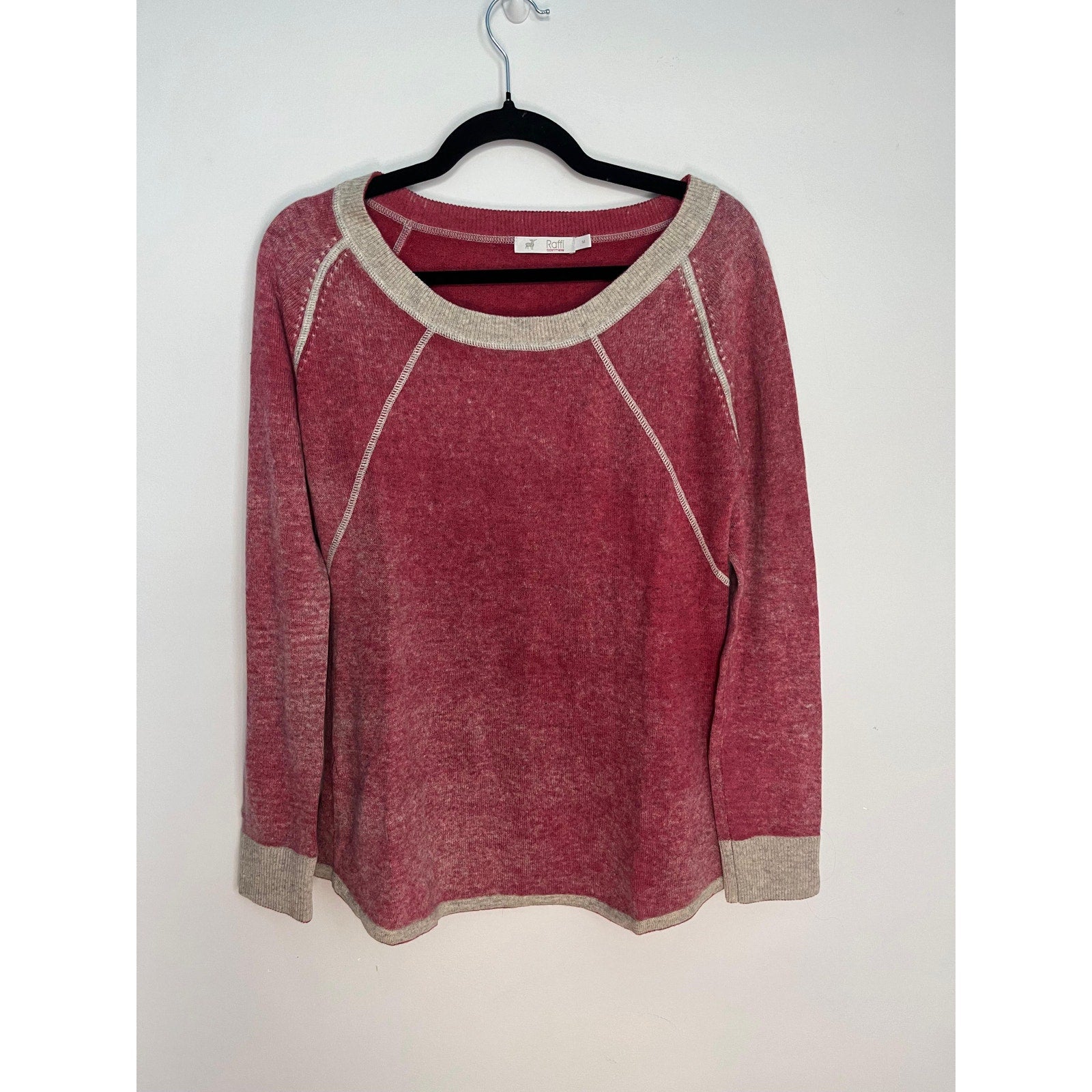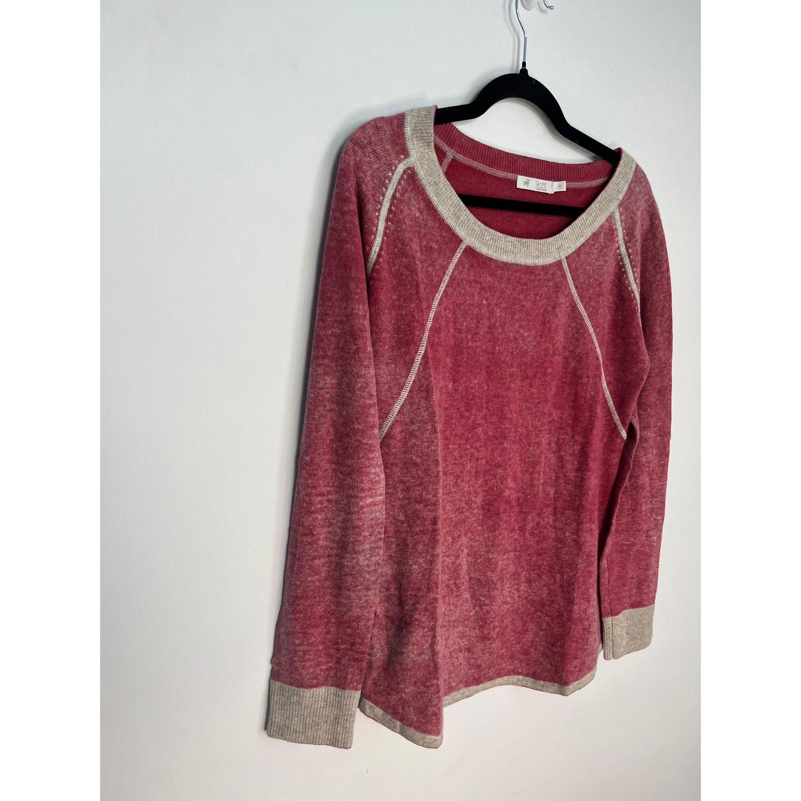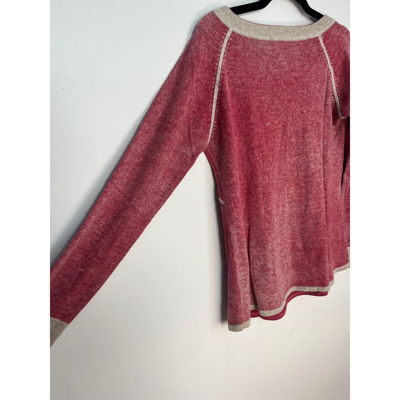 Soft and luxurious cashmere sweater in a washed red-pink tone with contrast beige ribbed trim. Features raglan sleeves and casual styling, perfect for elevated everyday wear.