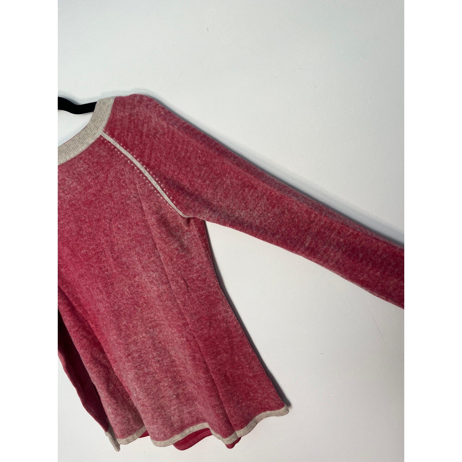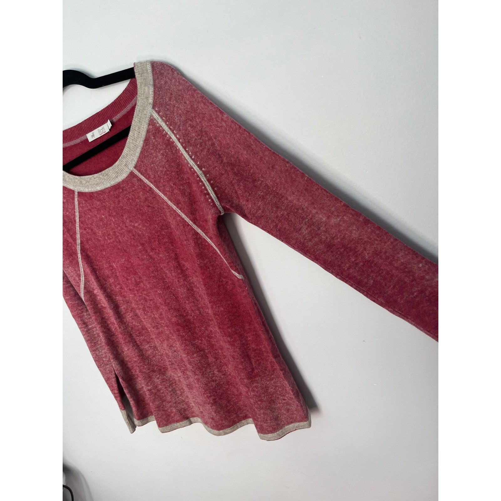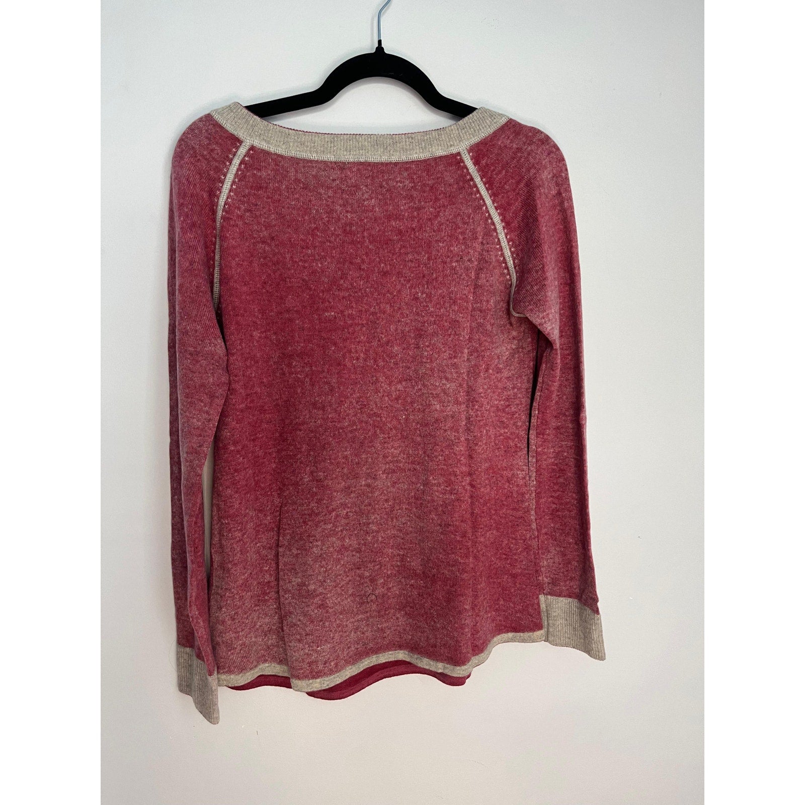 Soft and luxurious cashmere sweater in a washed red-pink tone with contrast beige ribbed trim. Features raglan sleeves and casual styling, perfect for elevated everyday wear.