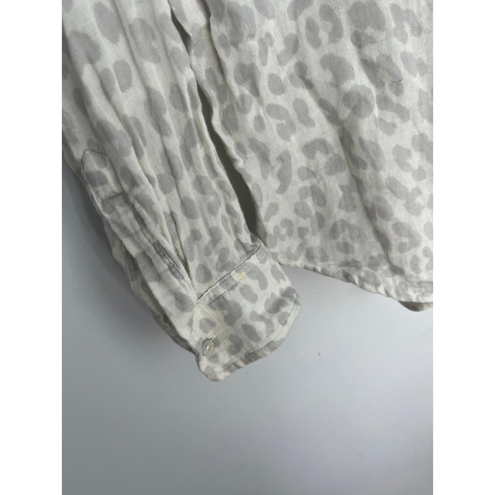 Lightweight long sleeve button-up shirt with a tonal gray and cream leopard print. Features a front chest pocket and relaxed drape fit.