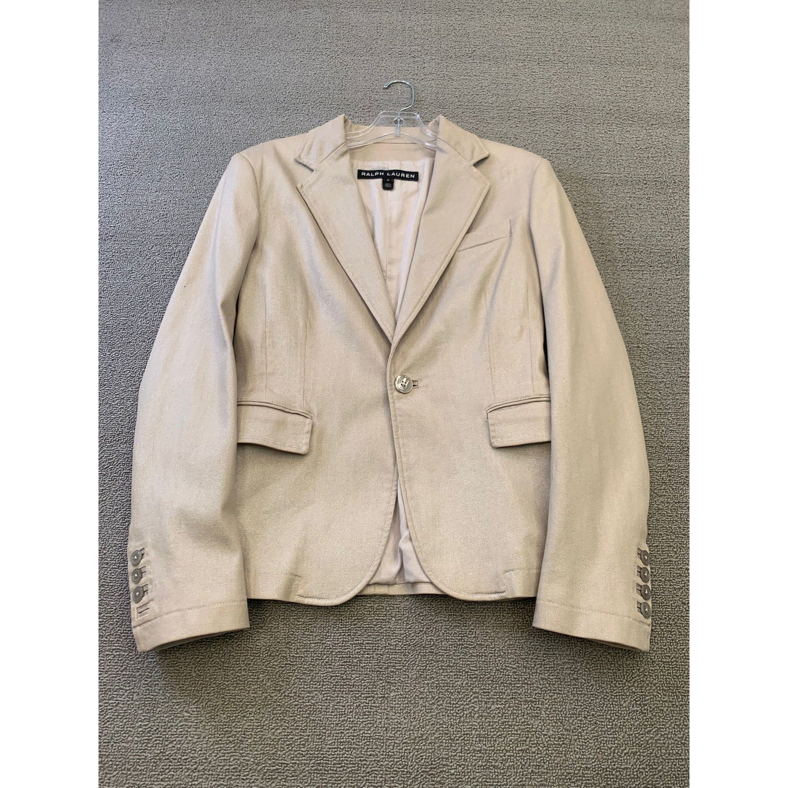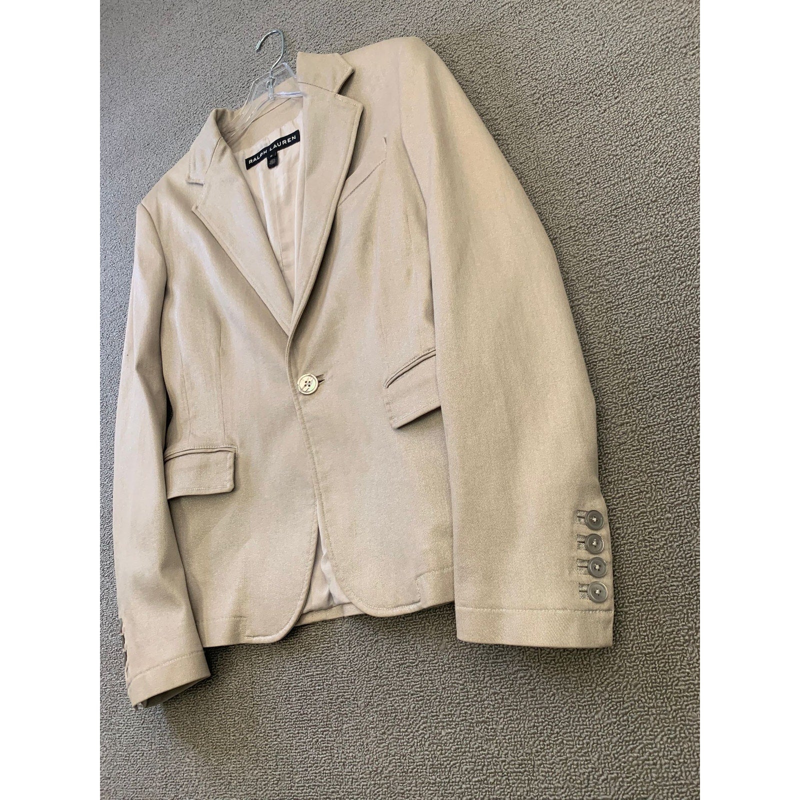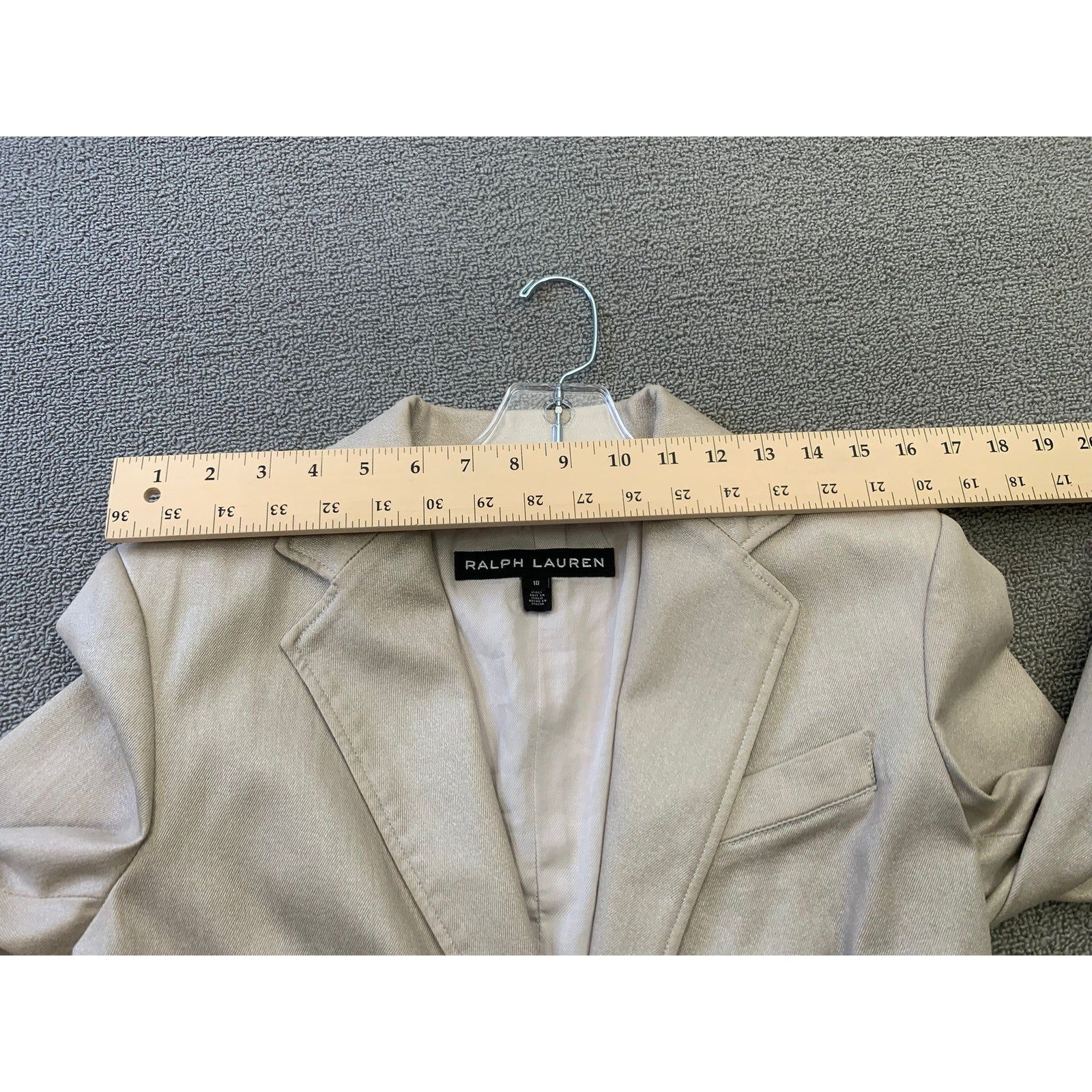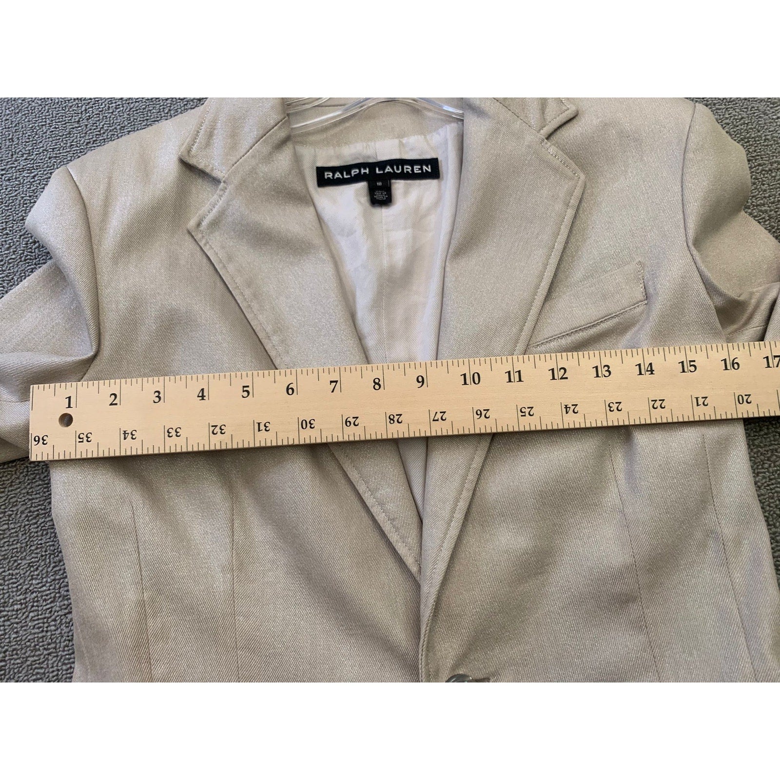 A tailored women’s Ralph Lauren single‑button blazer in size 10, crafted in Italy in a neutral beige tone. Features subtle notched lapel, structured shoulders, flap pockets, and lining visible inside—suggesting polished, professional styling.