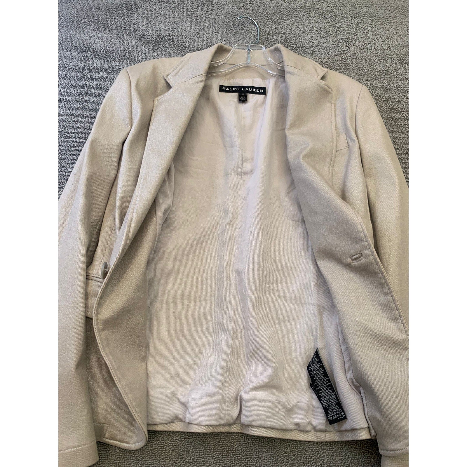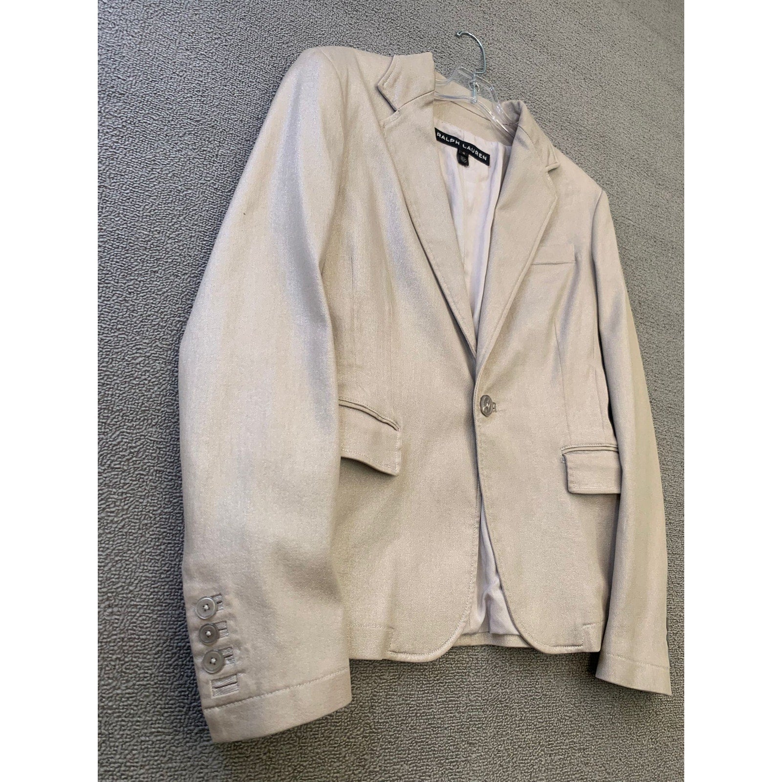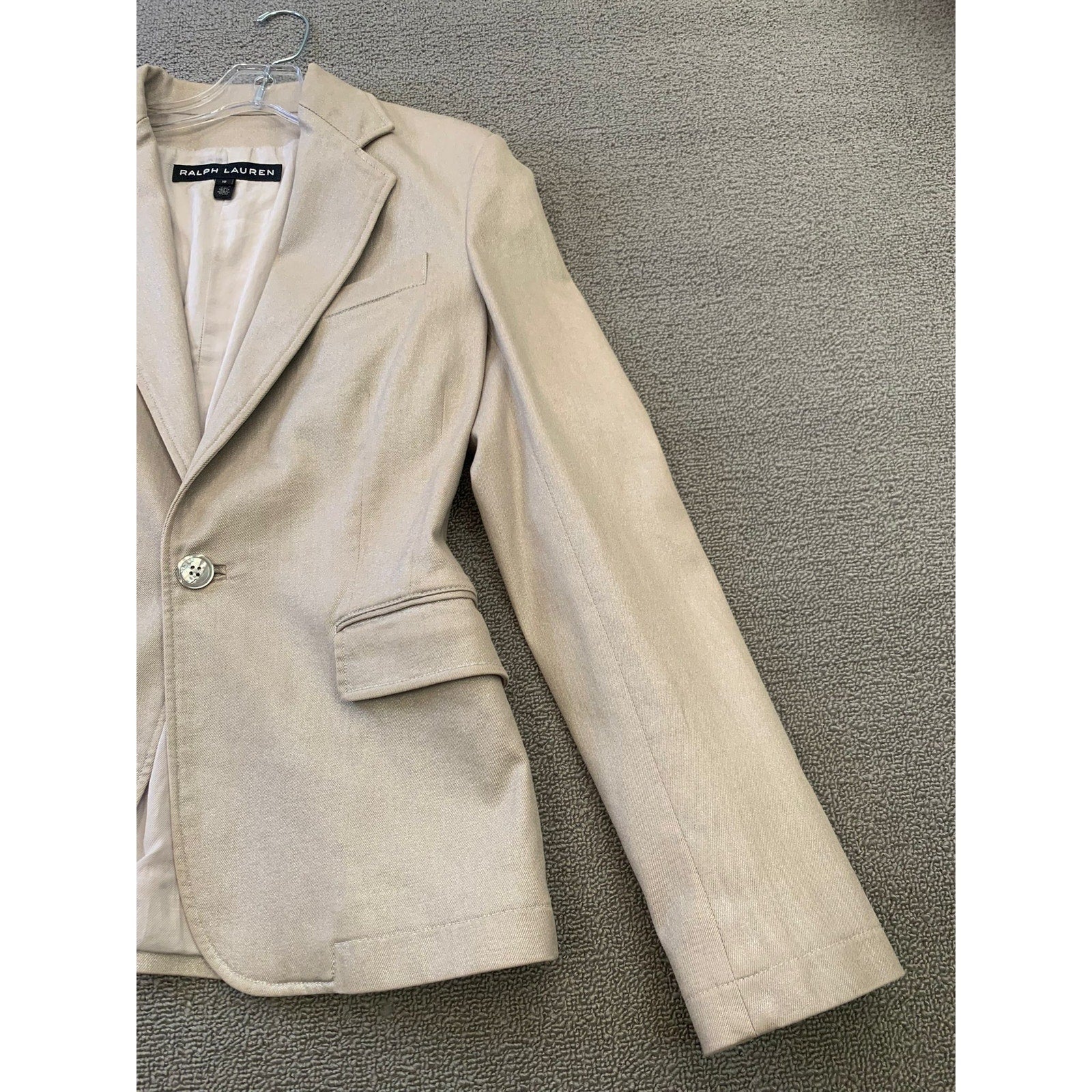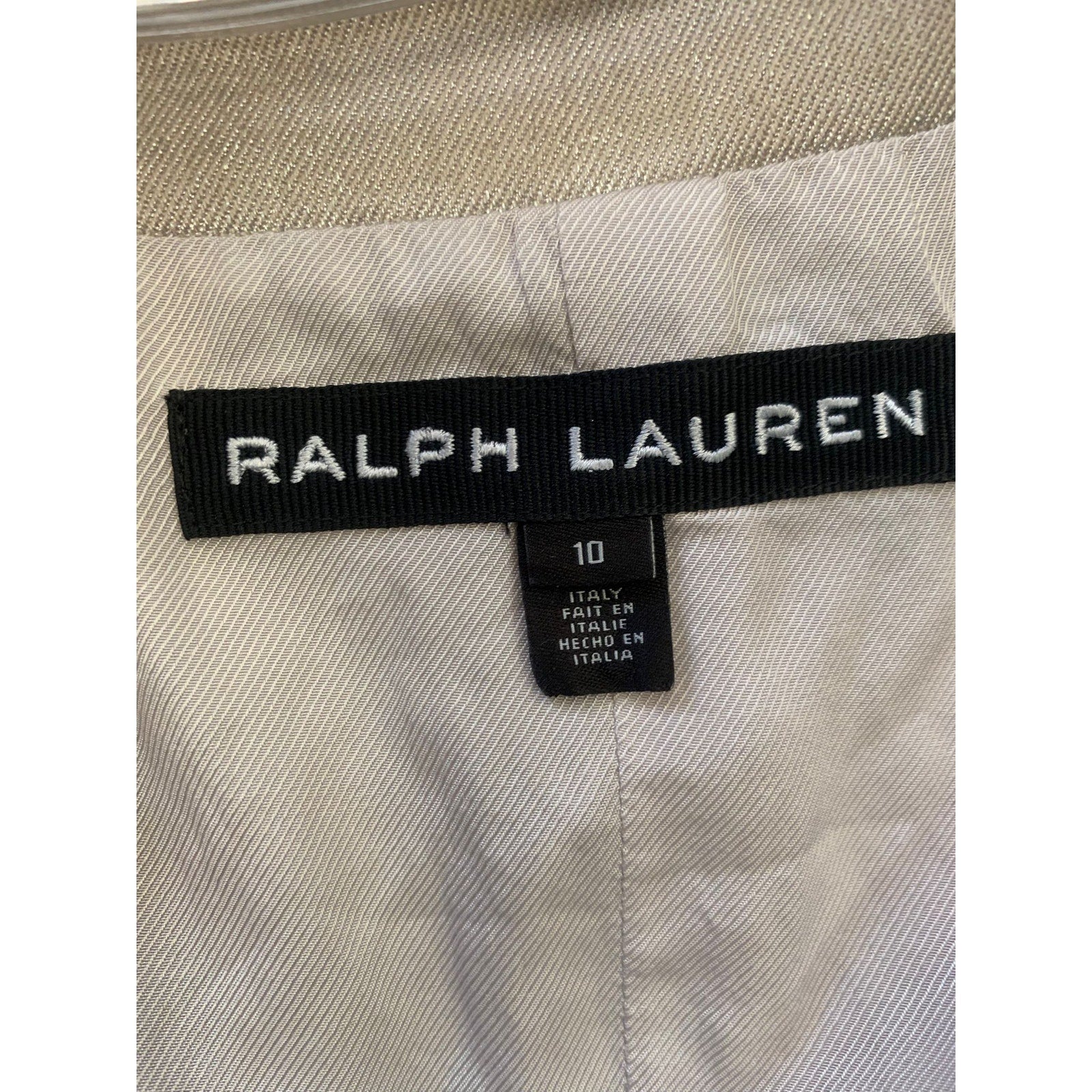 A tailored women’s Ralph Lauren single‑button blazer in size 10, crafted in Italy in a neutral beige tone. Features subtle notched lapel, structured shoulders, flap pockets, and lining visible inside—suggesting polished, professional styling.