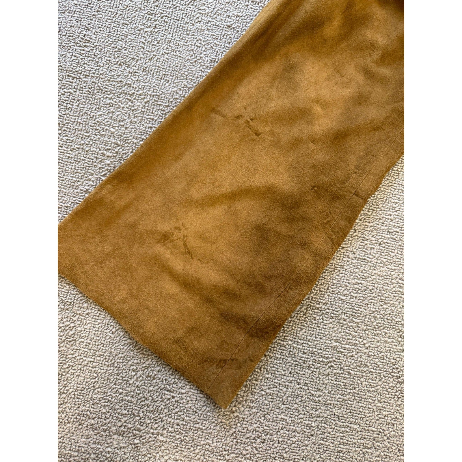 Rich brown suede (likely lambskin) flare-leg trousers by Ralph Lauren, fully lined with a classic mid-rise cut and subtle front seam details. Featuring a wide-leg silhouette and clean cuff hem, these evoke ’70s Western-inspired sophistication.