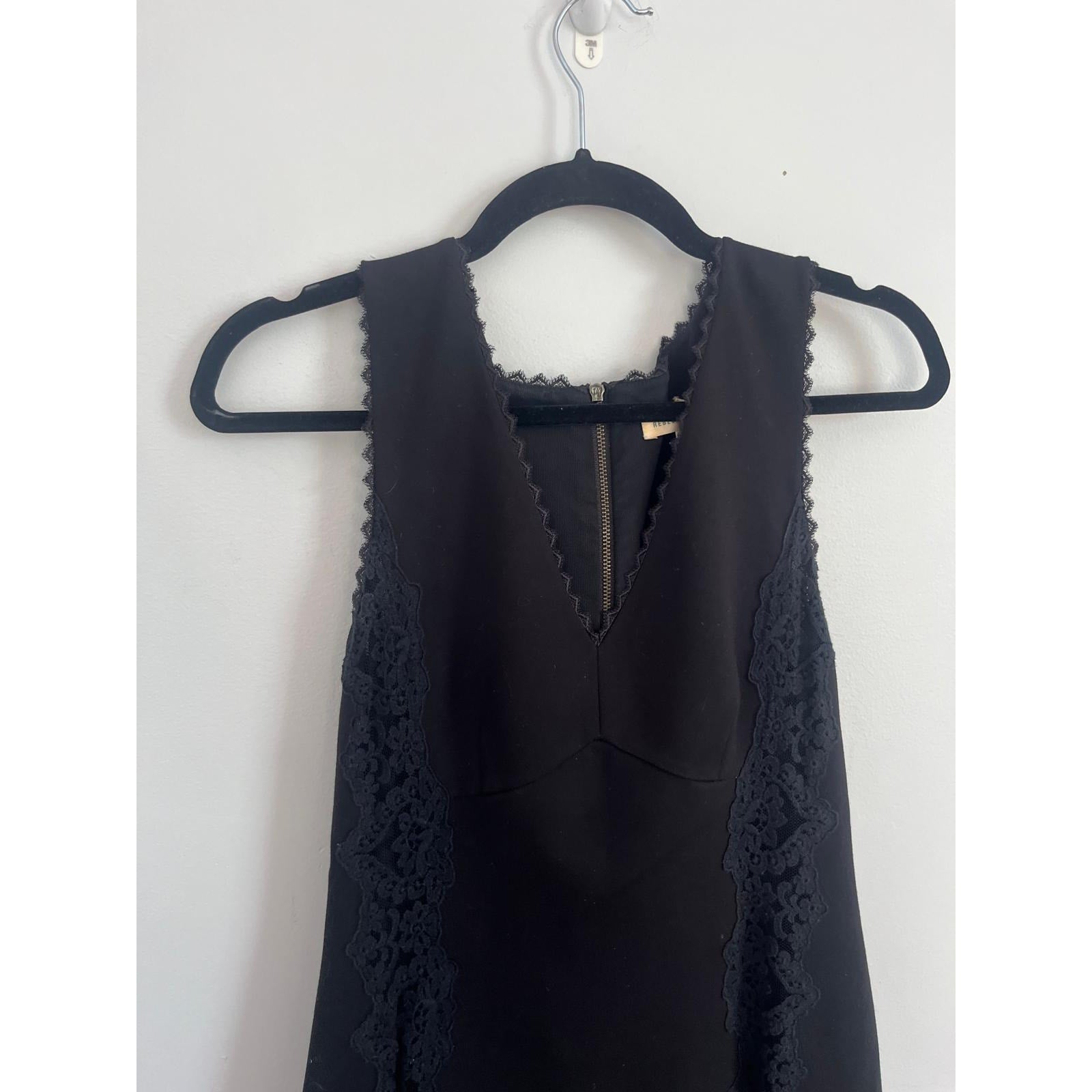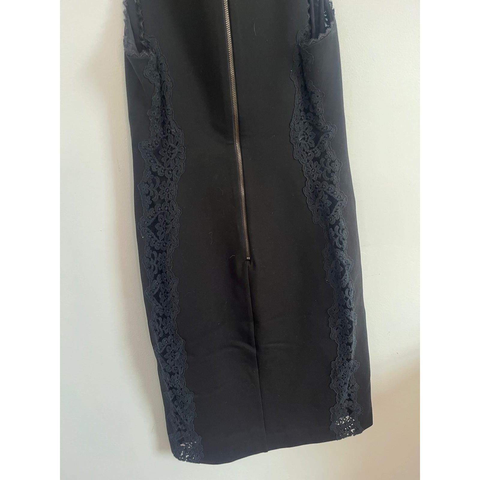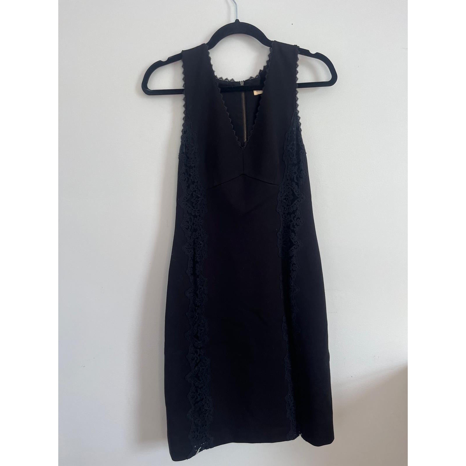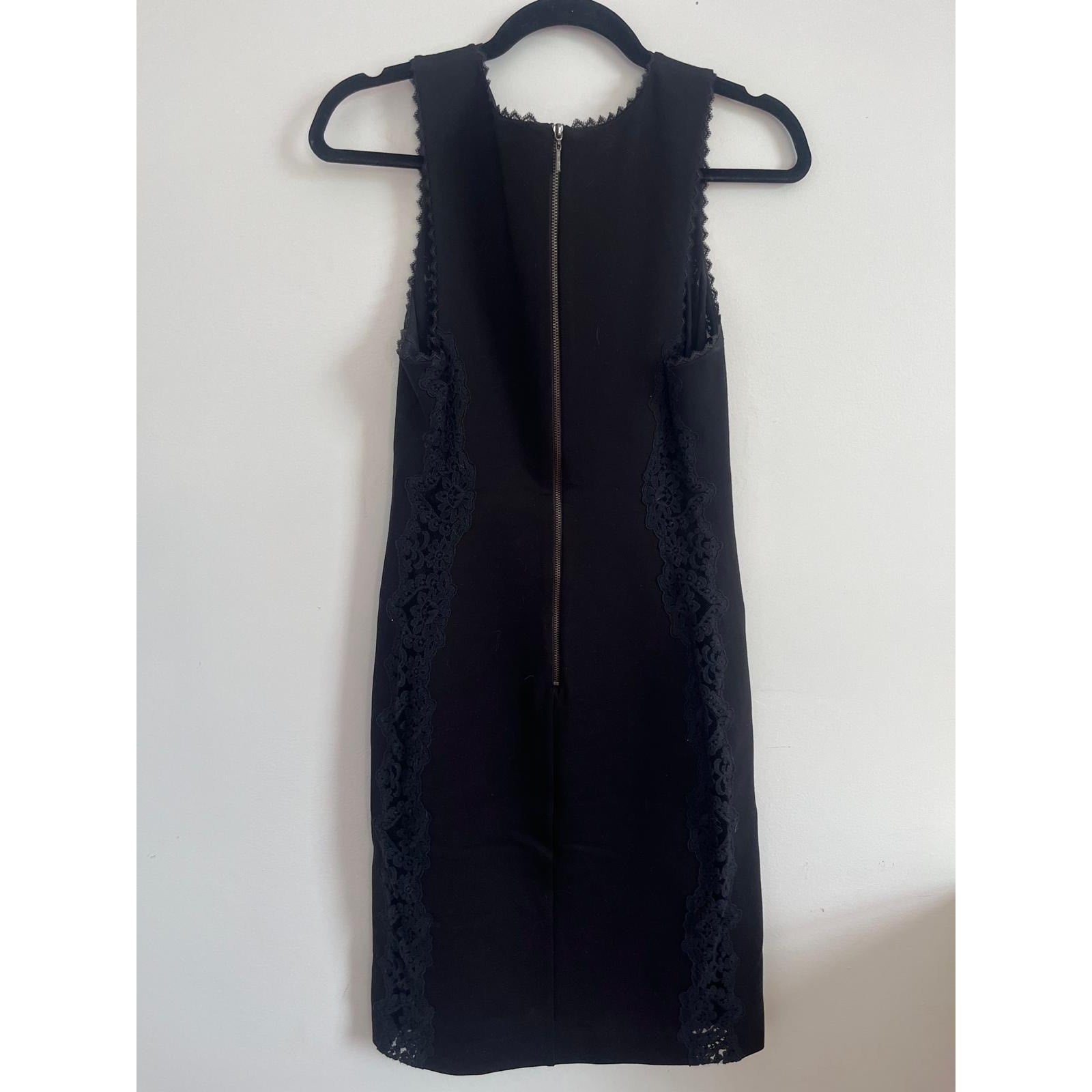 Elegant sleeveless mini dress with V-neckline and lace trim detail along sides and neckline. Classic black fabric with hidden back zipper, ideal for cocktail or evening events.