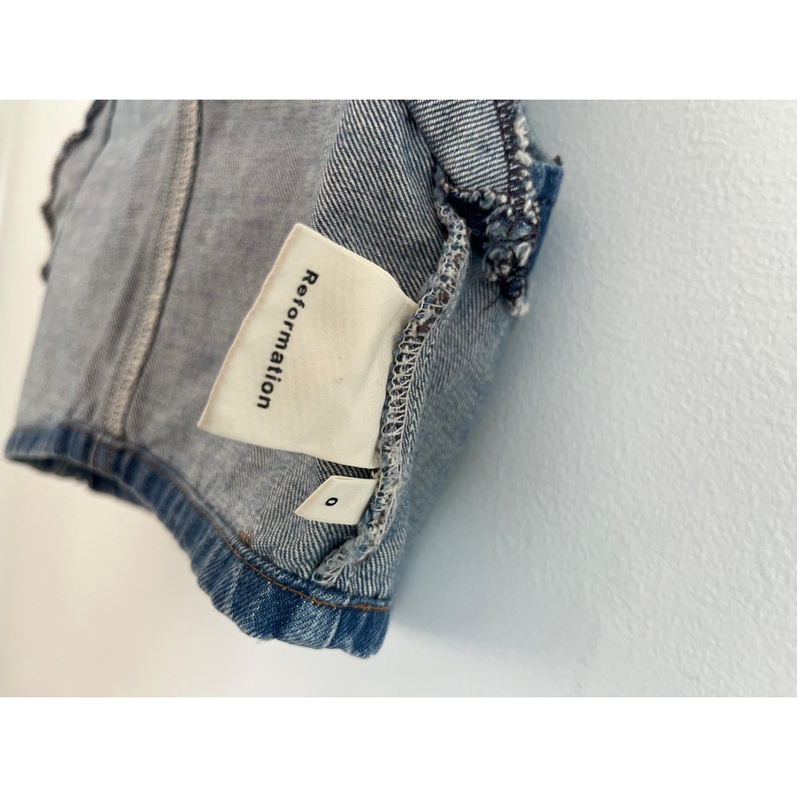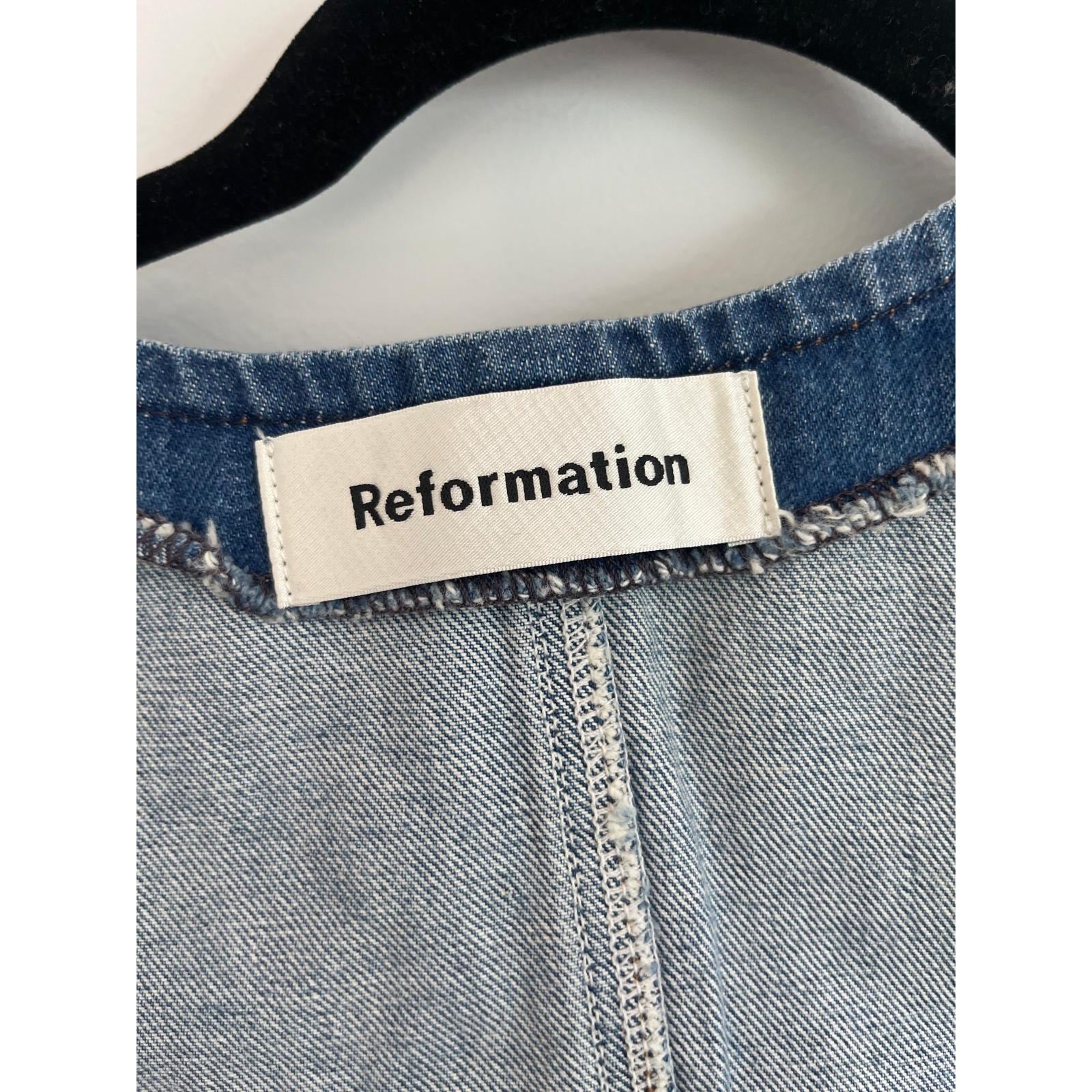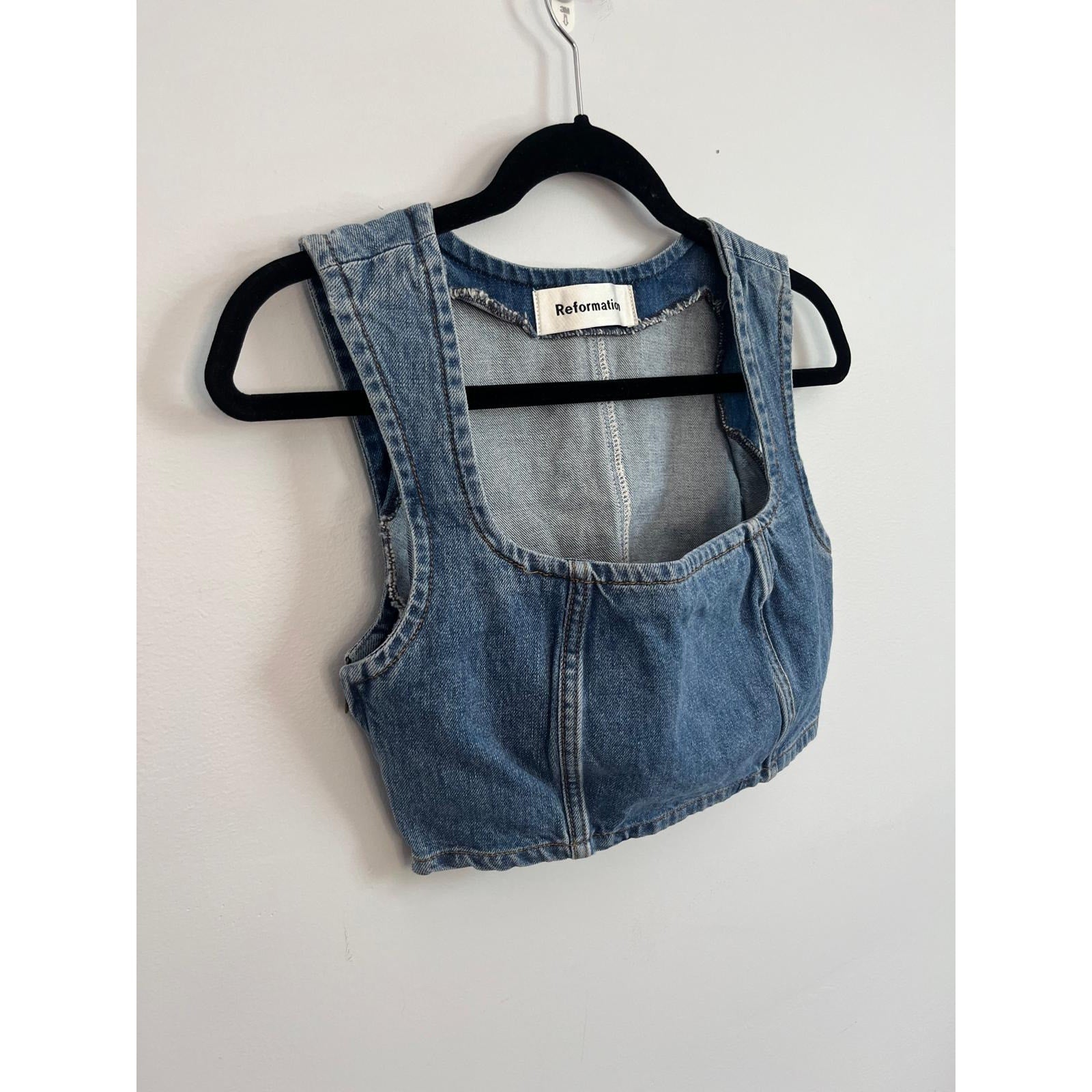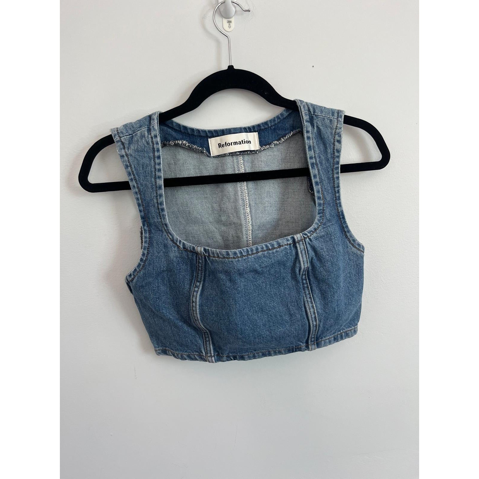 Stylish Reformation denim crop top with a flattering square neckline and structured corset-style panel seams. Fitted silhouette in a classic medium-wash blue, perfect for layering or wearing solo.