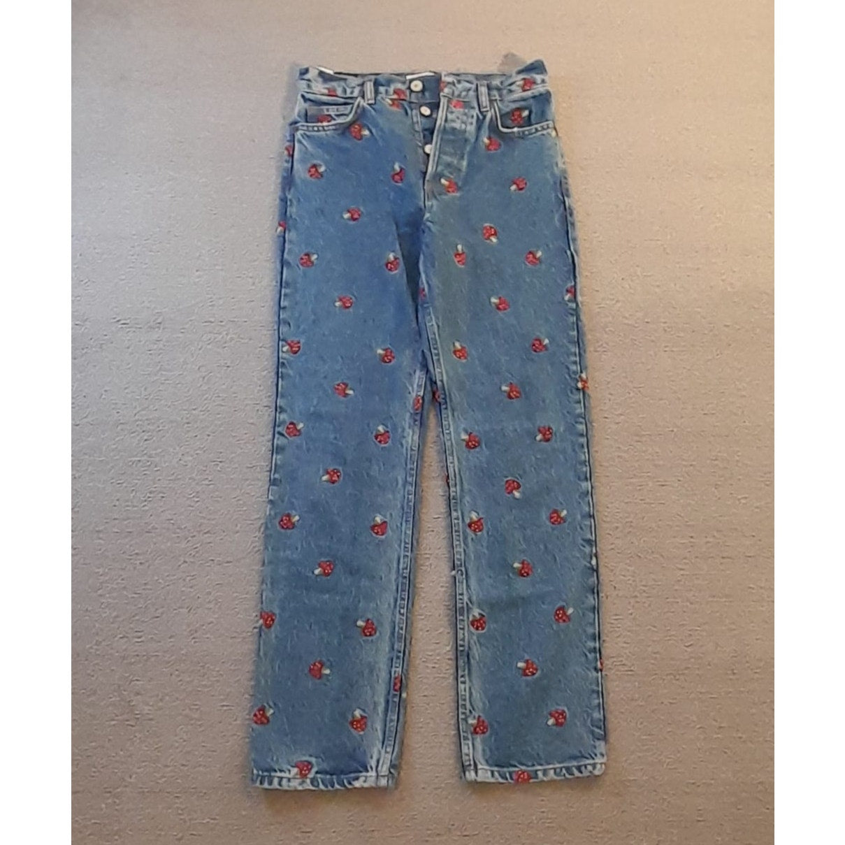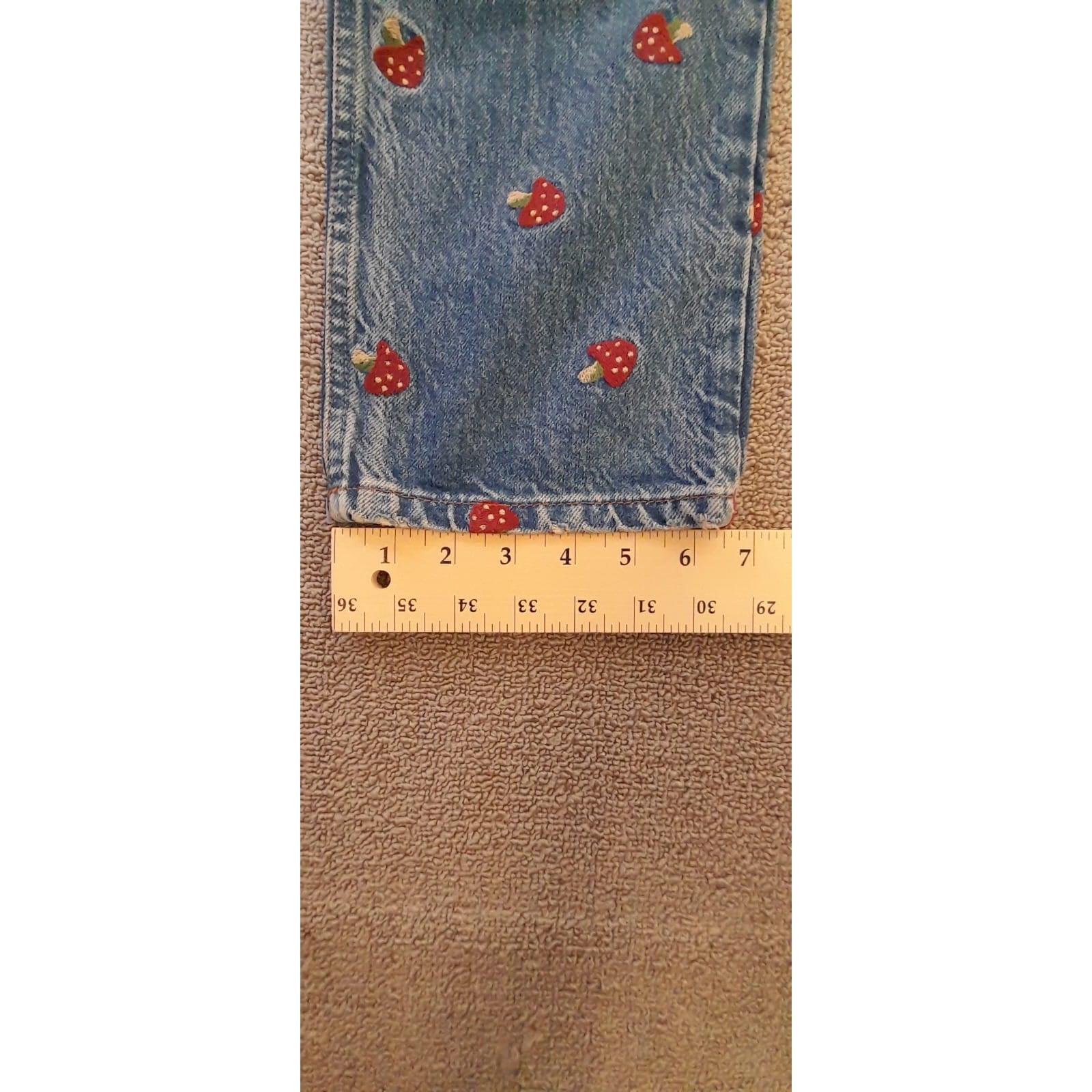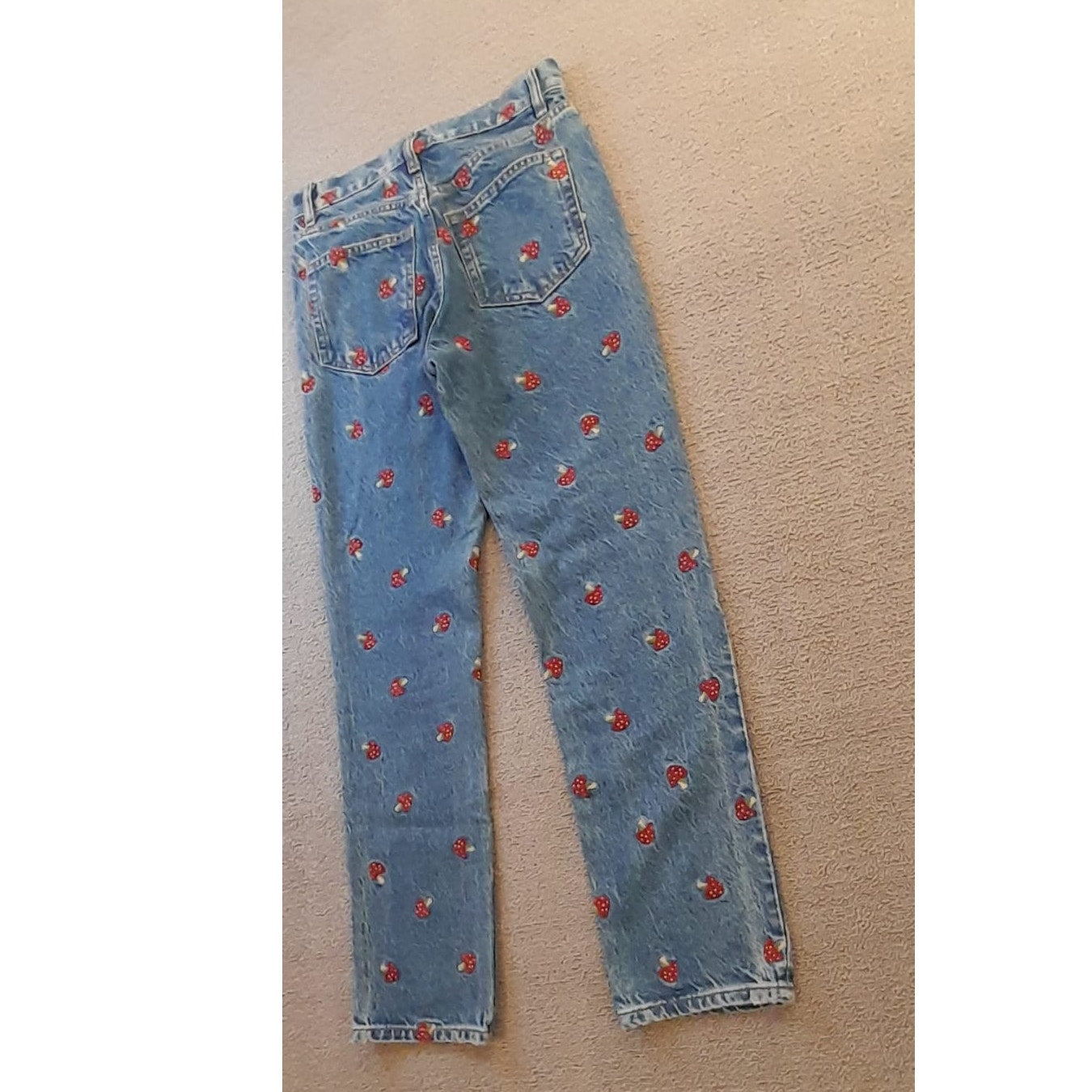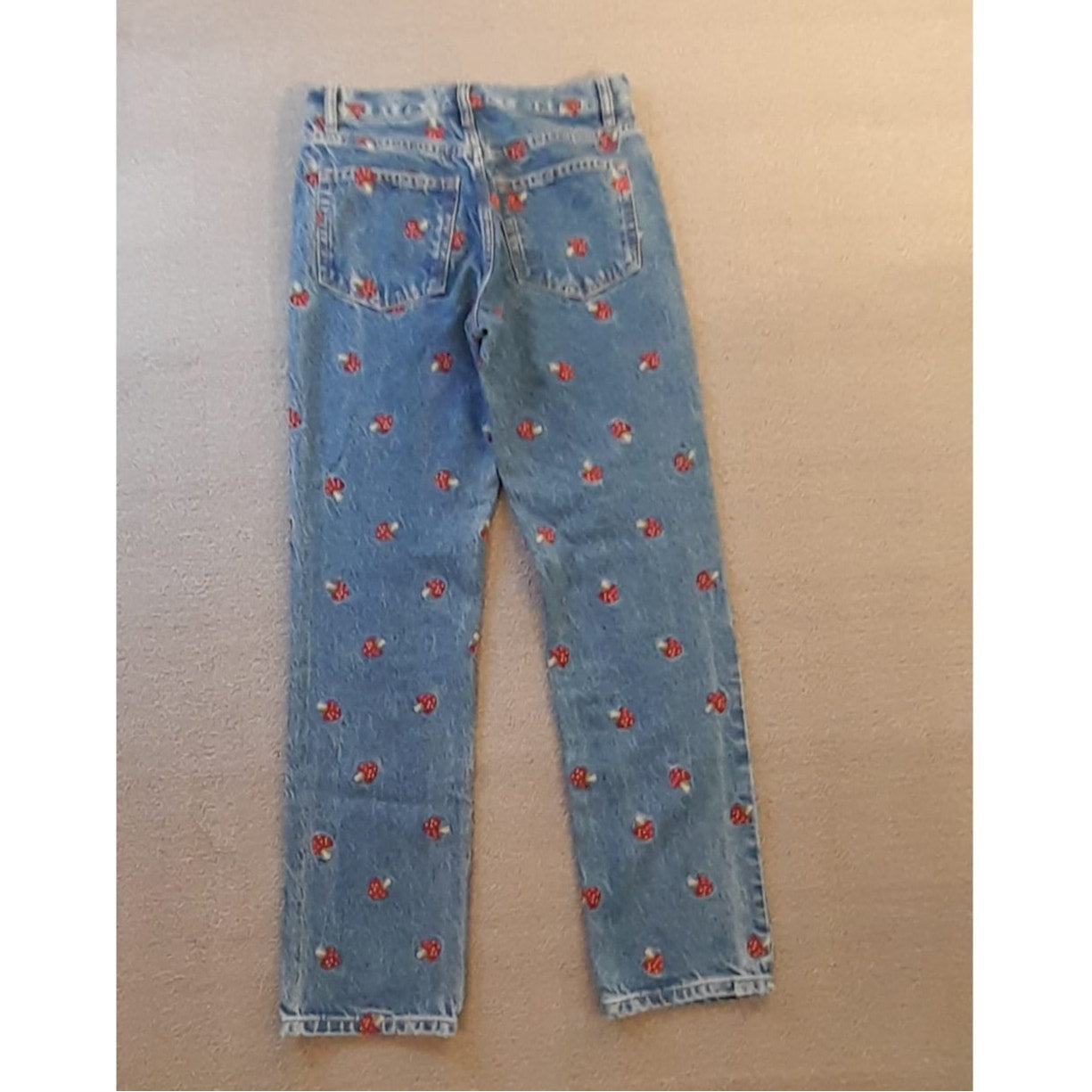 Fun and playful Reformation mushroom-print straight-leg jeans in blue denim with embroidered red mushroom—whimsical, vintage-inspired detailing. Subtly cropped fit ideal for casual, statement-making looks but missing one button.