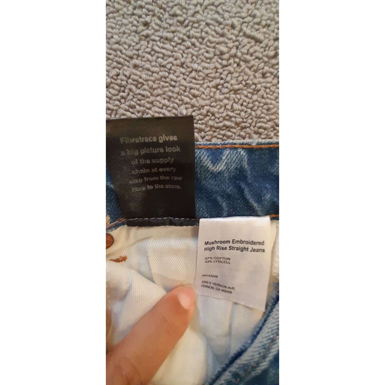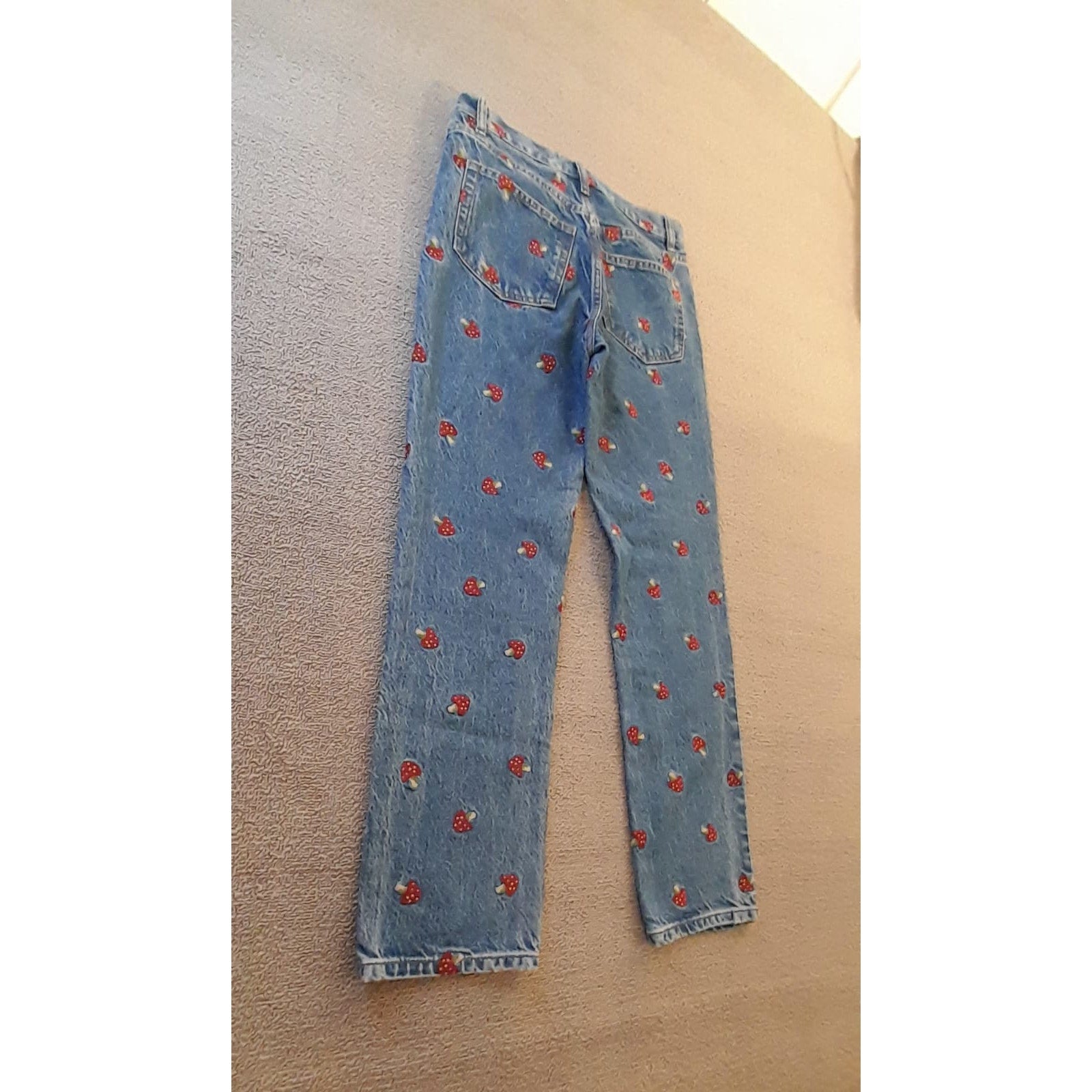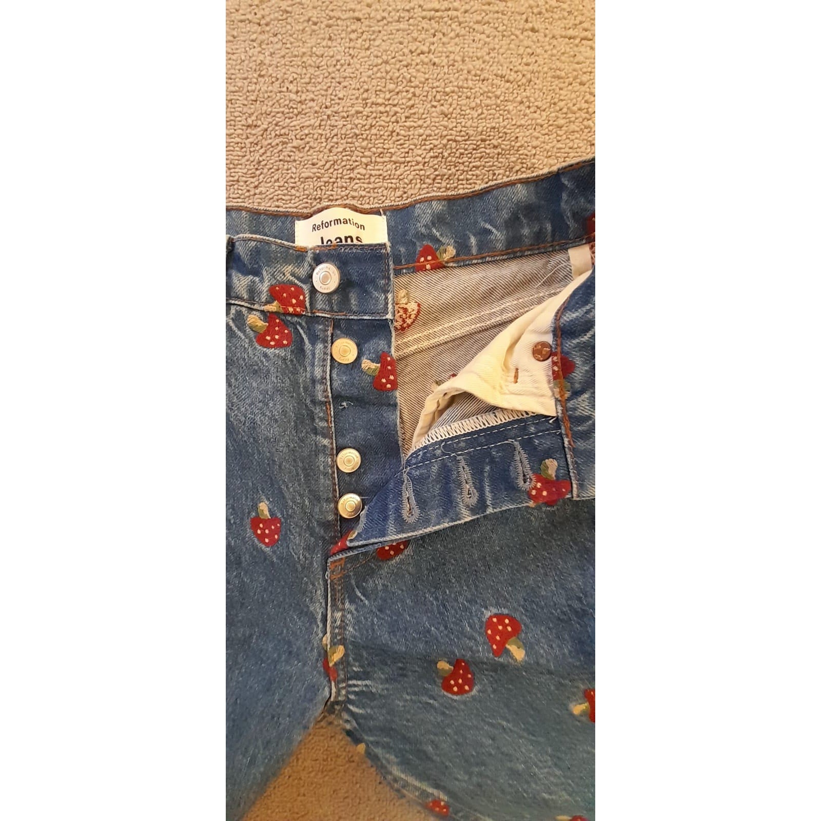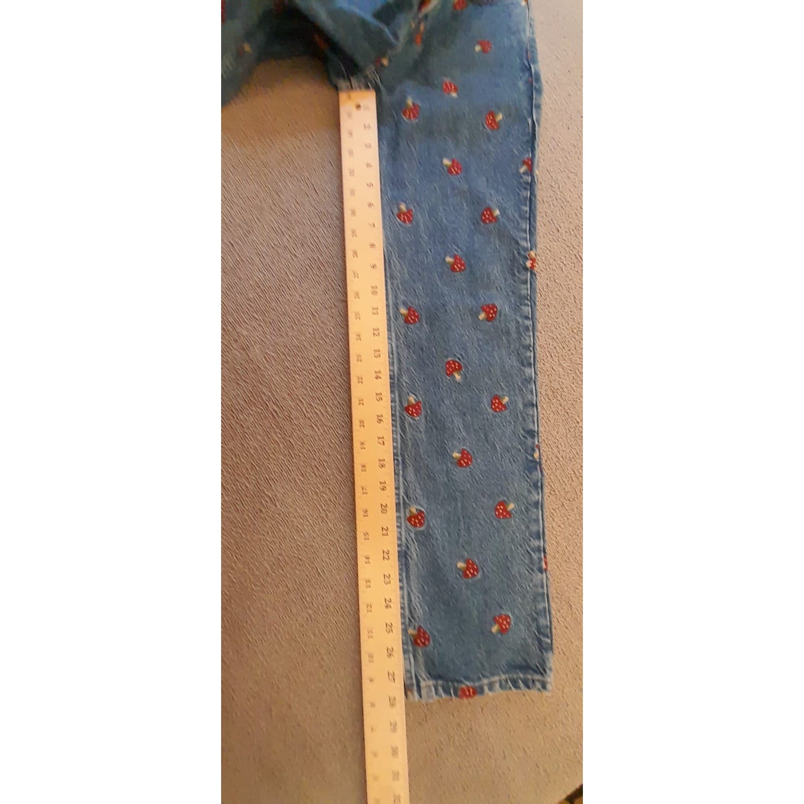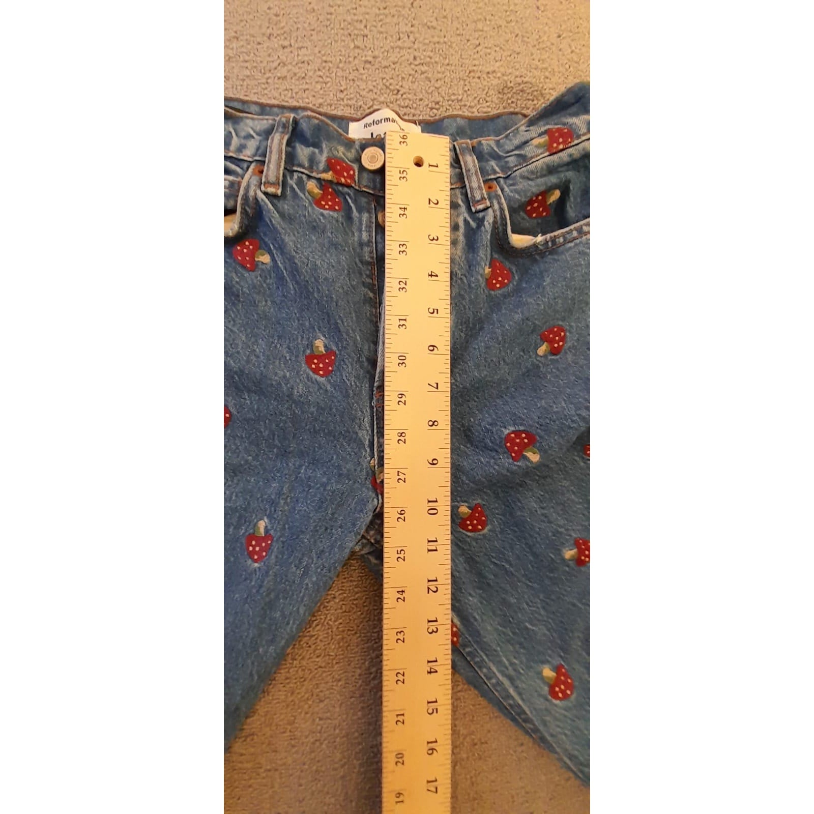 Fun and playful Reformation mushroom-print straight-leg jeans in blue denim with embroidered red mushroom—whimsical, vintage-inspired detailing. Subtly cropped fit ideal for casual, statement-making looks but missing one button.
