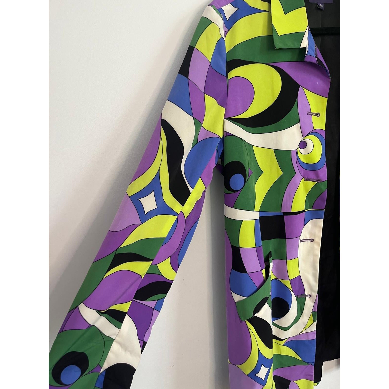 Striking vintage-style blazer featuring a bold geometric psychedelic print in purple, lime, green, cream, blue, and black. Tailored with a classic notch lapel, front button closure, and flap pockets. Fully lined interior.