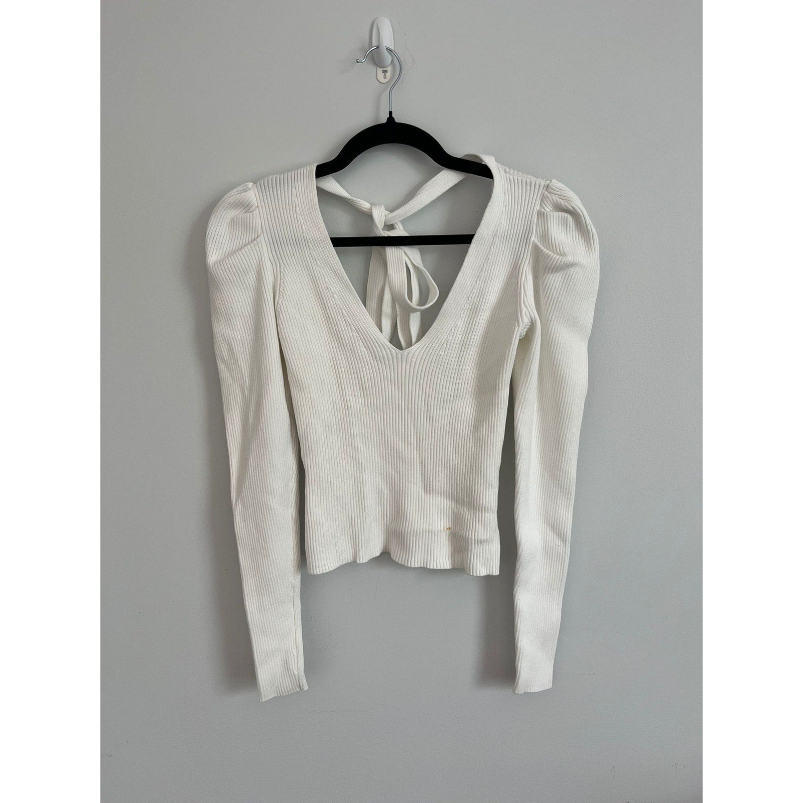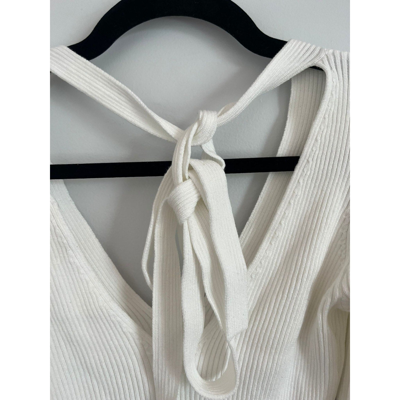 Ronny Kobo women’s ribbed long sleeve top in size Small. Features a deep v neckline with structured seams, puff shoulder sleeves, and an open back with self-tie straps for added detail. Made of a thick stretch knit fabric that hugs the body comfortably.
