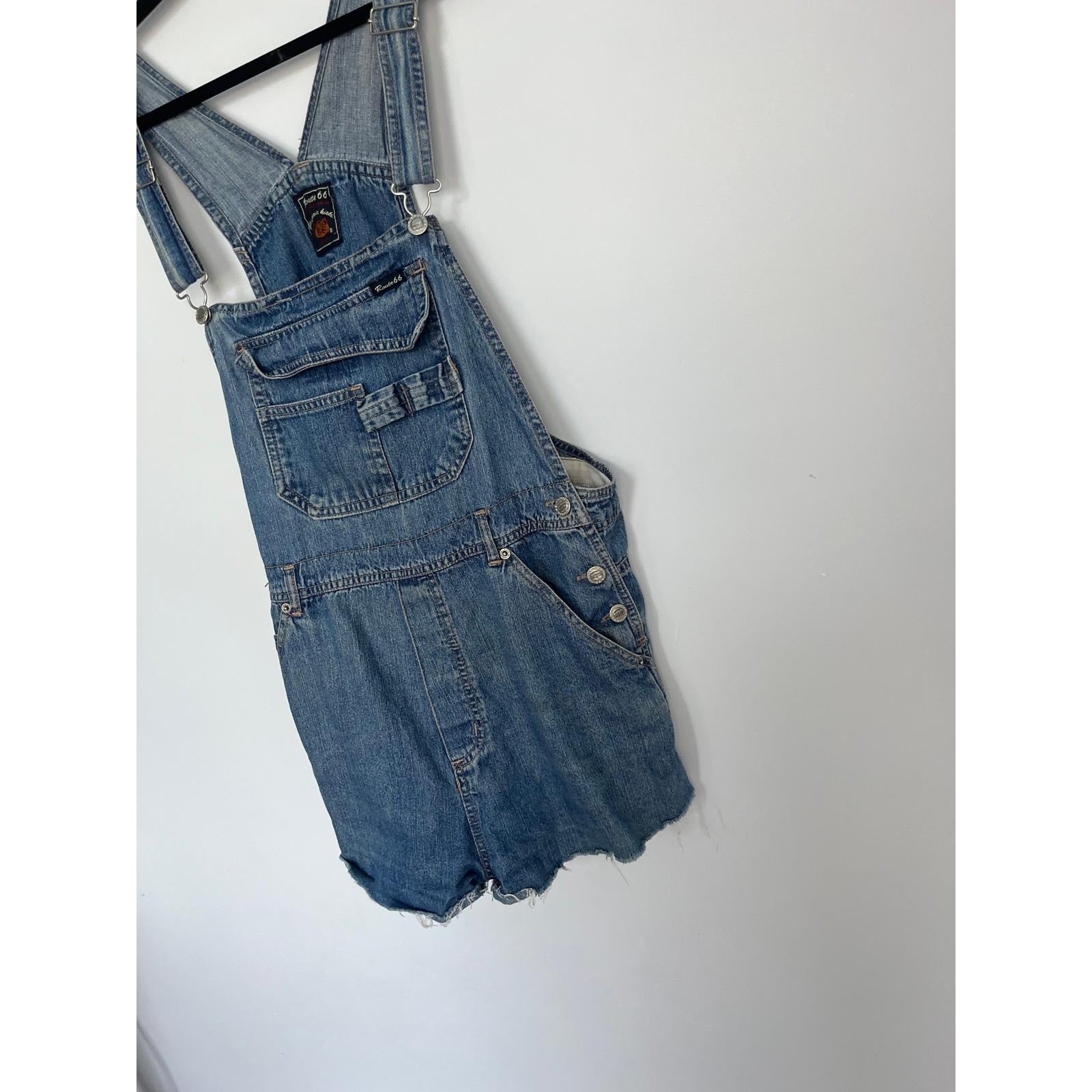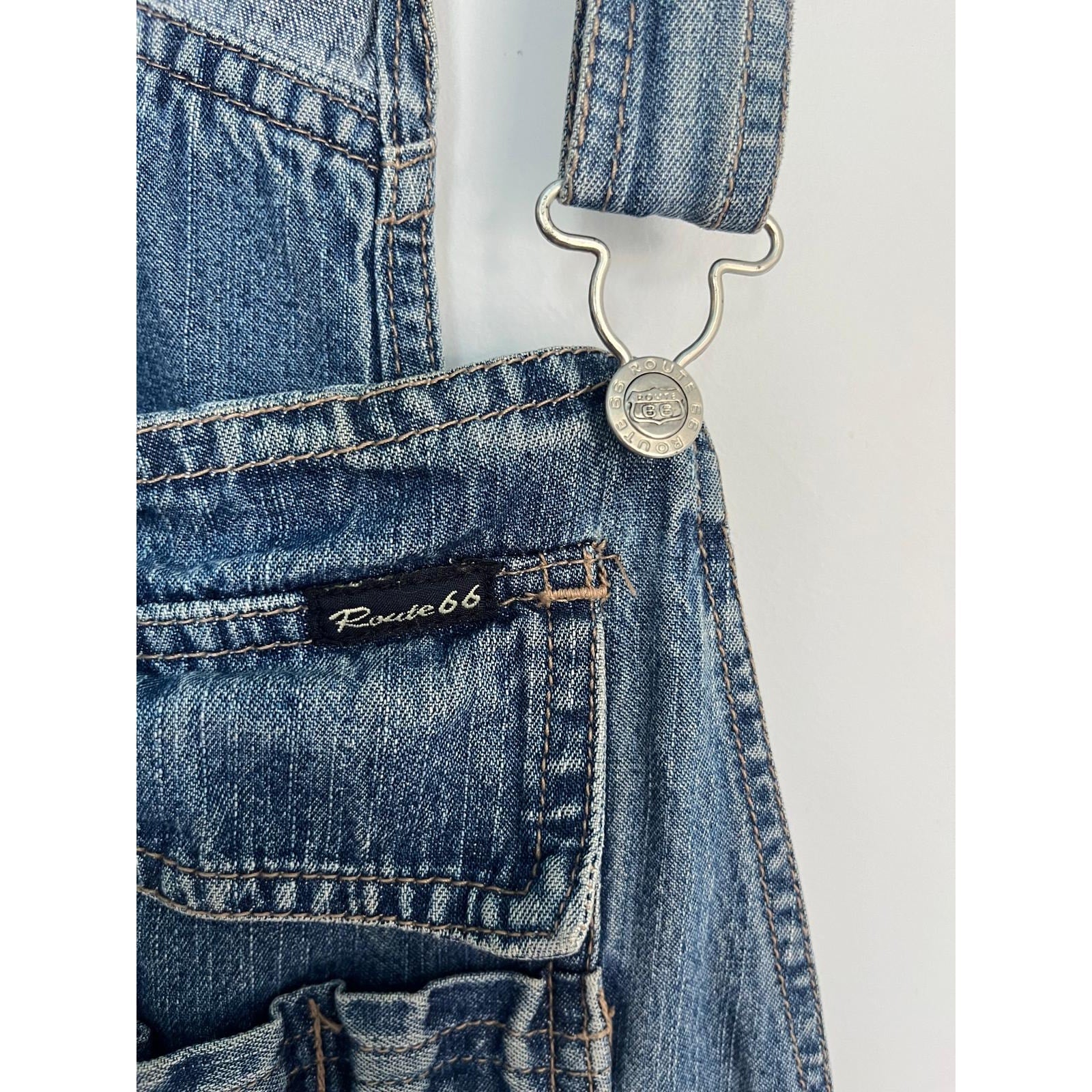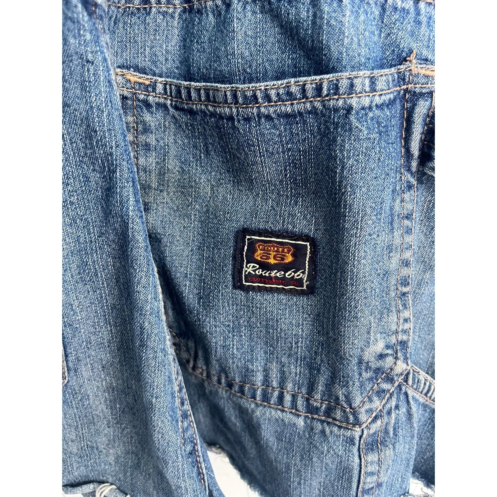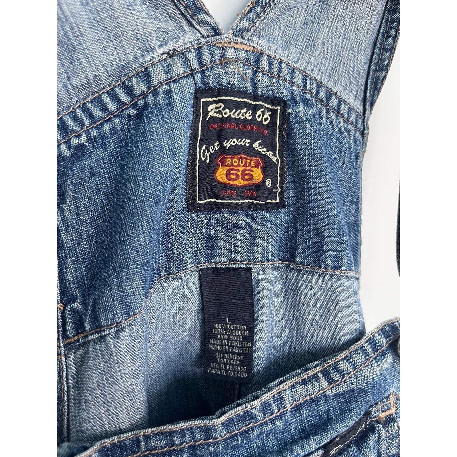 Vintage Route 66 denim overalls with raw hem shorts and multi-pocket utility style. Classic carpenter design with adjustable straps and front chest pocket.