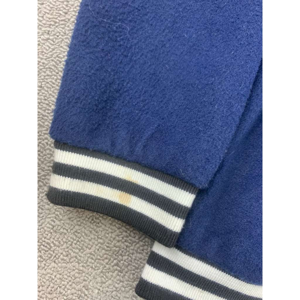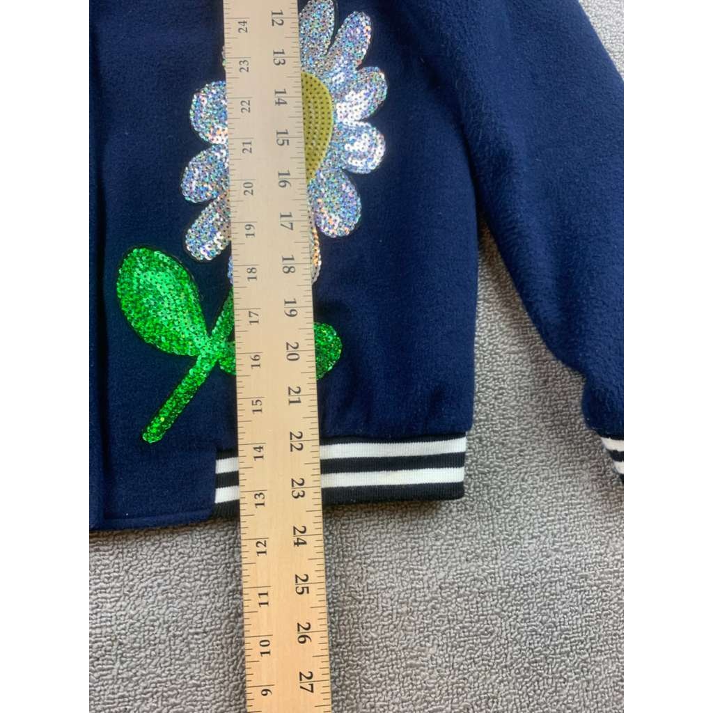 Navy varsity-style bomber with striped rib trim and oversized sequin daisy appliqués at front; snap button front and fully lined body. Playful streetwear look with shimmer details—great statement layer for festivals or night out.