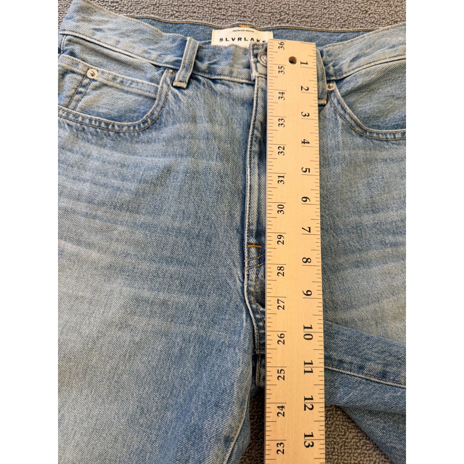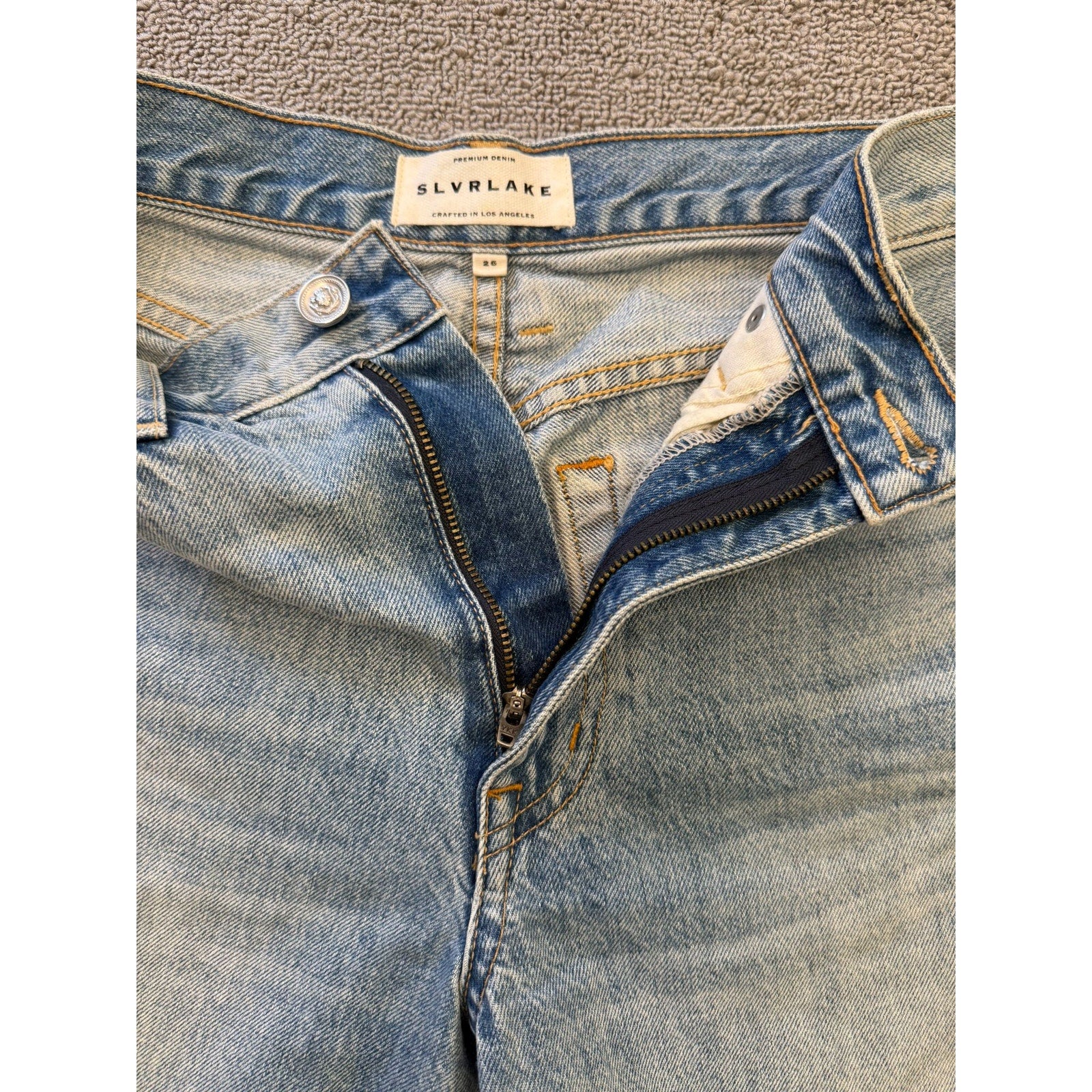 Features light wash blue denim with subtle fading, five-pocket style, zip fly with button closure, and a relaxed longer fit above the knee. High-quality construction with a modern vintage-inspired look.