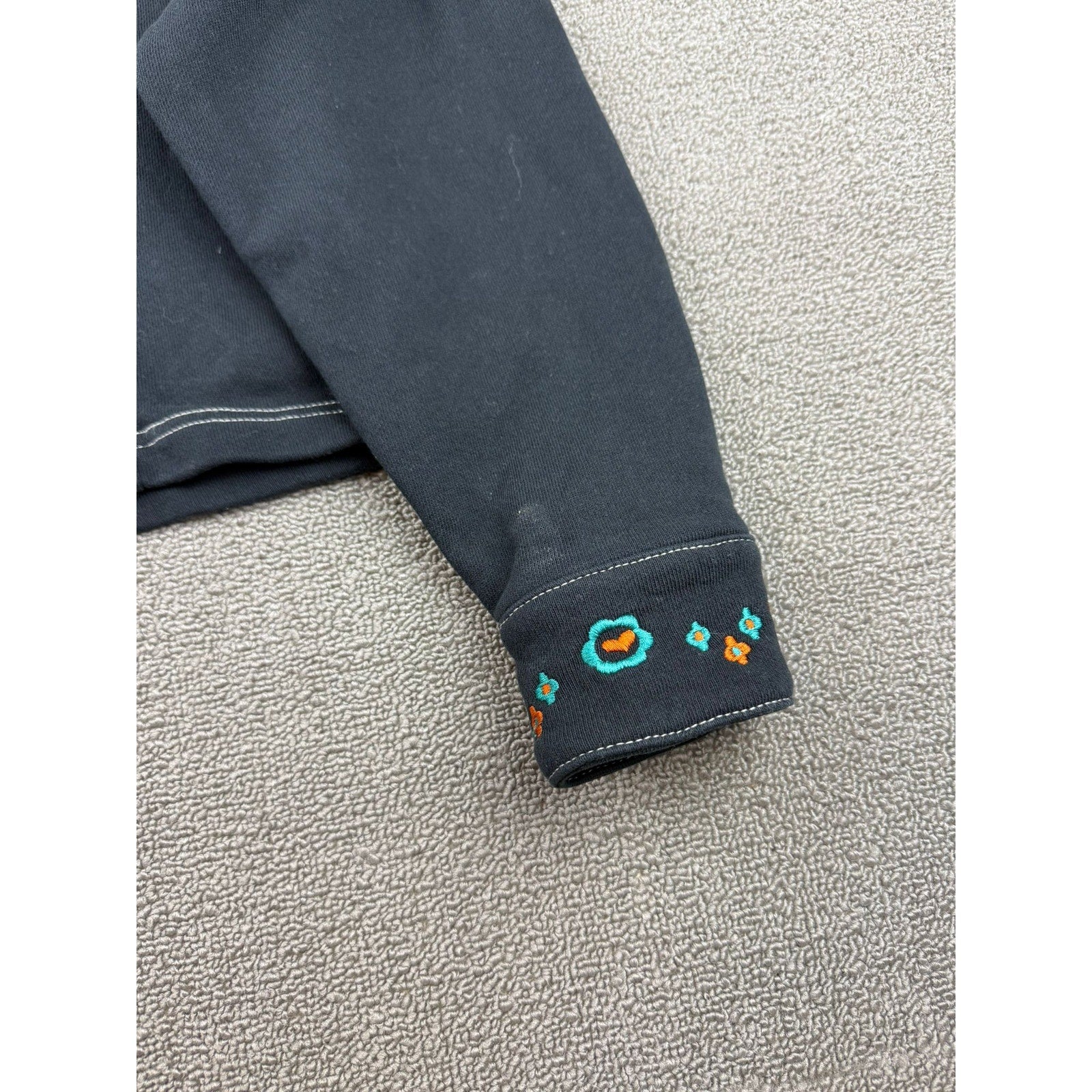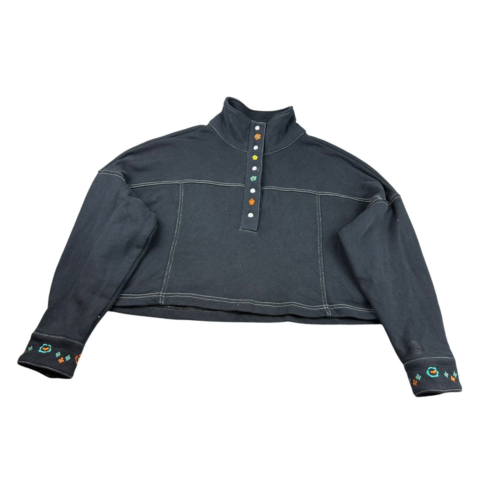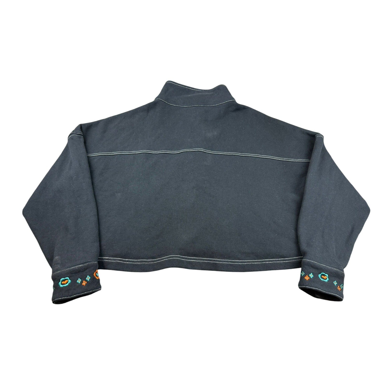 A relaxed cropped pullover featuring a mock neck and long sleeves in rich black, highlighted by contrast topstitching and whimsical embroidered floral motifs along the half-placket and sleeve cuffs—perfect for casual chic and playful layering.