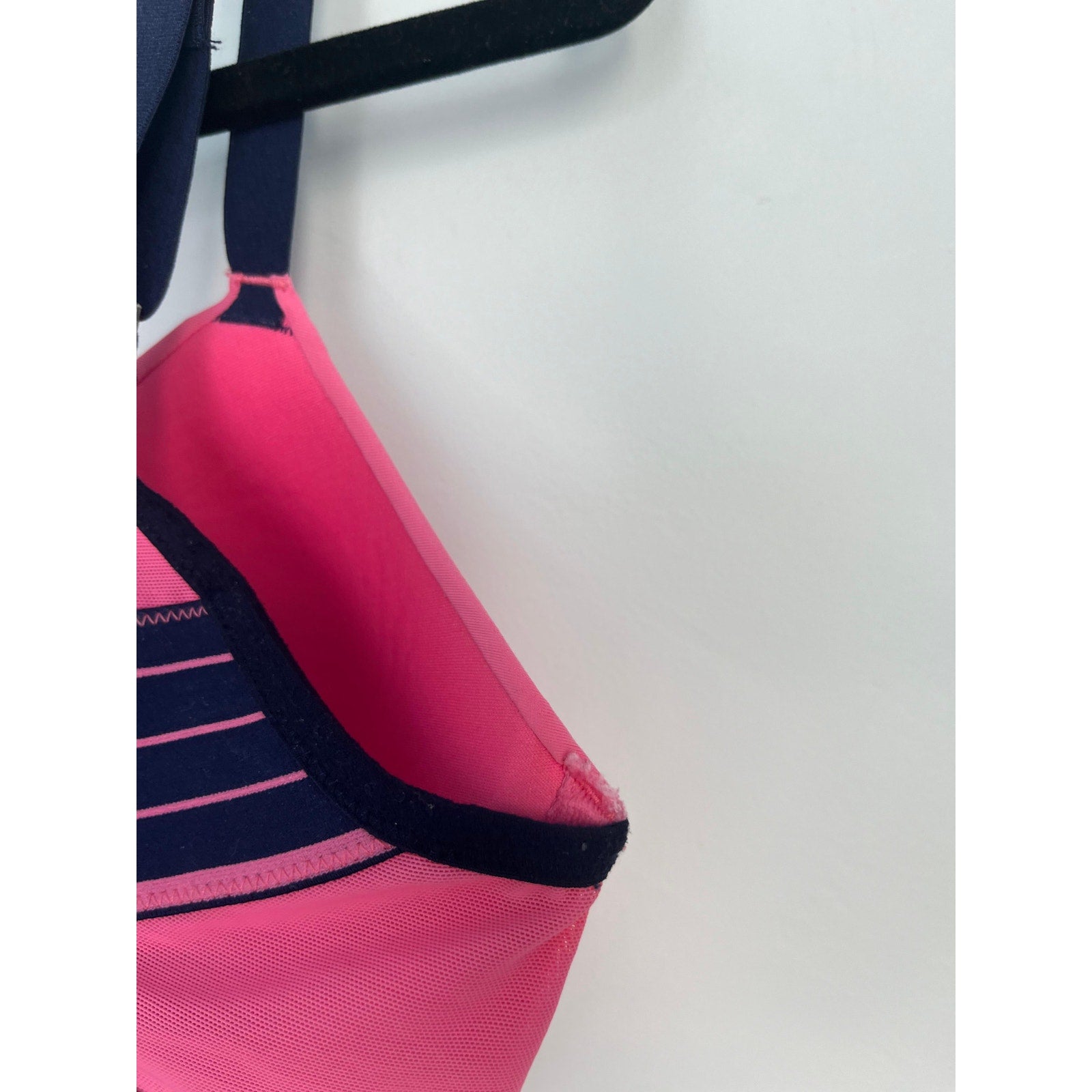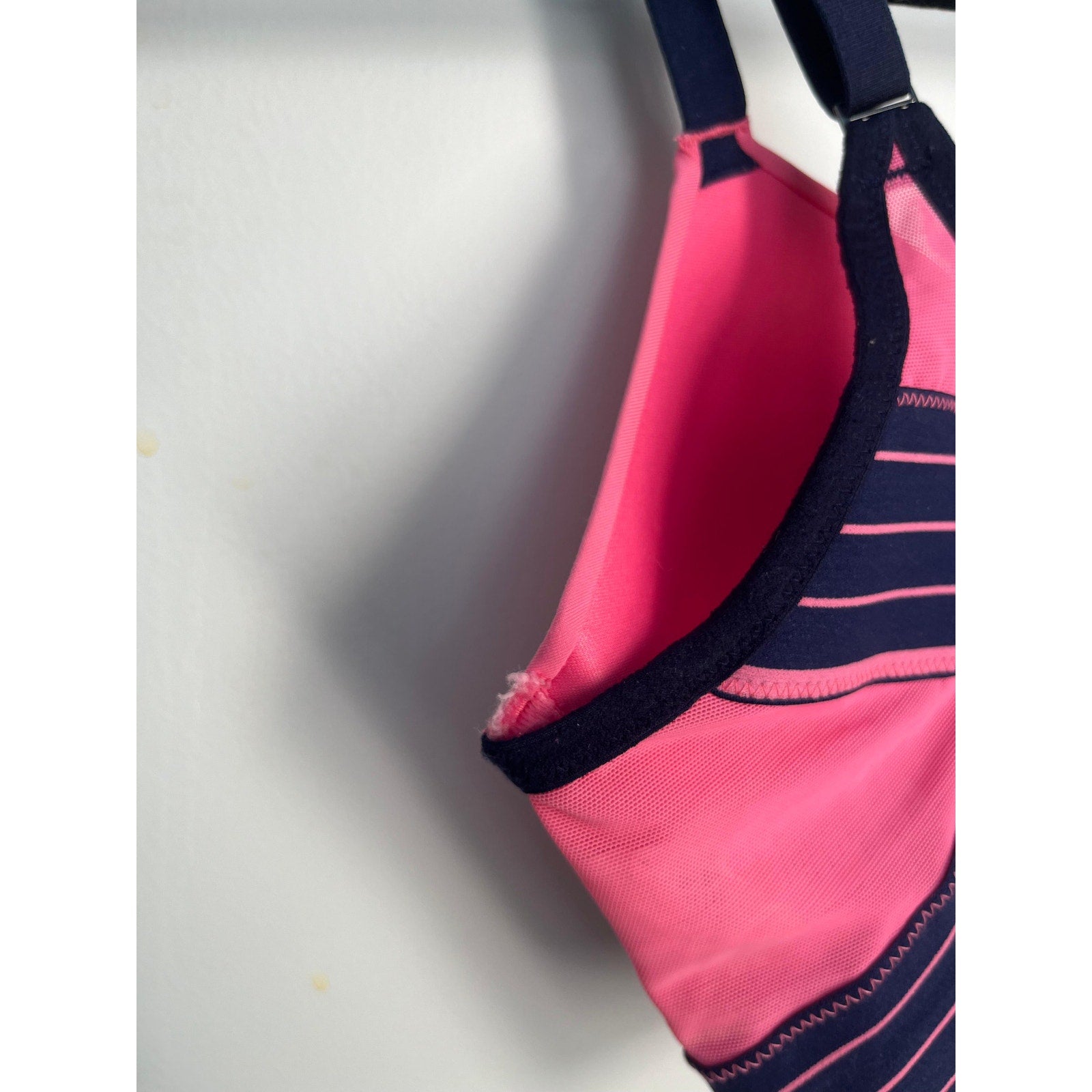 Vibrant pink bralette with navy striped elastic band and adjustable straps. Wireless molded cups with a smooth finish and comfortable stretch fit.