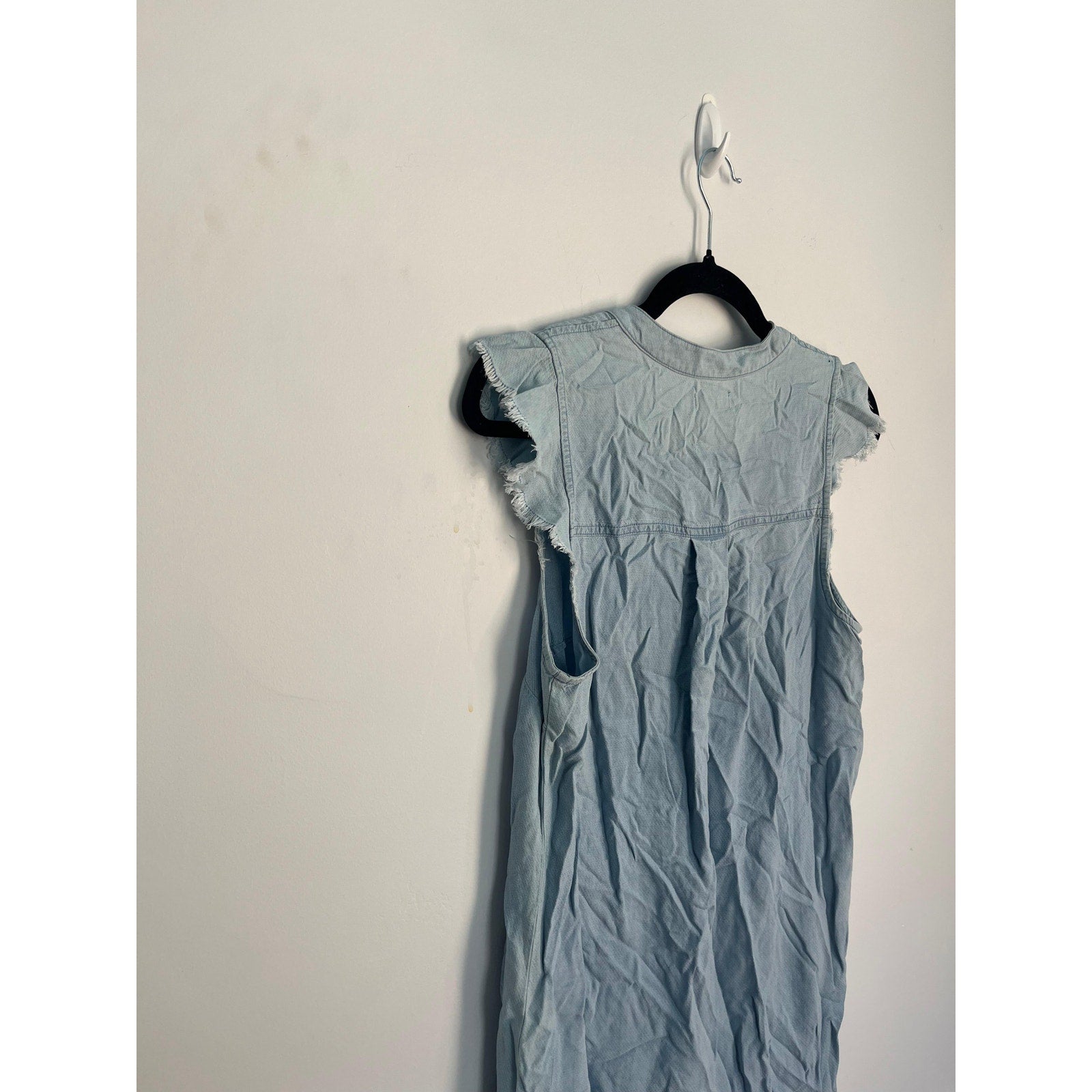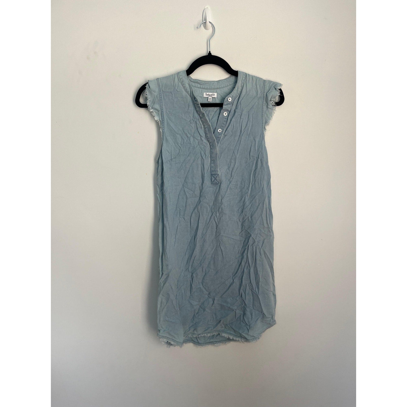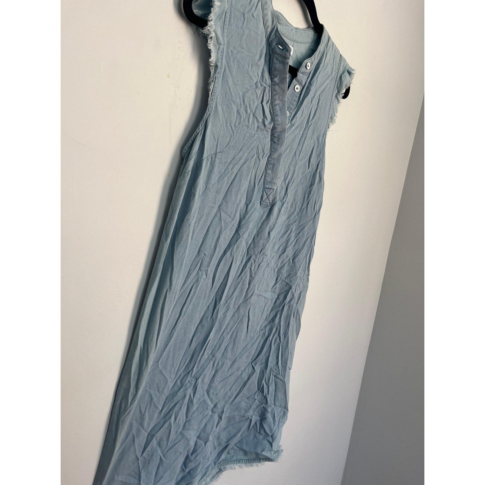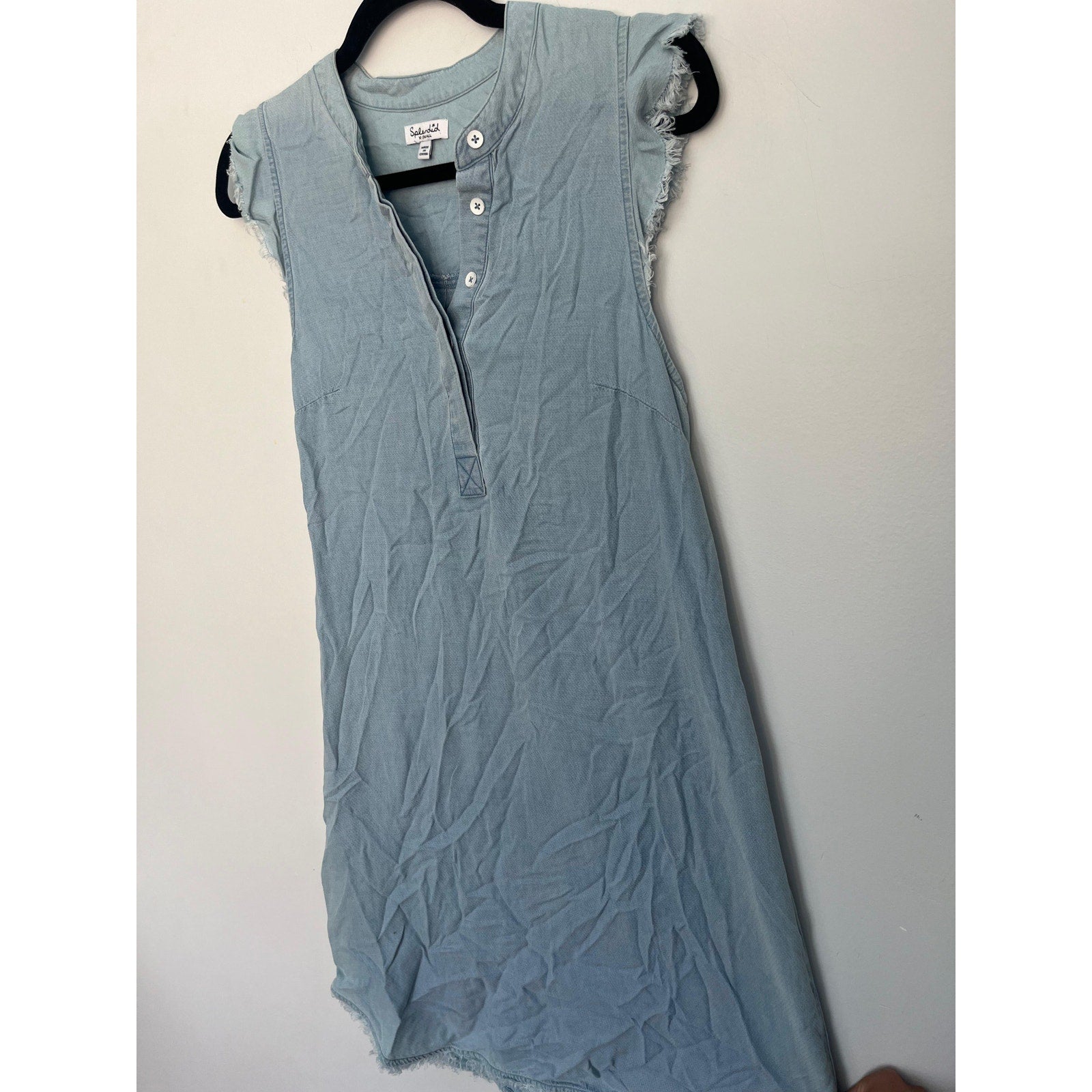 Light blue chambray-style sleeveless dress by Splendid featuring a henley button neckline and frayed edges at the sleeves and hem. Relaxed, casual fit—perfect for warm-weather wear.