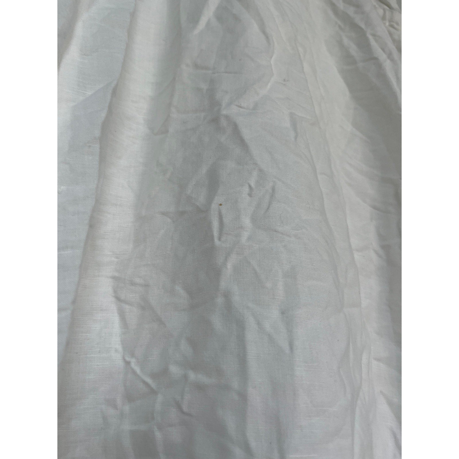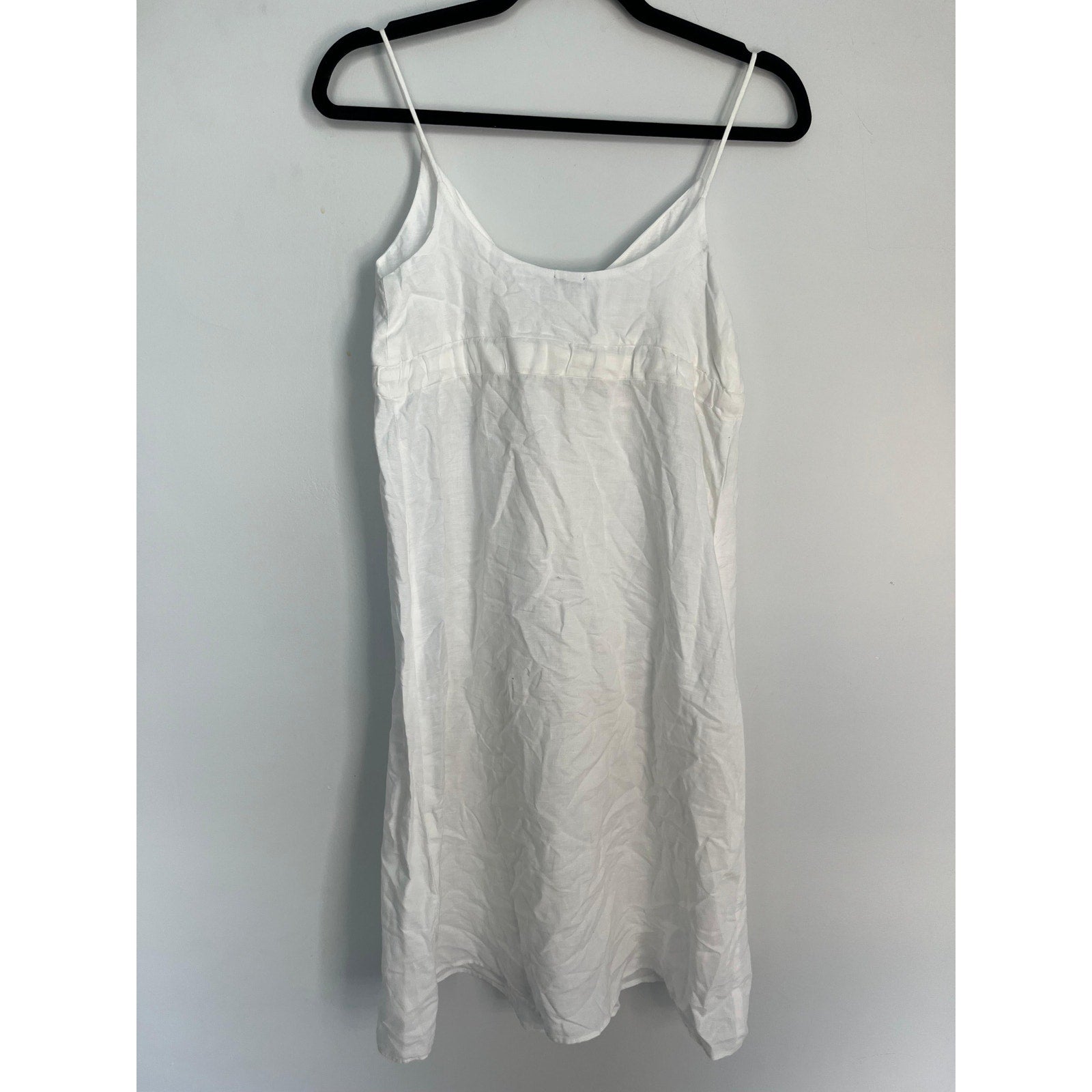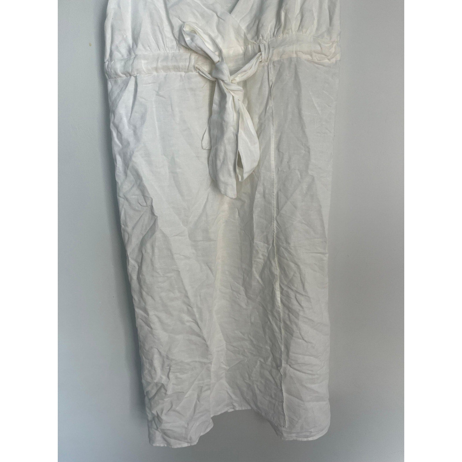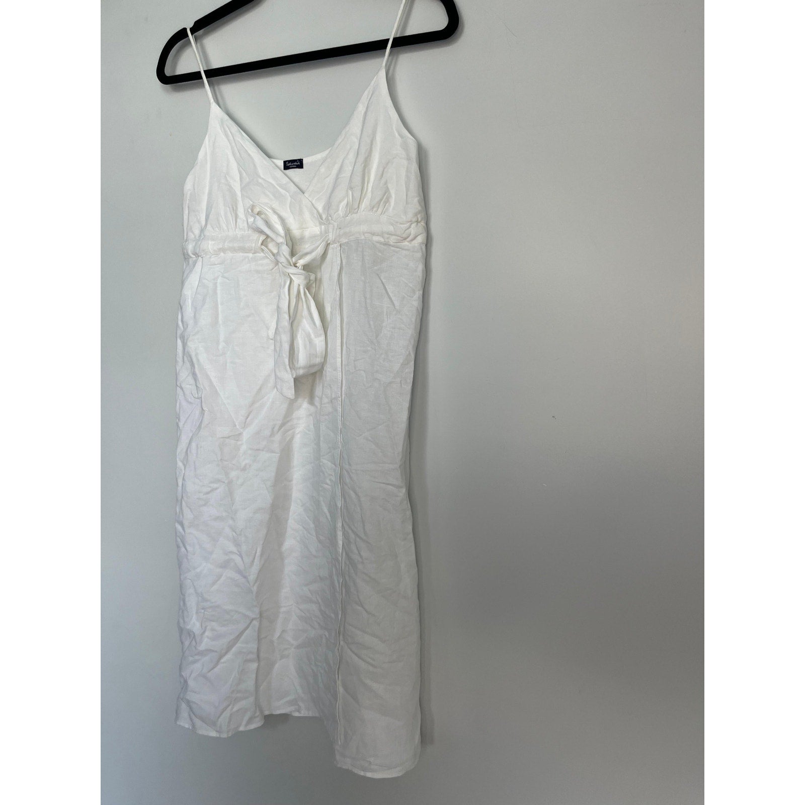 White sleeveless midi dress with spaghetti straps and a front tie waist. Lightweight and breezy with a subtle slub texture, perfect for summer days or layering.