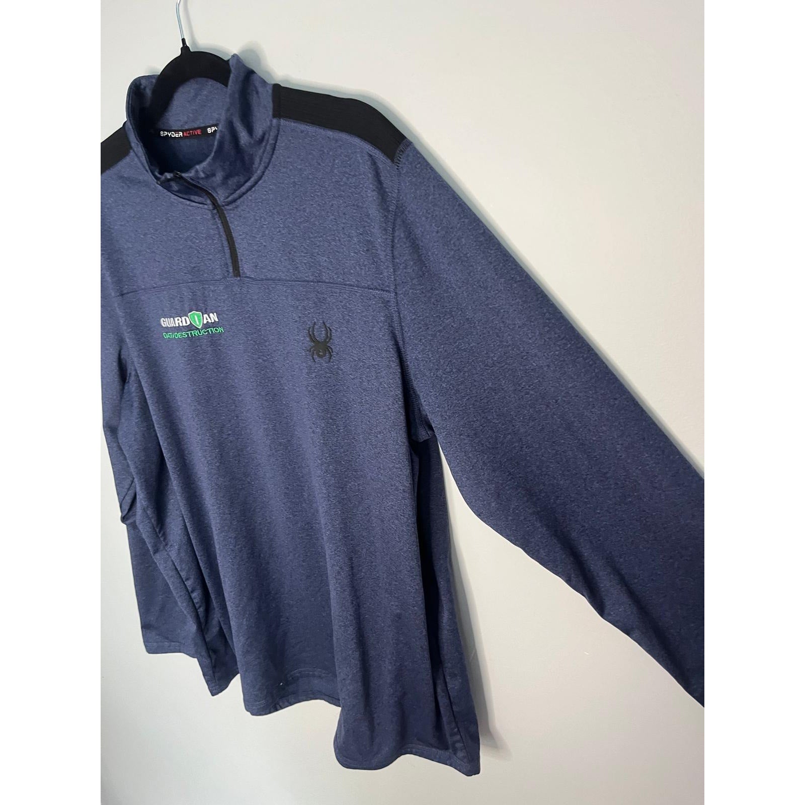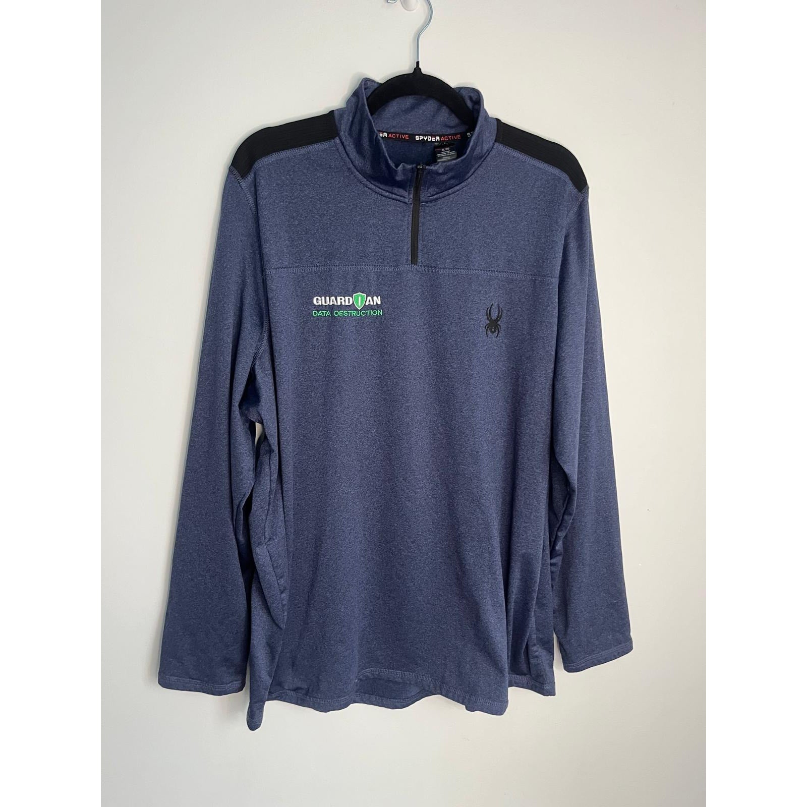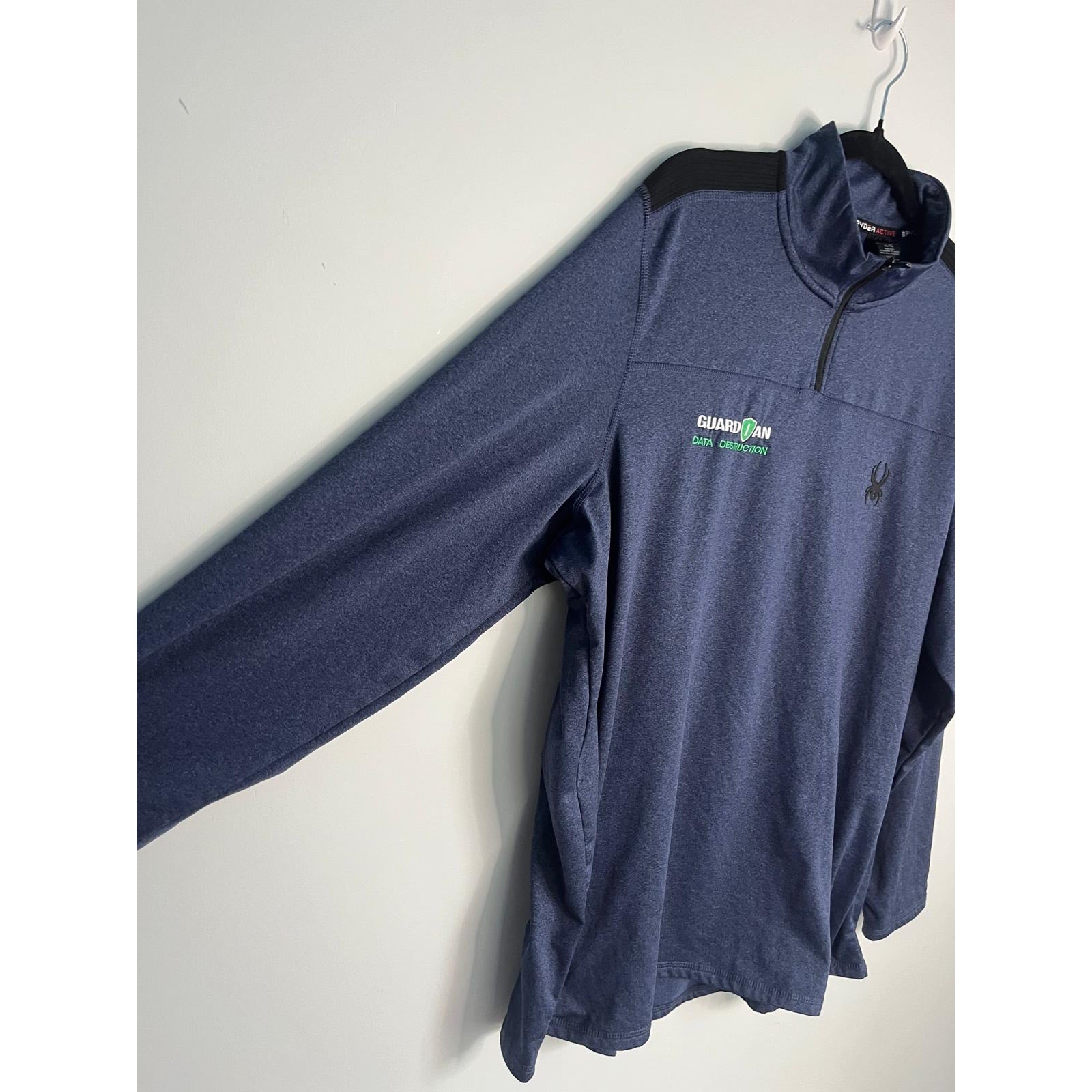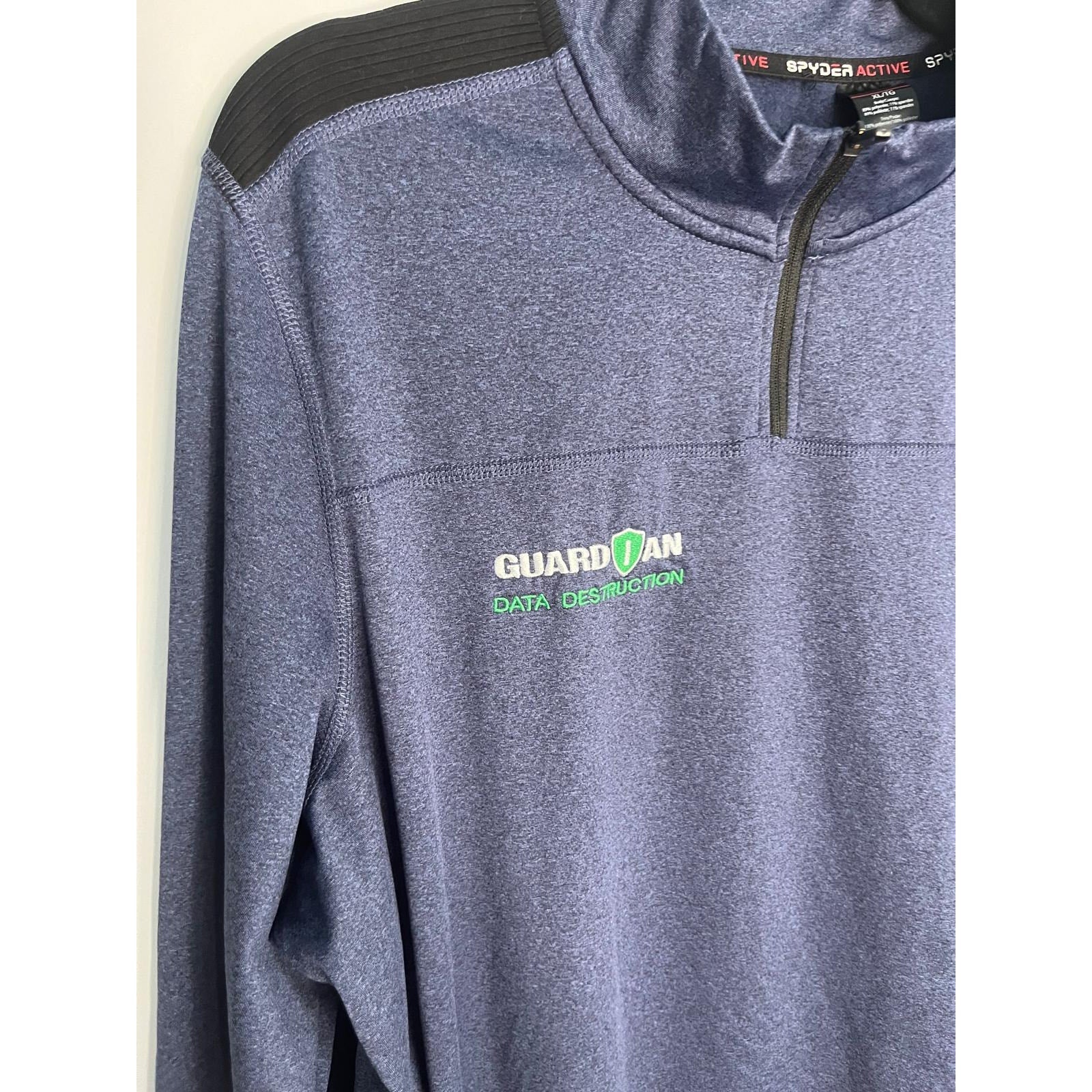 Athletic performance quarter zip top in a rich blue color, featuring black shoulder panels, embroidered chest logo, and "Guardian Data Destruction" branding. Made with stretchy polyester-spandex blend for a comfortable fit.