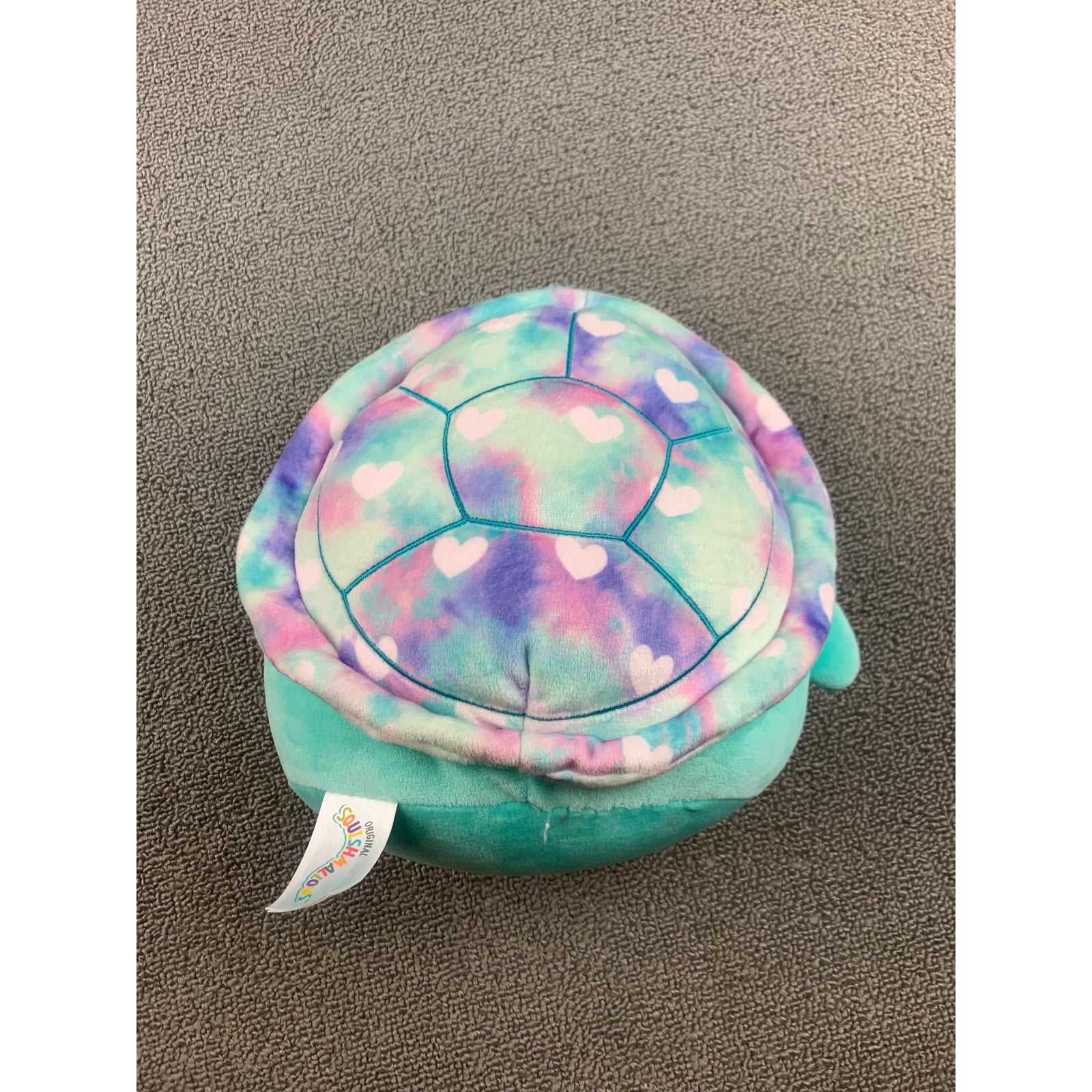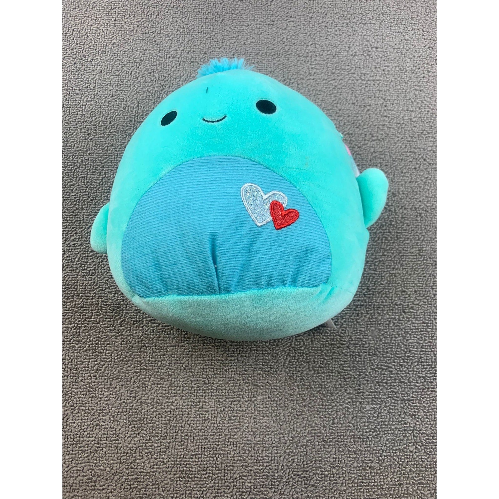 Original Squishmallows plush in teal blue with embroidered double heart patch detail. Super soft and huggable design—perfect for cuddling, collecting, or gifting.