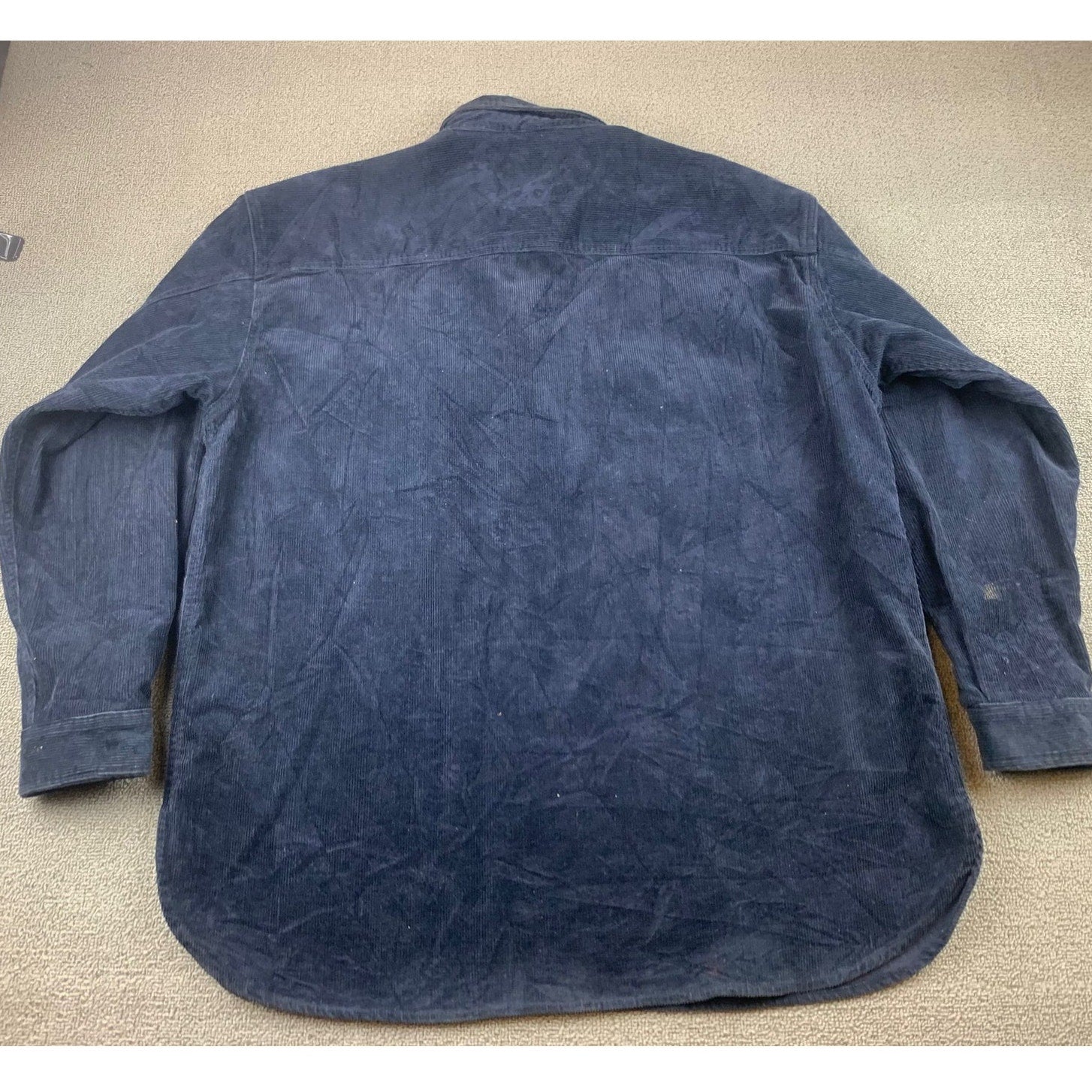 Vintage-inspired heavyweight corduroy popover with quarter zip, pointed collar, dual chest pockets, button cuffs, and long shirttail hem—great as a shacket layer. Soft wide-wale texture with leather-look zipper pull; classic workwear vibe in deep navy. Made in China, material made of cotton.
