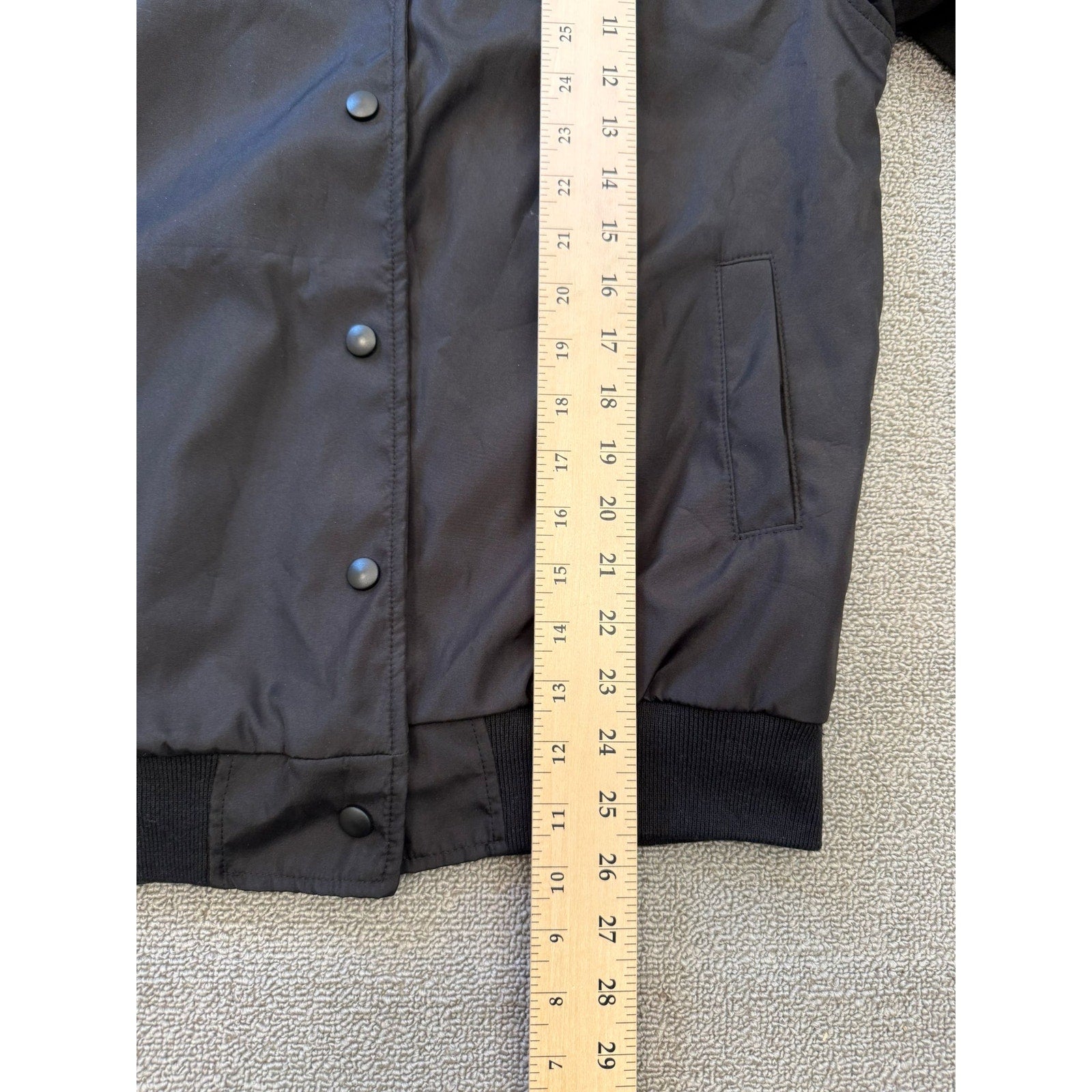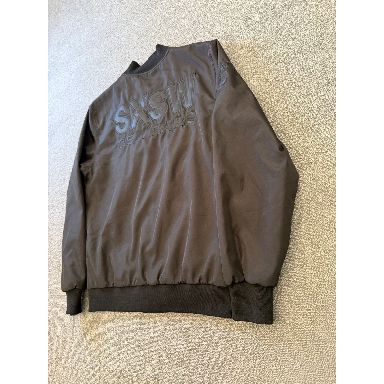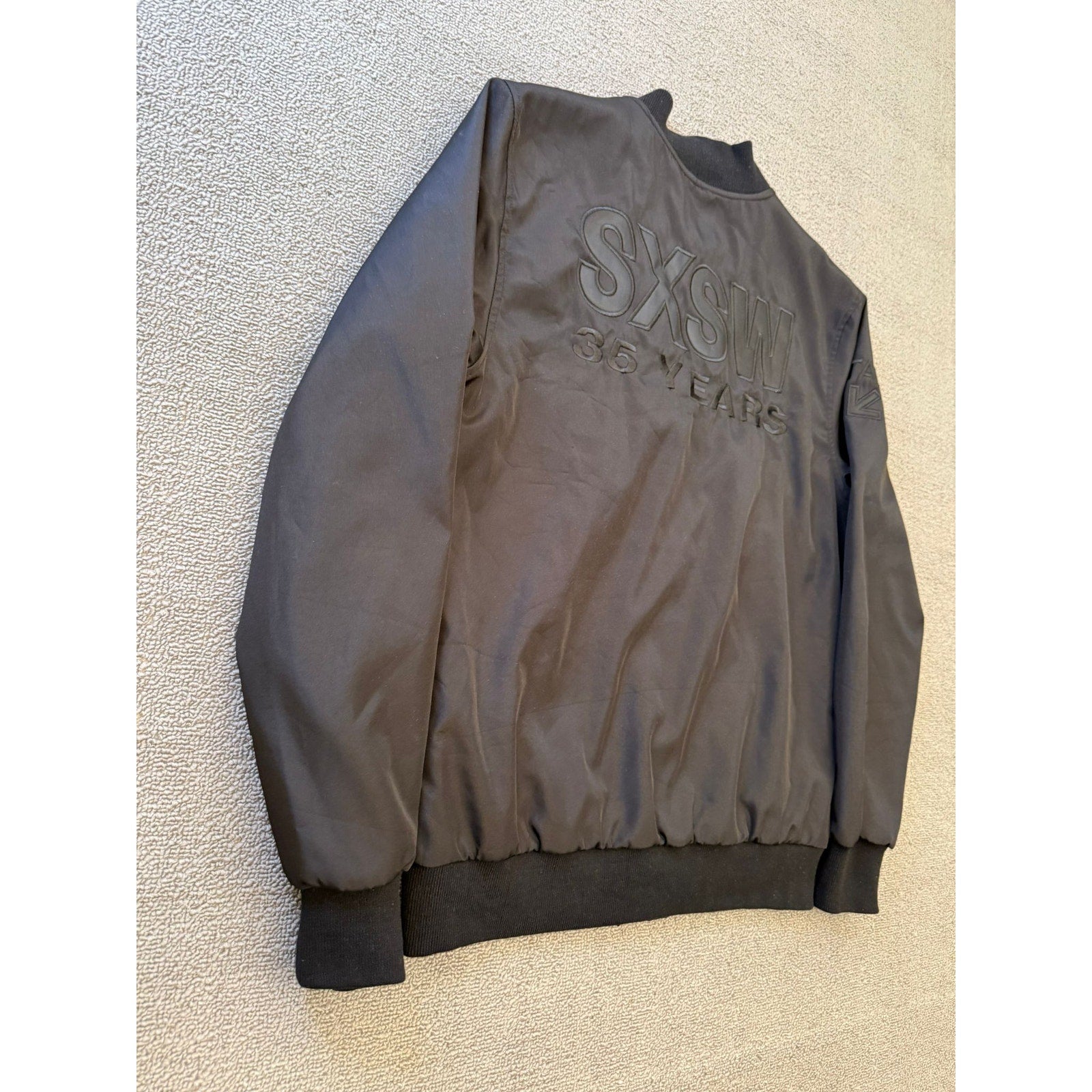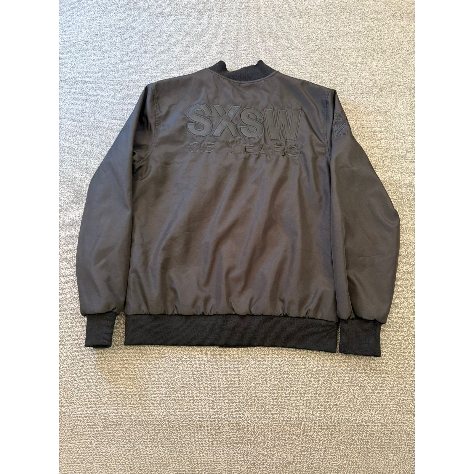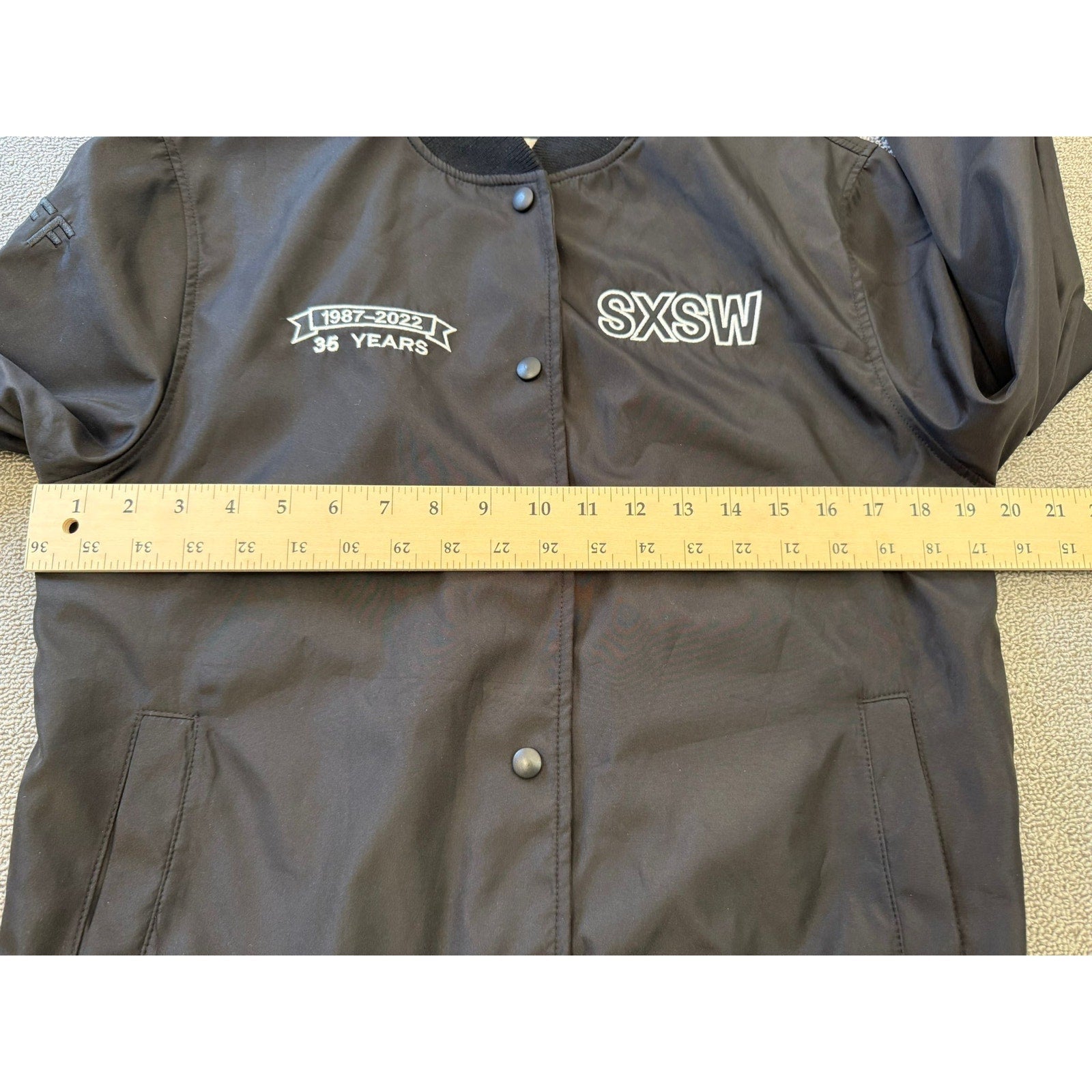 Black bomber-style jacket by Strata, commemorating. Features embroidered SXSW logos on front, snap-button closure, ribbed cuffs and hem—limited-issue, event-specific merch with collector appeal.