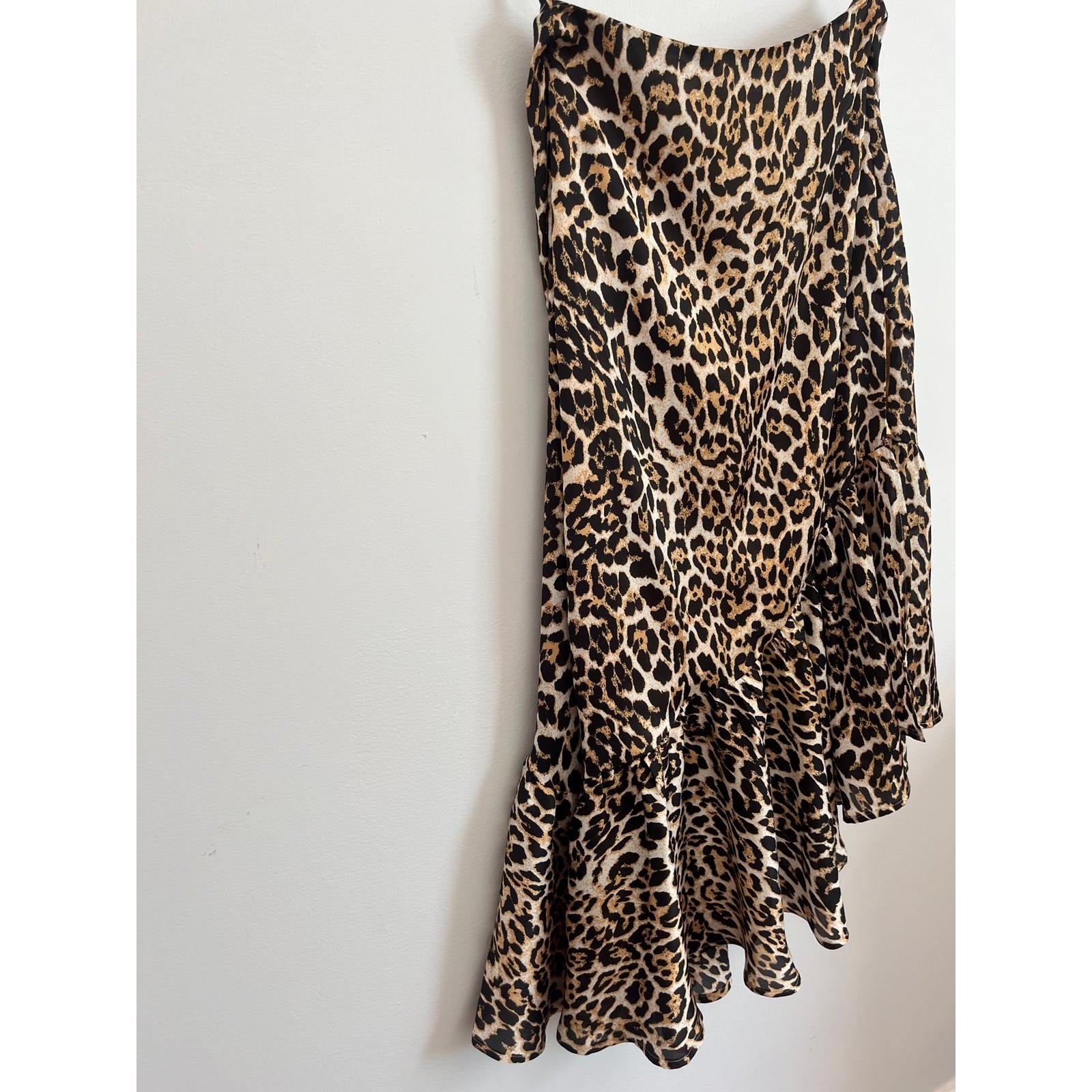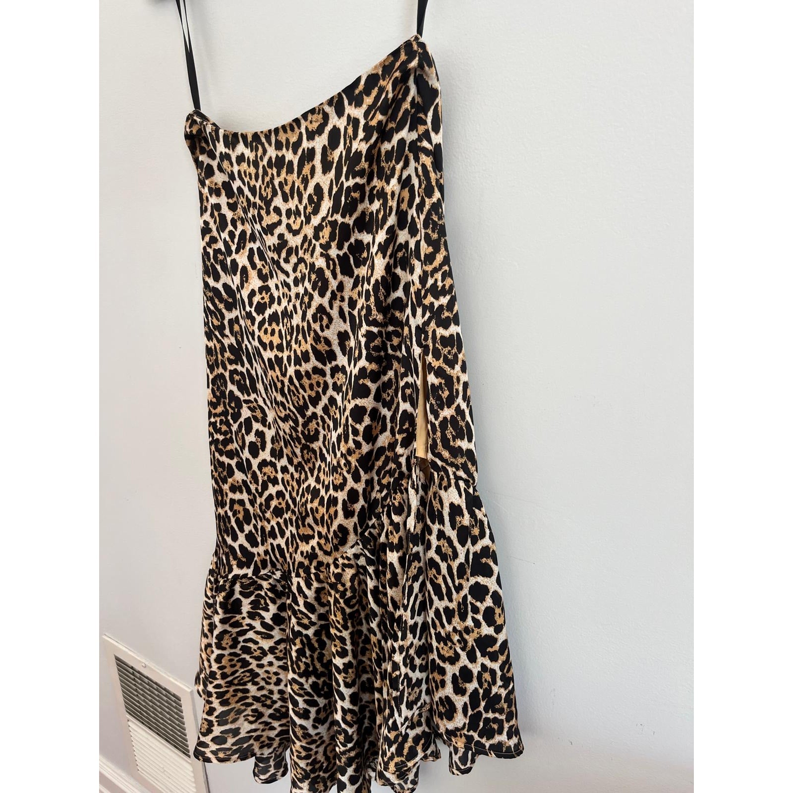Chic and flirty leopard print mini dress with asymmetrical ruffle hem and thin adjustable spaghetti straps. Lightweight woven fabric with silky interior lining.