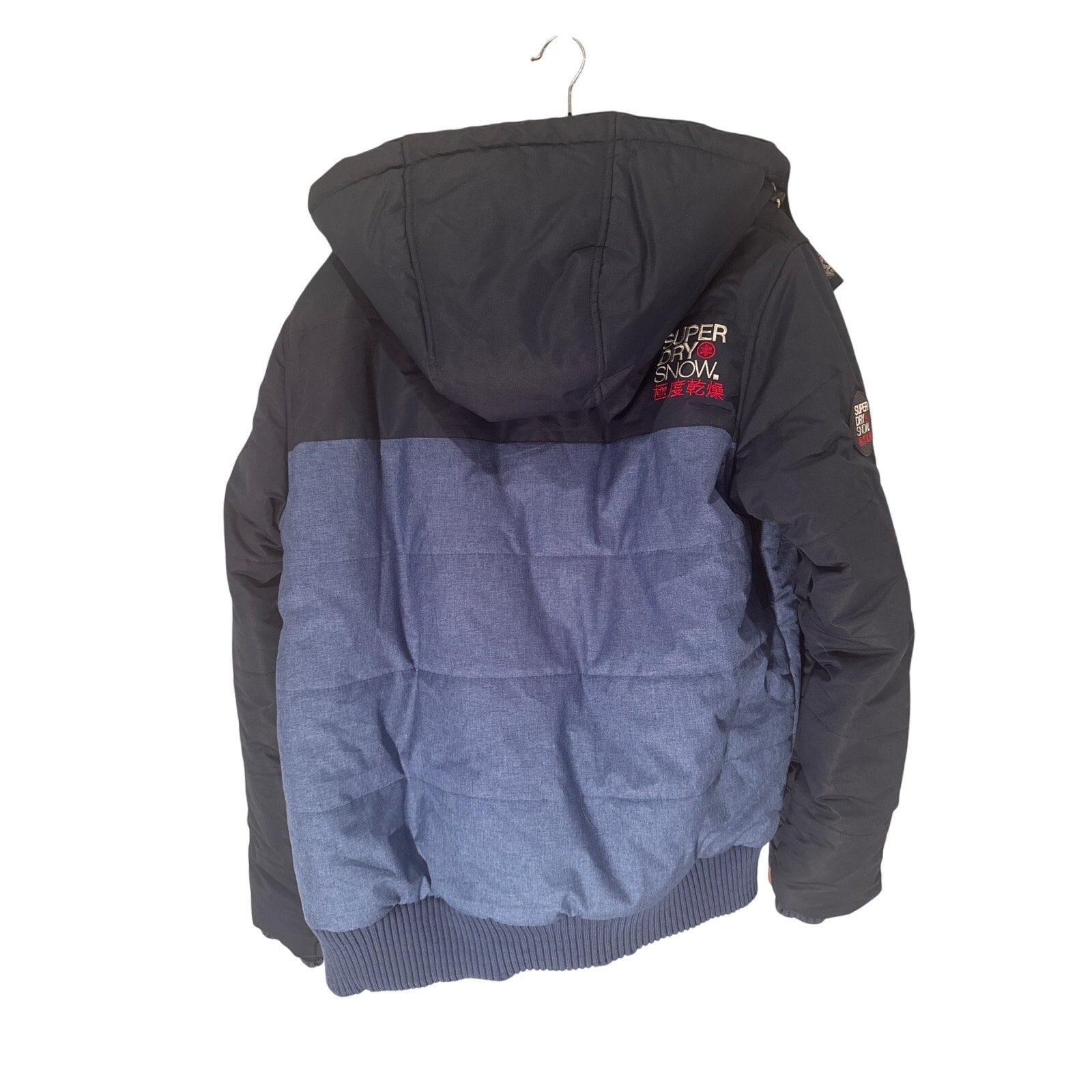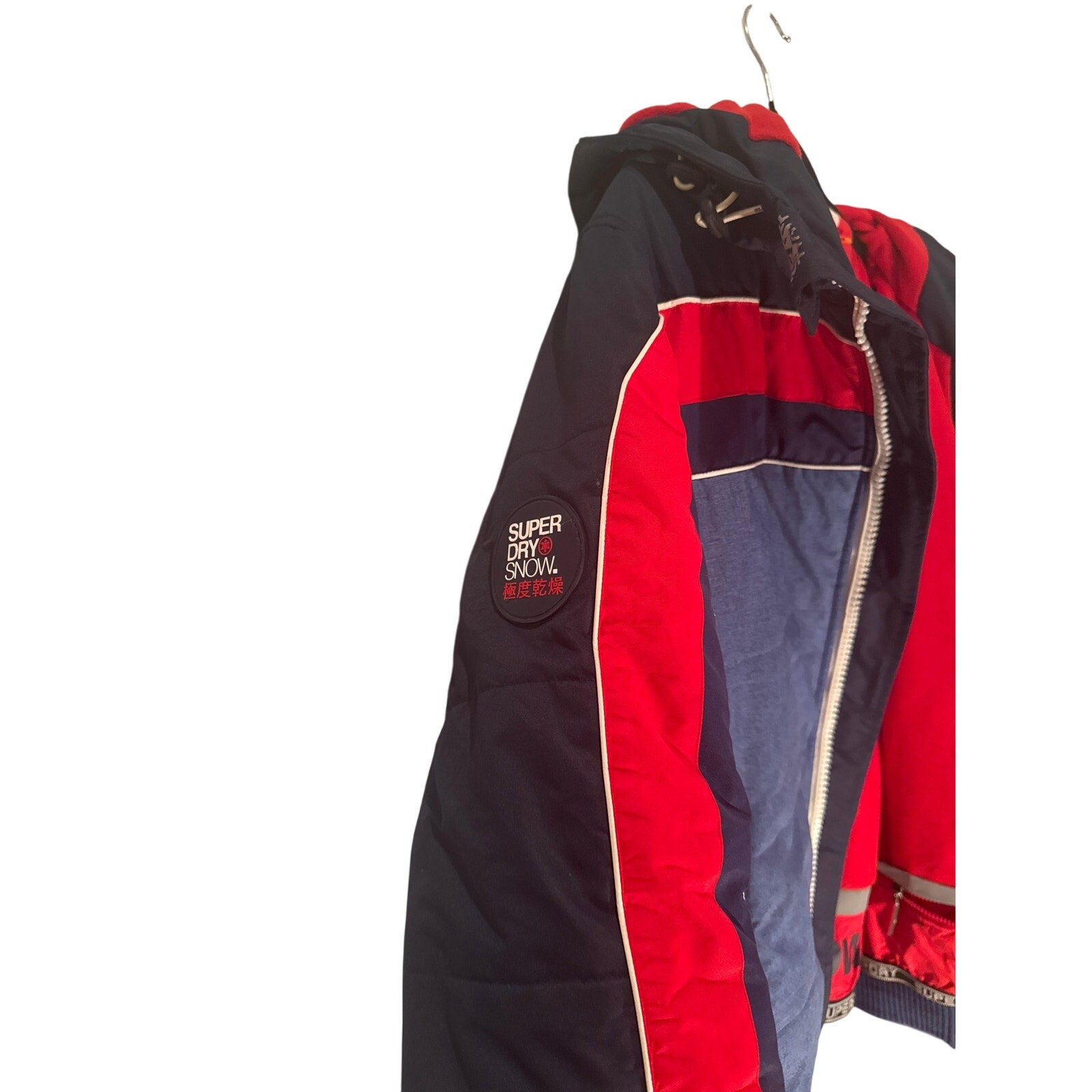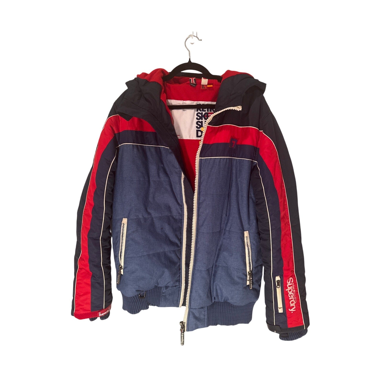 Superdry men's Polar Ski Puffer jacket from the Superdry Snow collection. This retro yet cozy quilted ski jacket features a fleece lined body and hood will help keep the elements out while the ribbed cuffs and hem and removable snow-skirt help keep the warm in. Storm zips, arm vents, cuff adjusters, a tech pocket and a ski pass holder are among the technical features bringing practicality to the Superdry style.