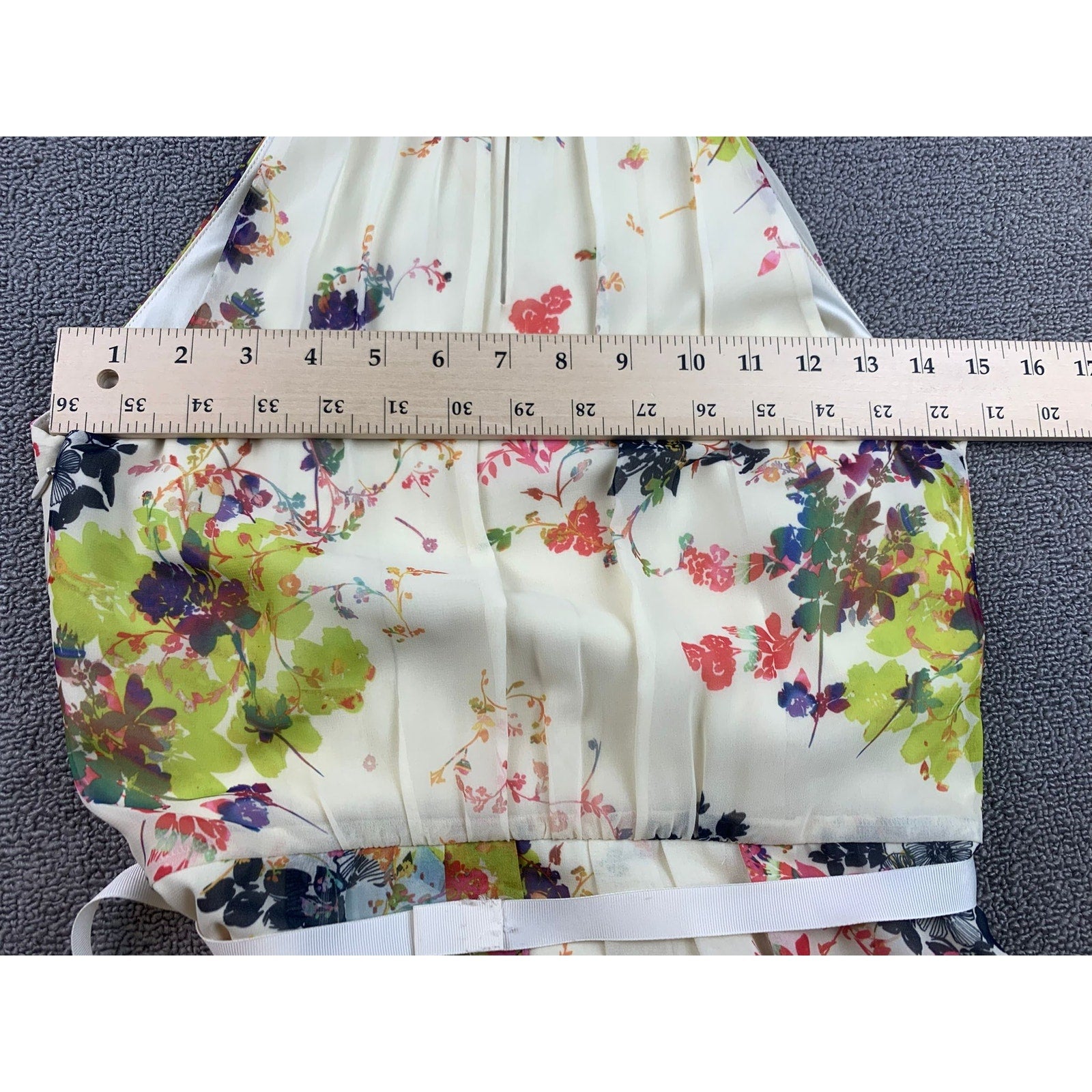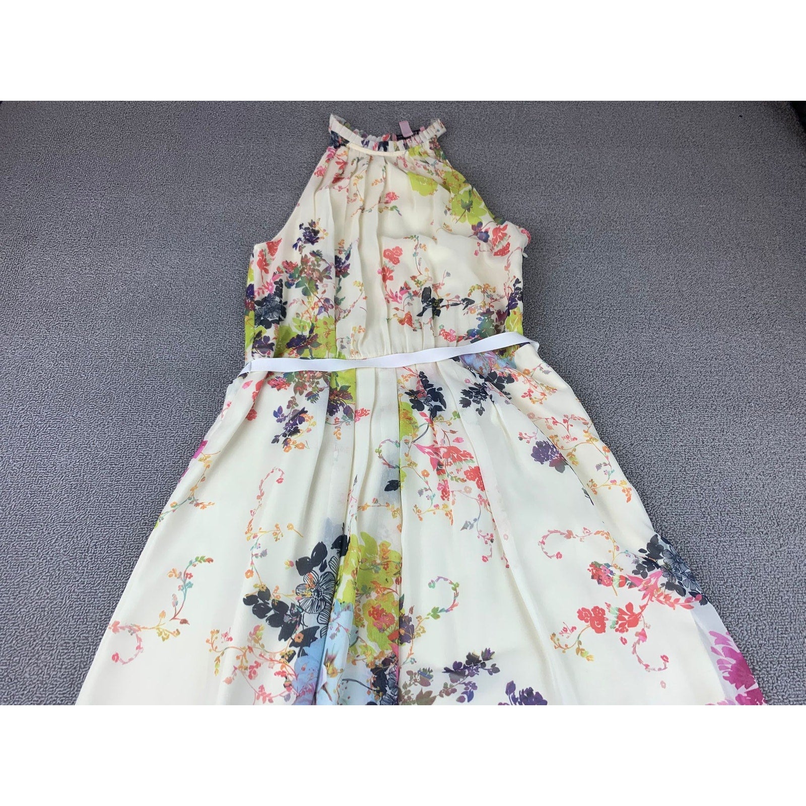 Elegant Ted Baker London floral maxi dress in soft pastel tones. Features a halter neckline with delicate ruffle detail, waist tie for shape definition, and a flowing A-line skirt—perfect for spring or summer events.