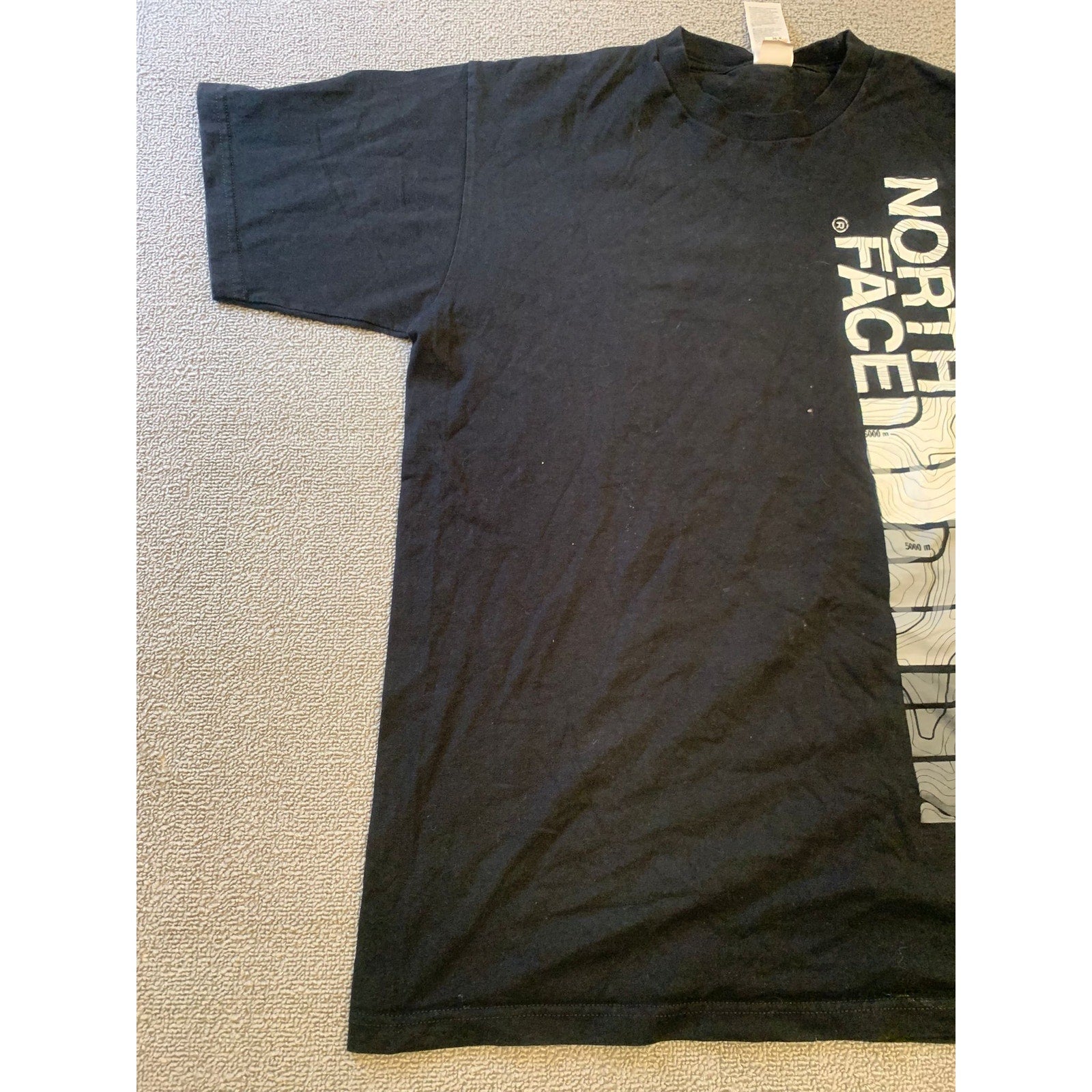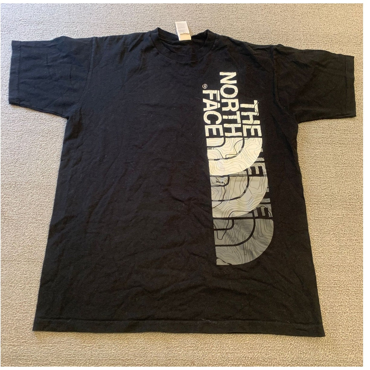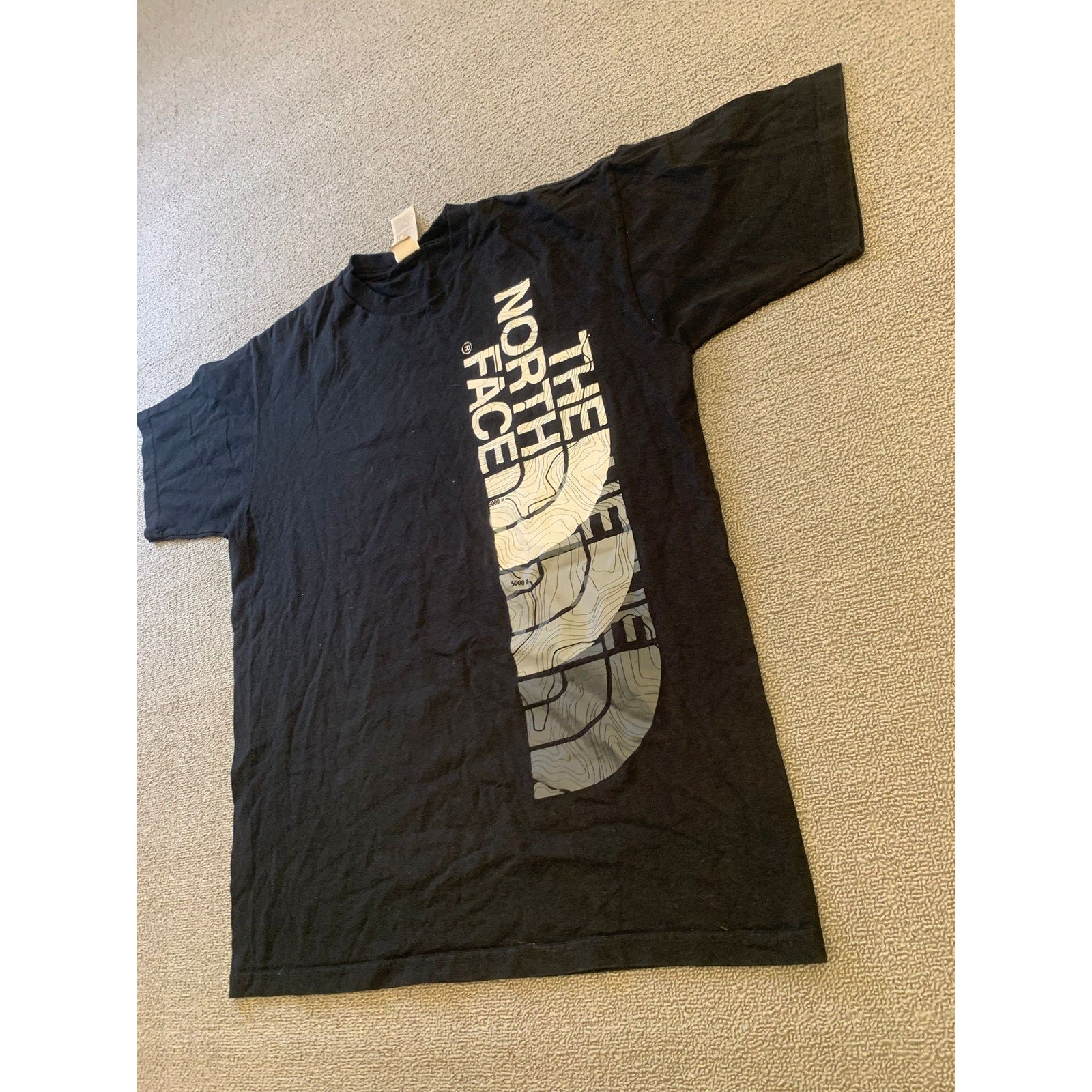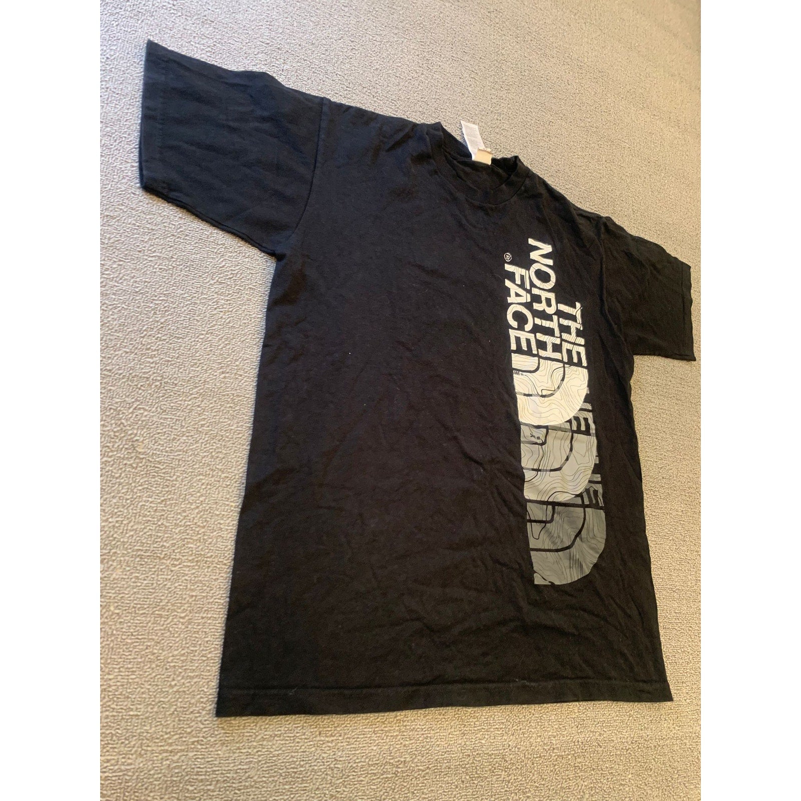 Men’s medium The North Face black crew T-shirt with a prominent vertical logo and topographic graphic print. Outdoor-inspired style in soft cotton—a versatile classic.