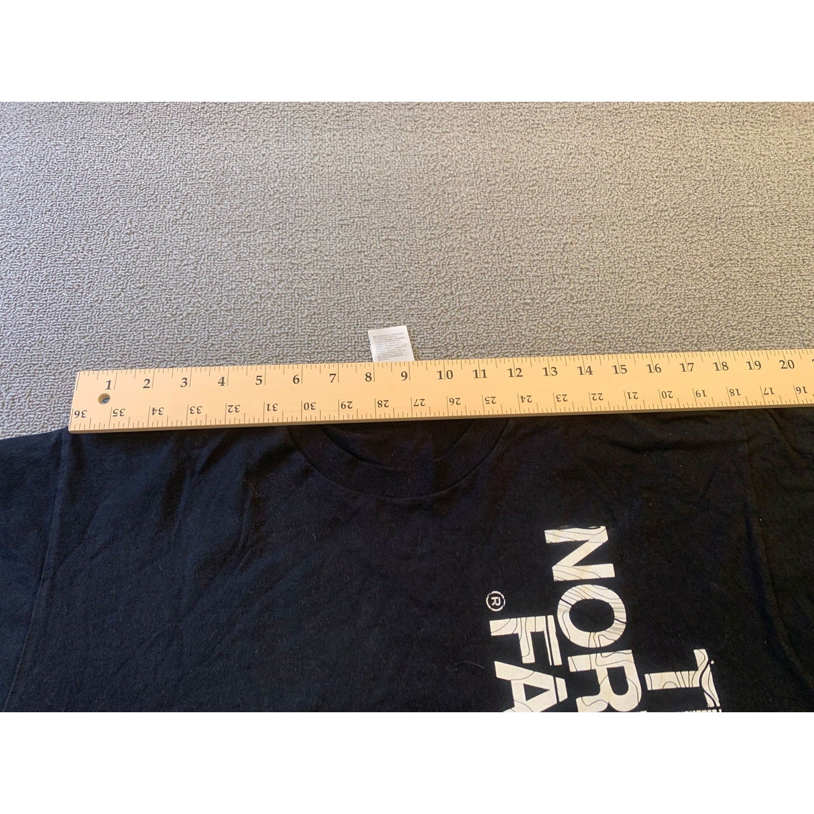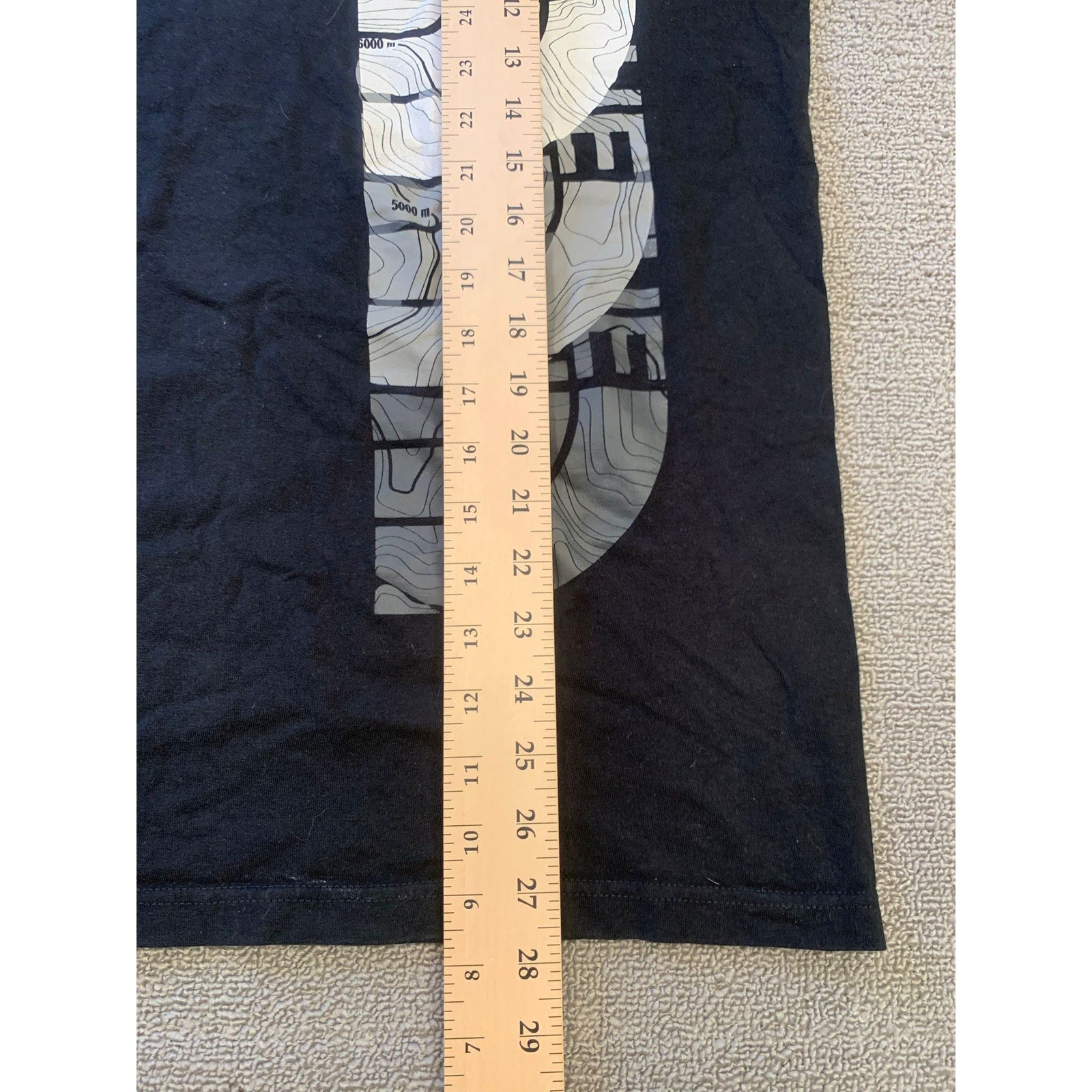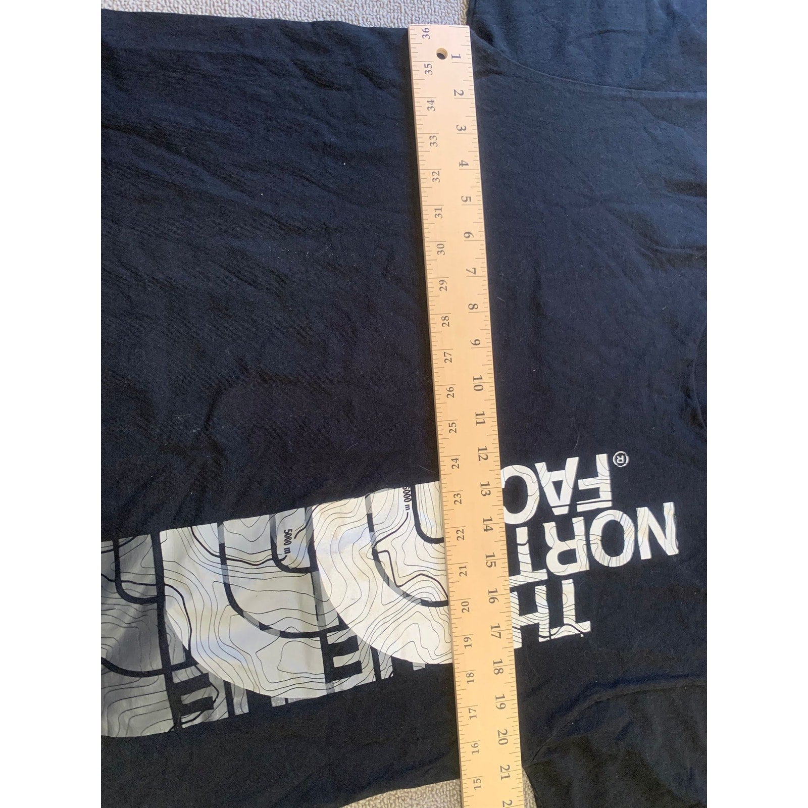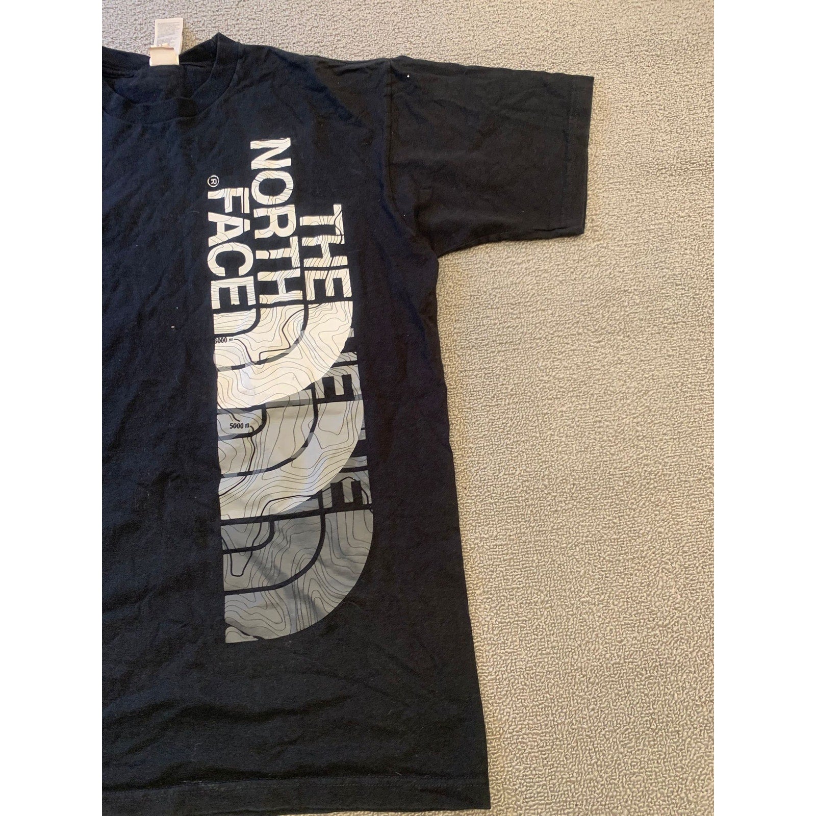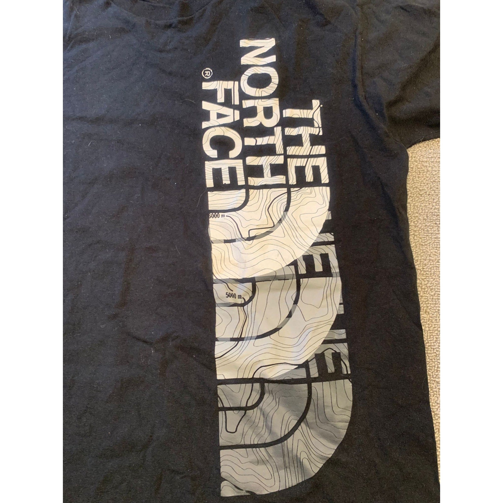 Men’s medium The North Face black crew T-shirt with a prominent vertical logo and topographic graphic print. Outdoor-inspired style in soft cotton—a versatile classic.