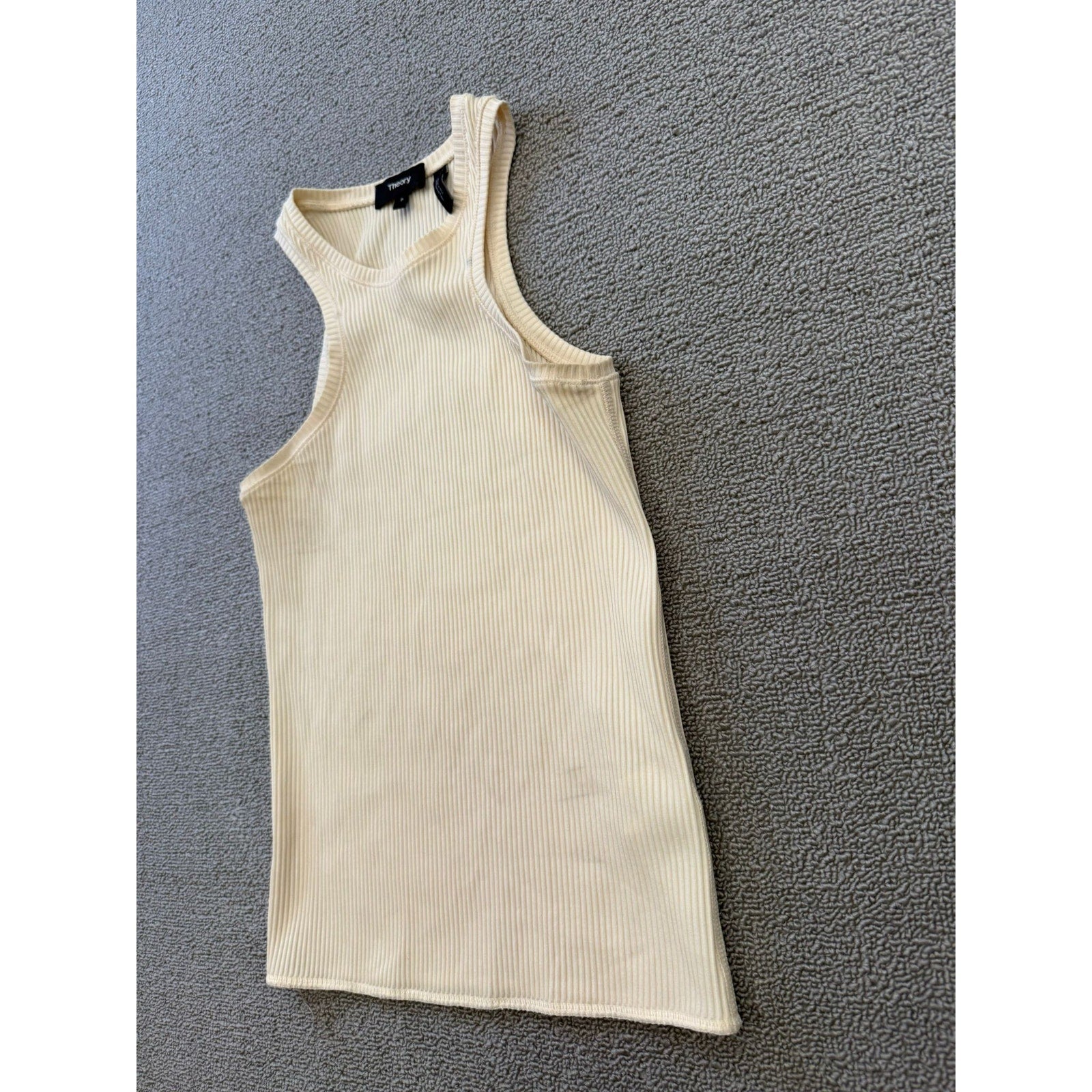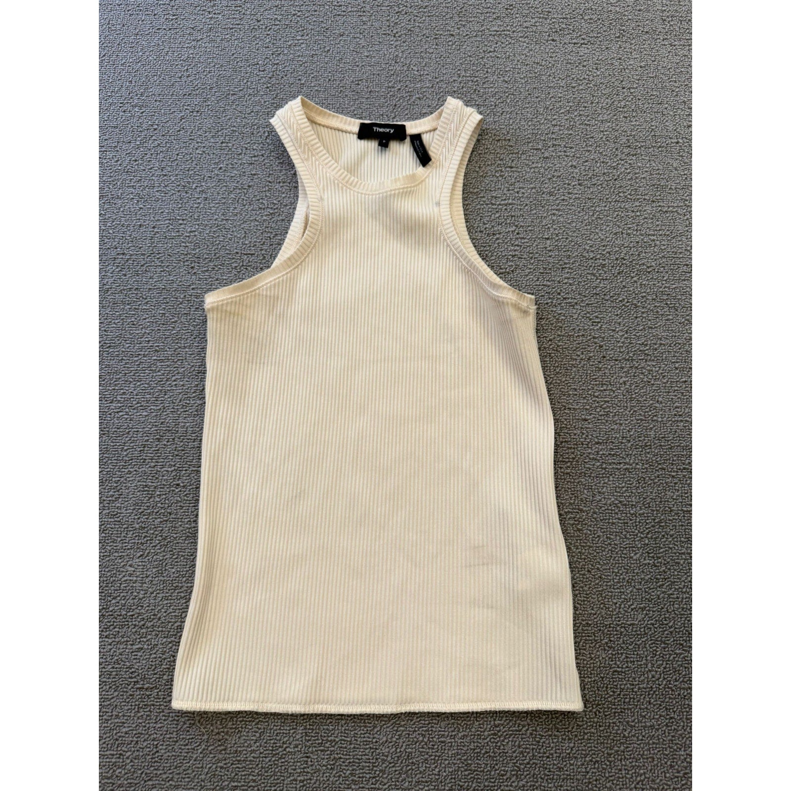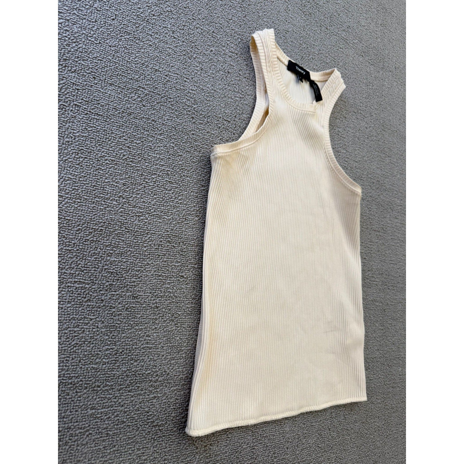 A sleek, cream white-colored ribbed racerback tank top from Theory featuring a slim, body-skimming silhouette, clean neckline, and soft stretch fabrication. Made with high-quality rib-knit construction, it’s perfect for minimalist styling and easy layering.