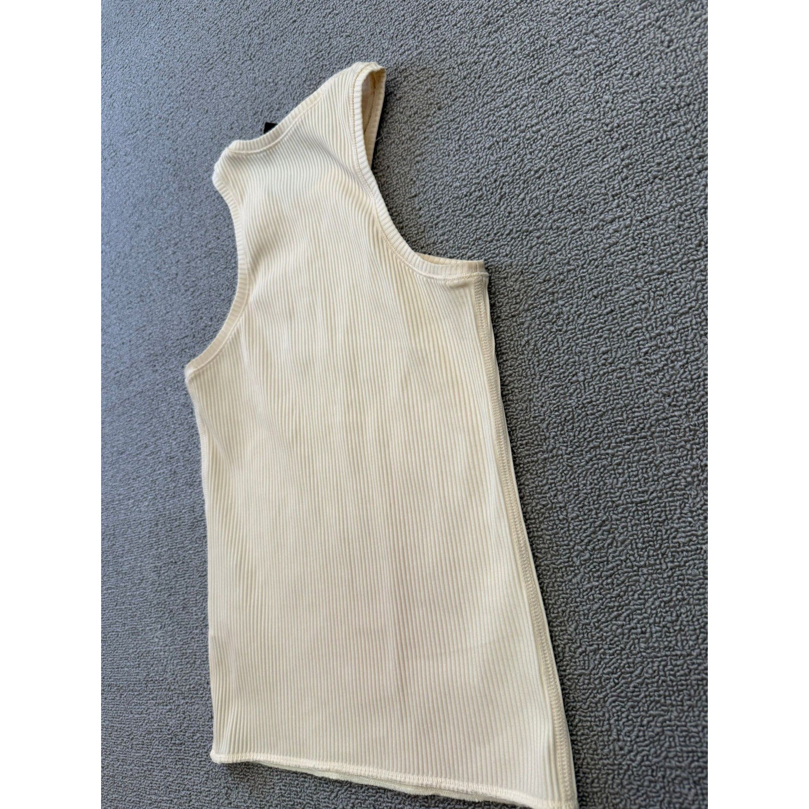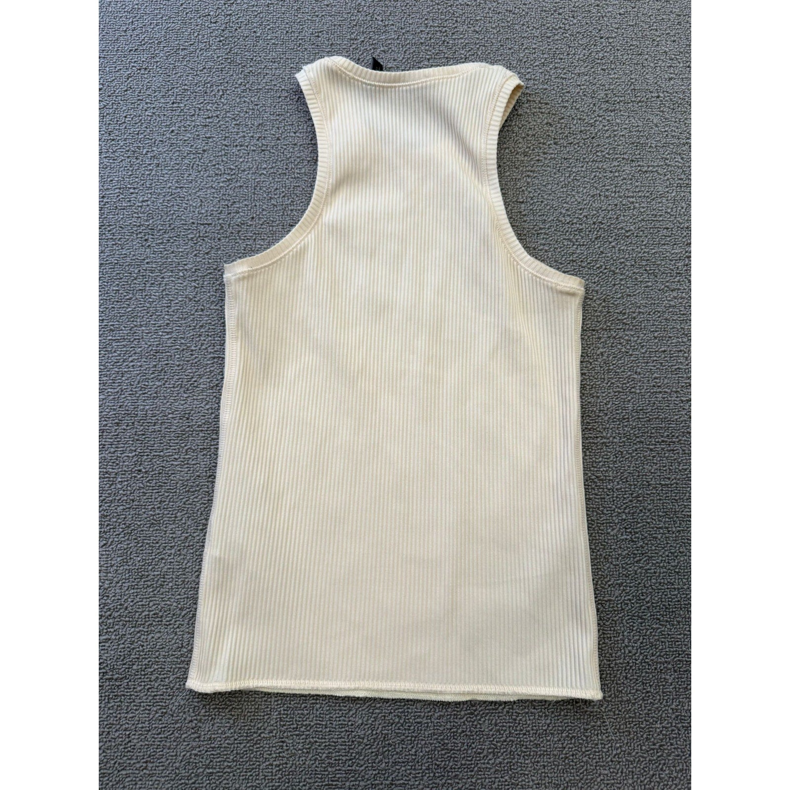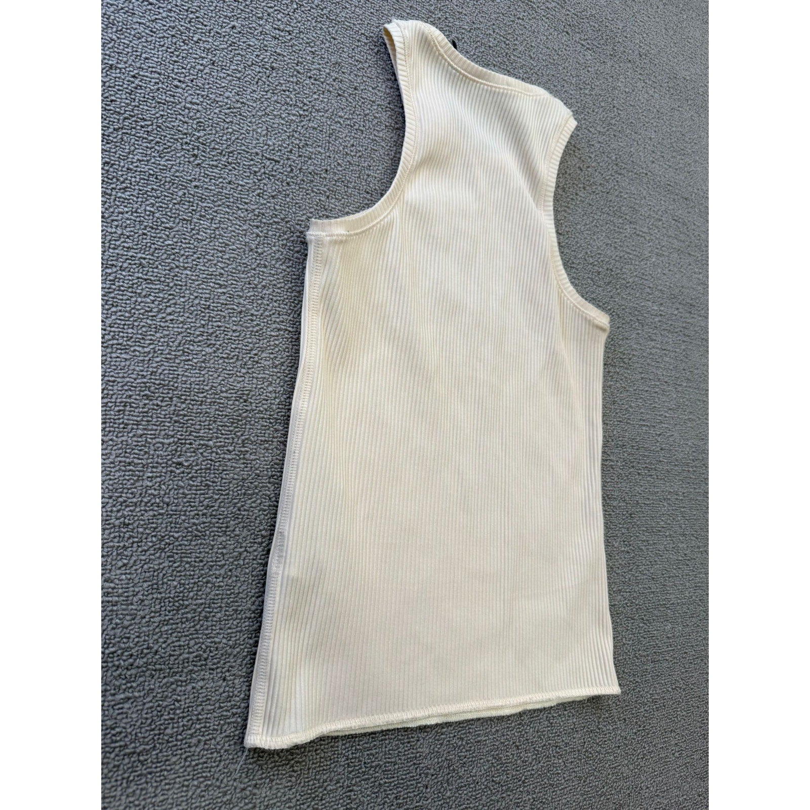 A sleek, cream white-colored ribbed racerback tank top from Theory featuring a slim, body-skimming silhouette, clean neckline, and soft stretch fabrication. Made with high-quality rib-knit construction, it’s perfect for minimalist styling and easy layering.