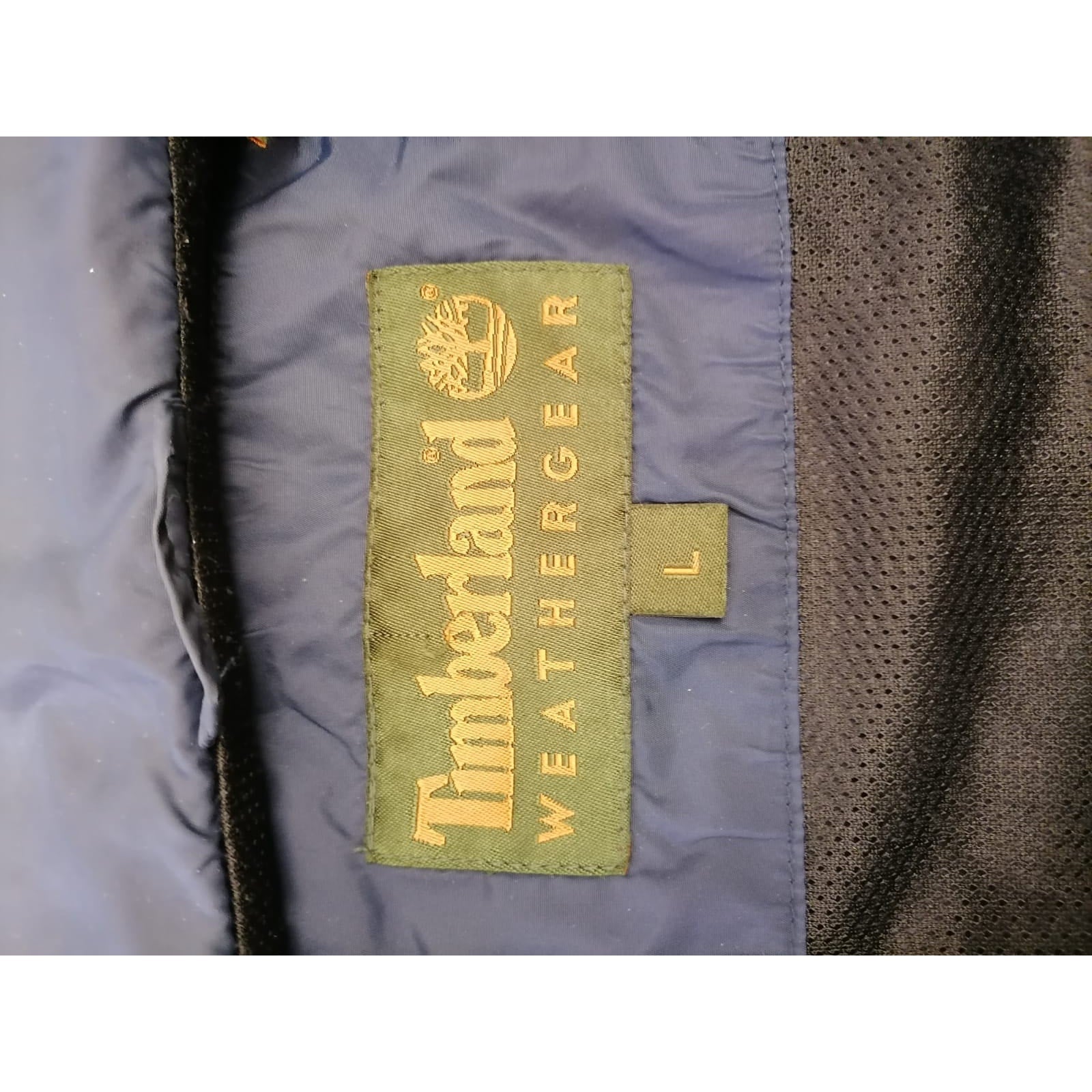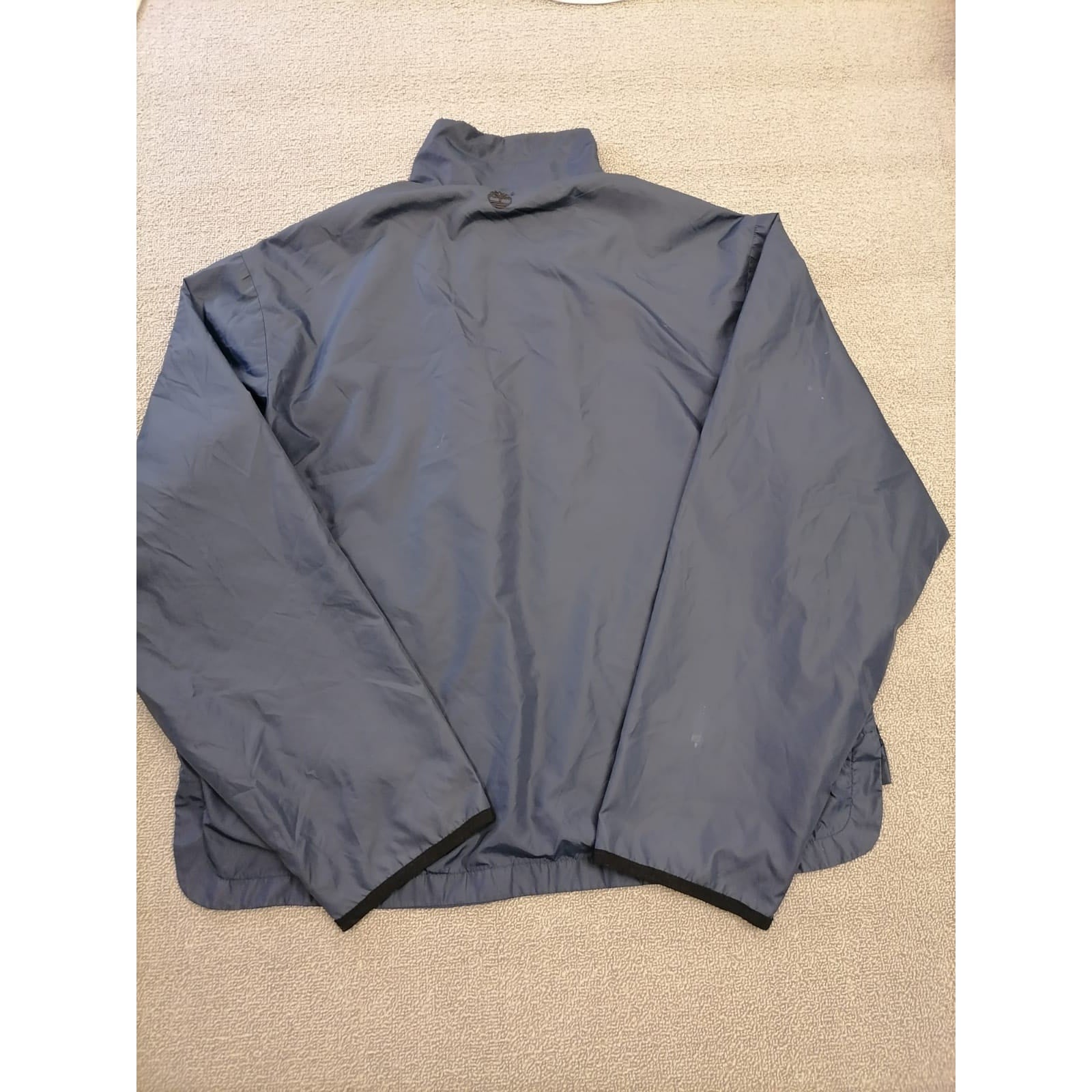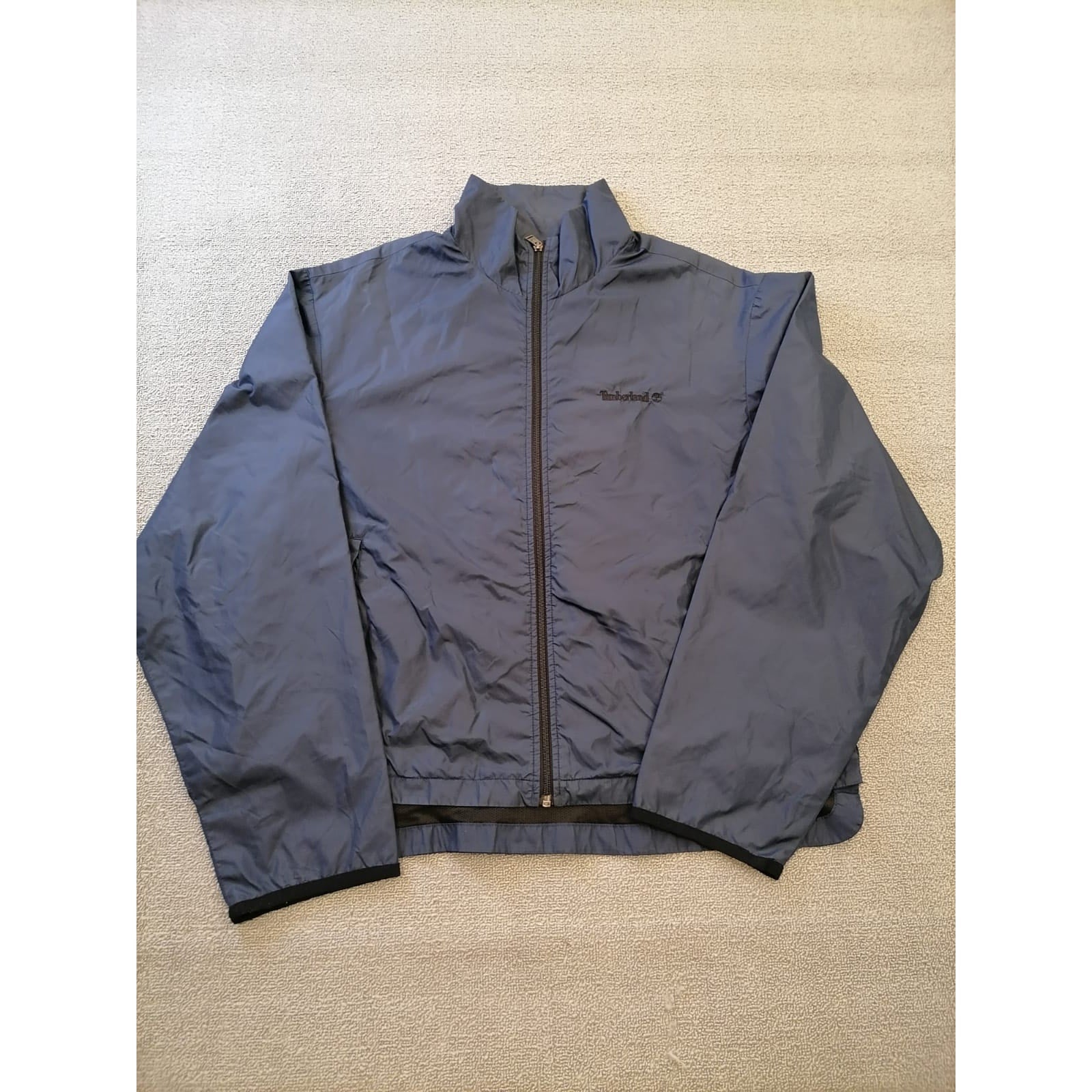 A lightweight blue Timberland jacket in size Large, featuring full zip closure, stand-up collar, internal mesh lining, and tonal embroidered logo—designed for versatile outdoor wear with a streamlined fit. Soft yet durable fabric with weather-resistant properties.
