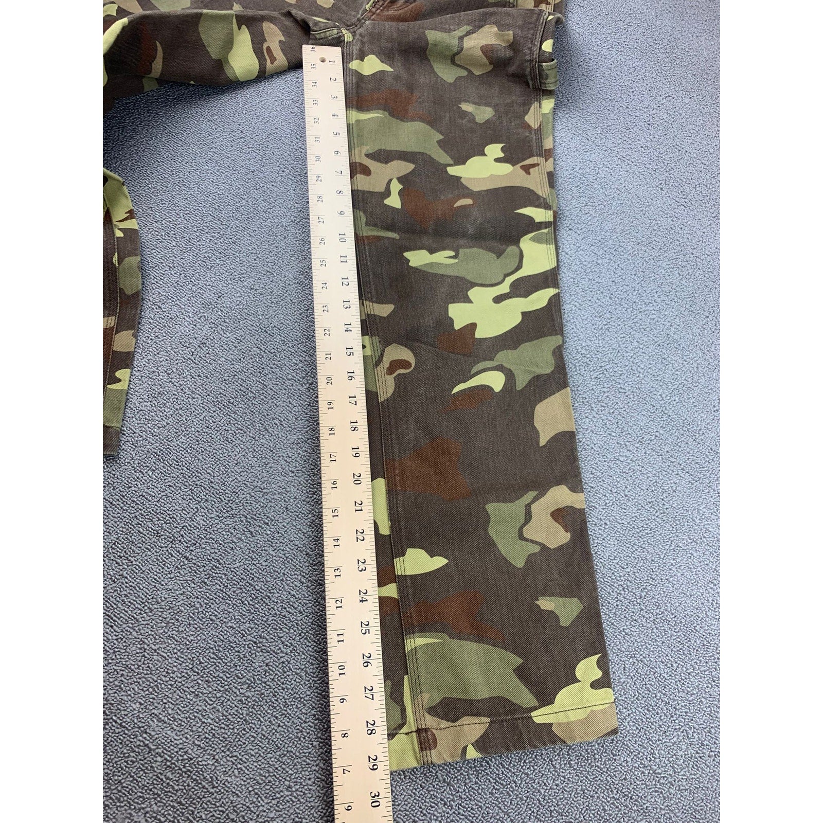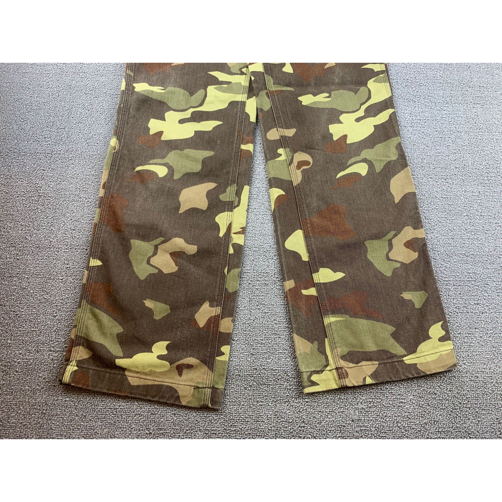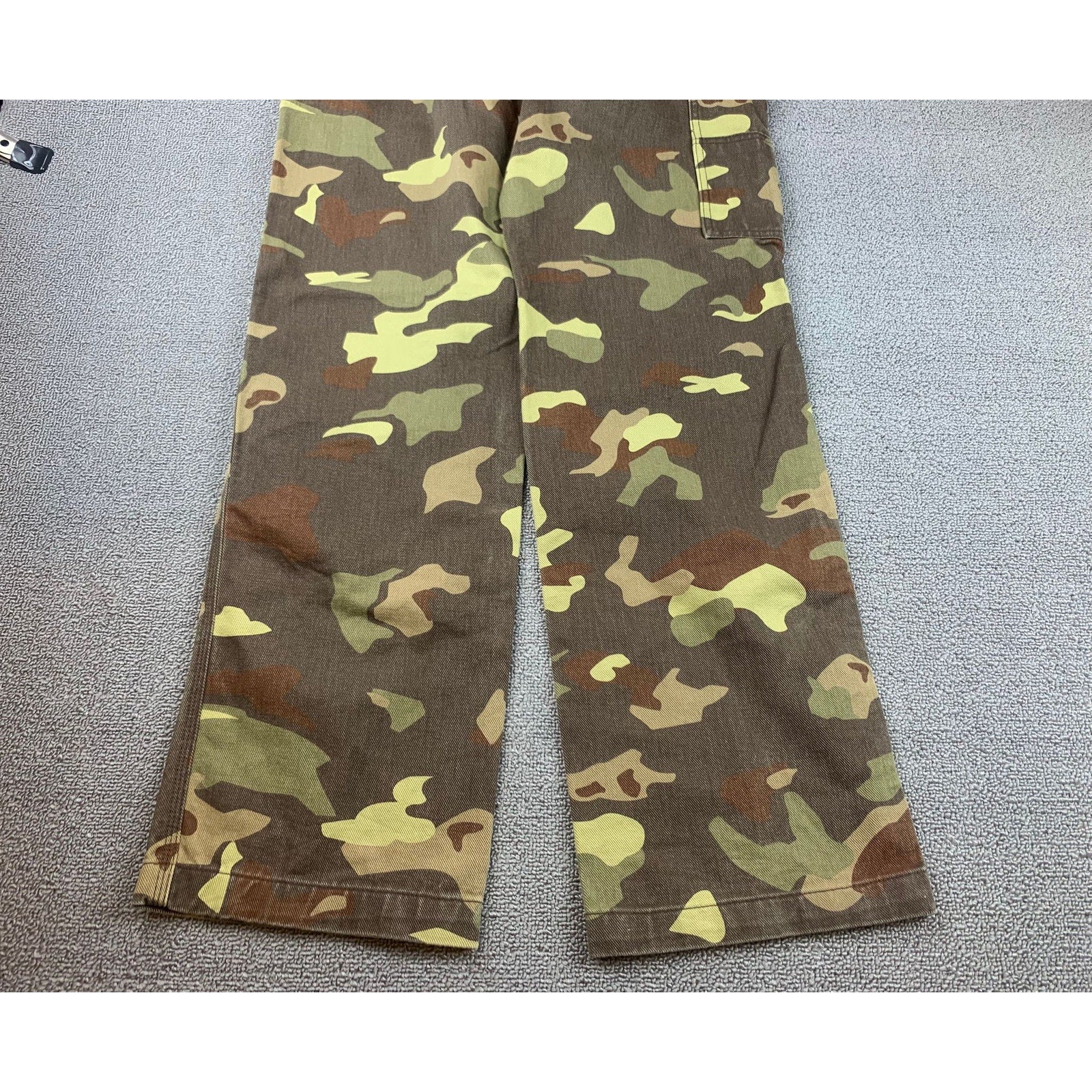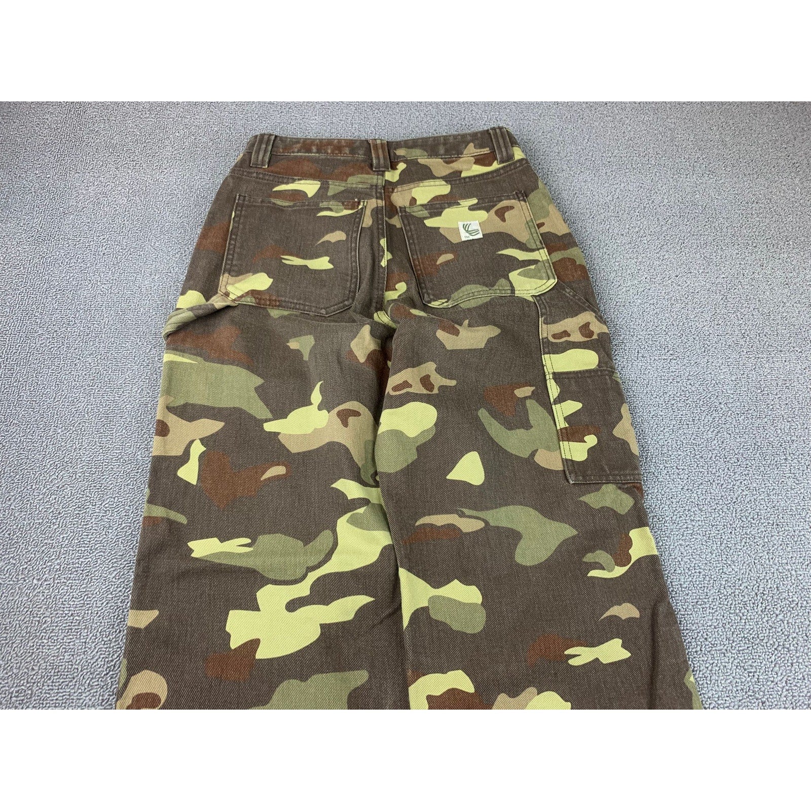 Classic camouflage straight leg pants in shades of green, tan, and brown. Rugged design with belt loops and side pockets, perfect for streetwear, casual styling, or workwear-inspired looks.