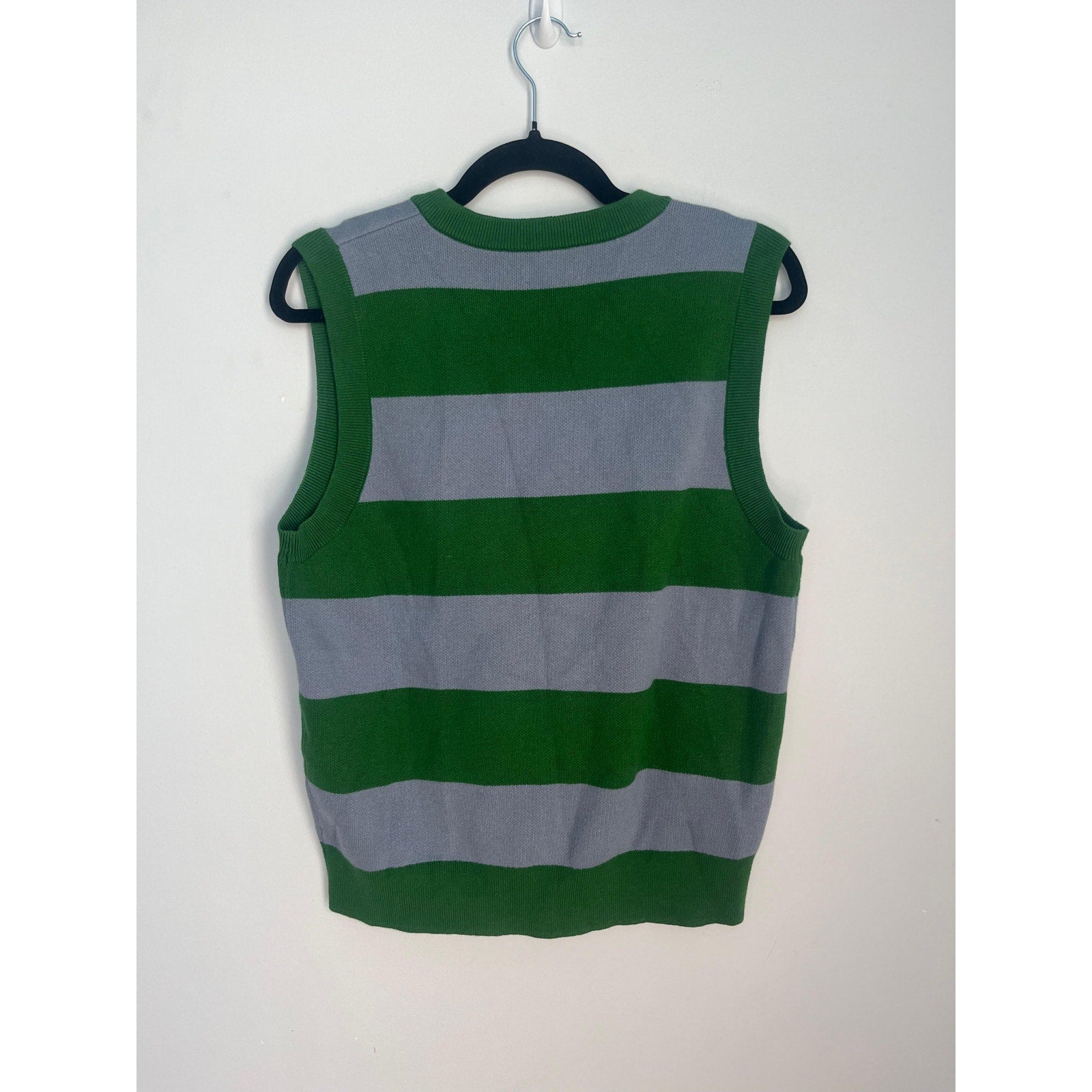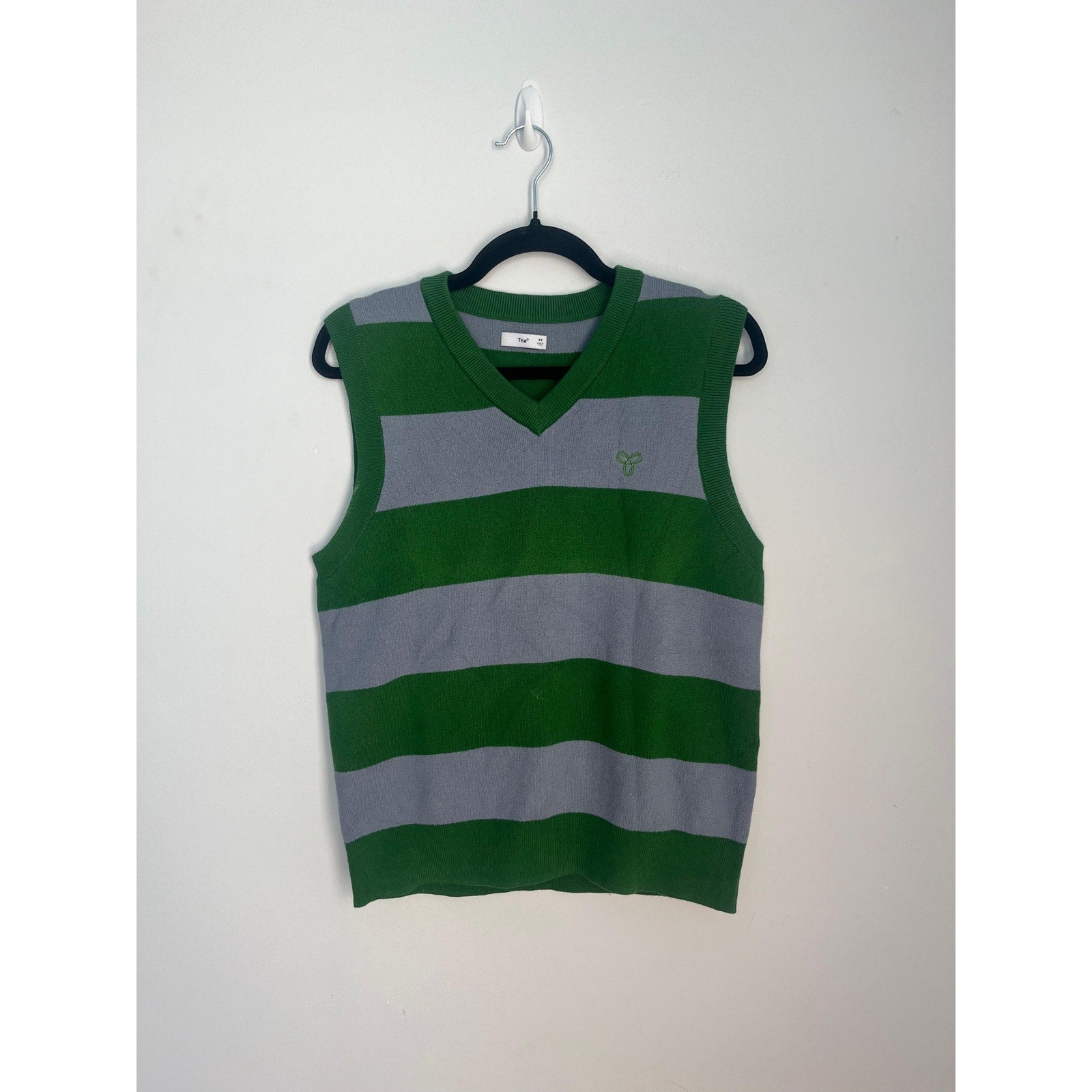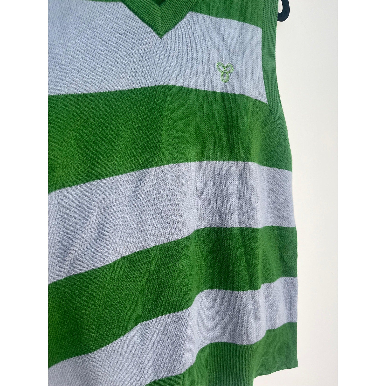 TNA striped knit sweater vest featuring bold green and gray block stripes, a V neckline, and ribbed hems. Preppy Y2K style, lightweight and versatile for layering.