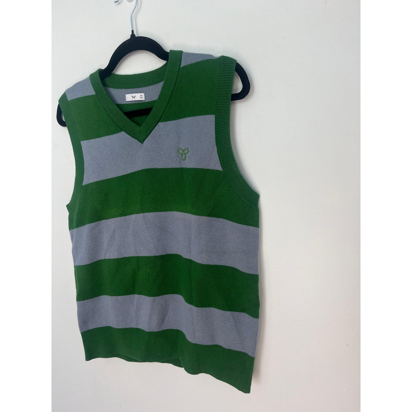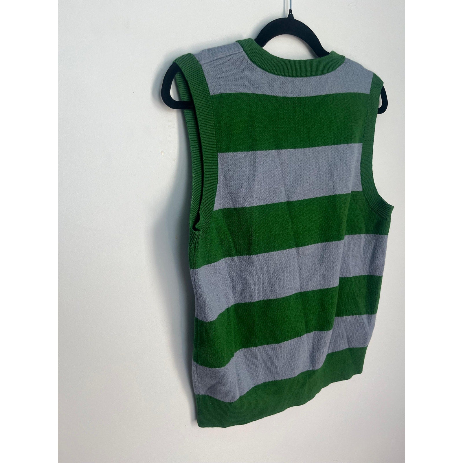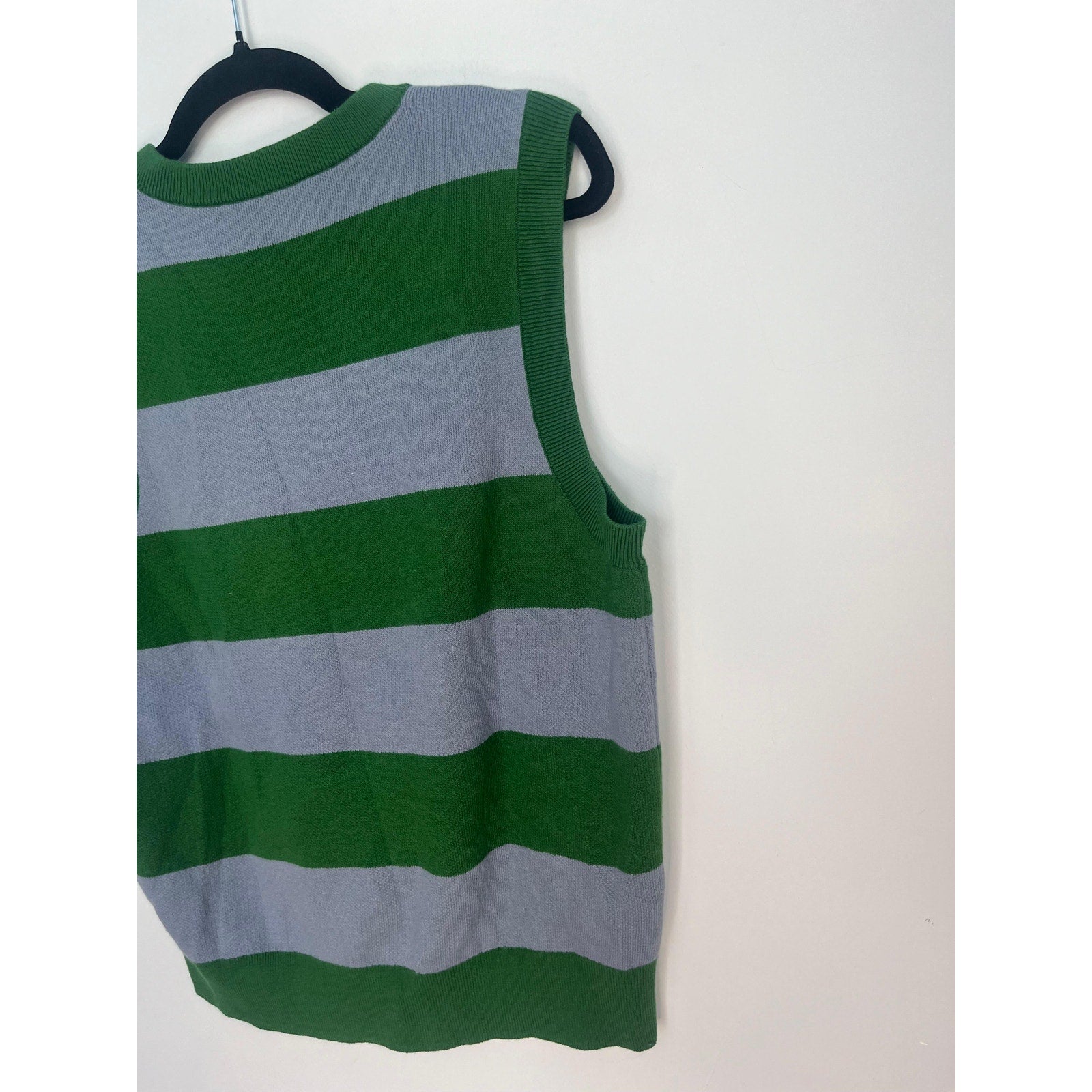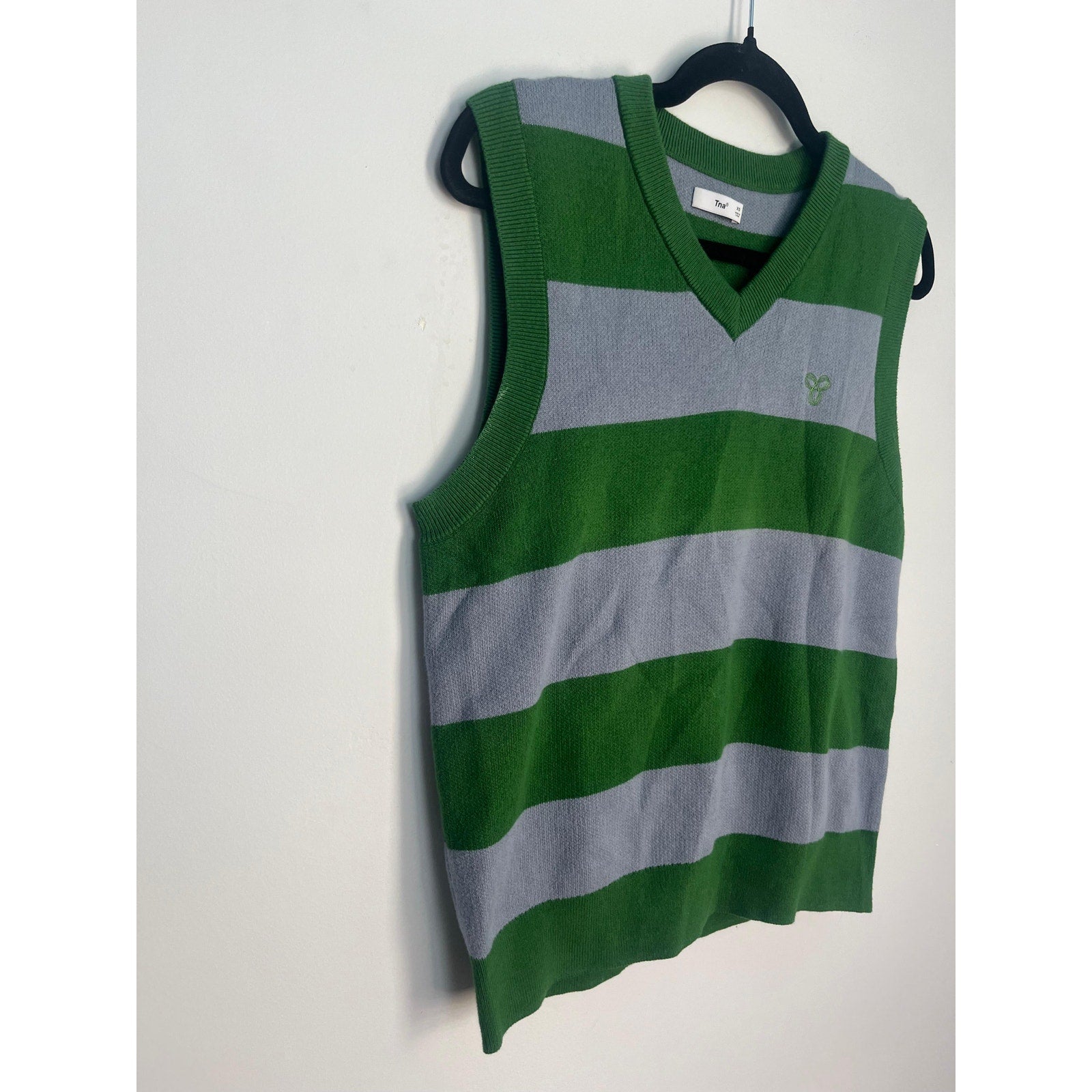 TNA striped knit sweater vest featuring bold green and gray block stripes, a V neckline, and ribbed hems. Preppy Y2K style, lightweight and versatile for layering.