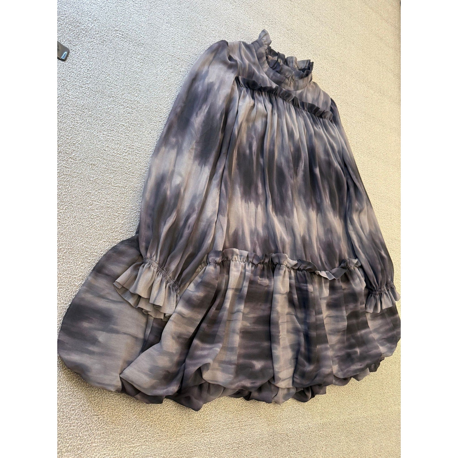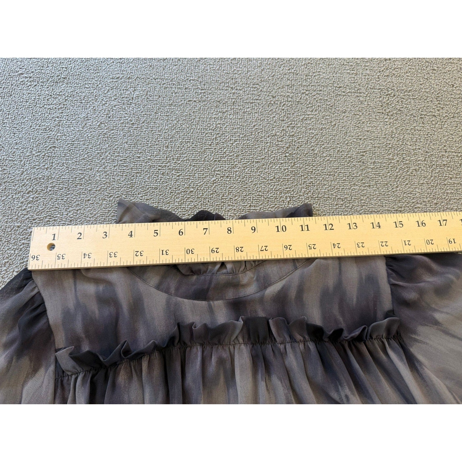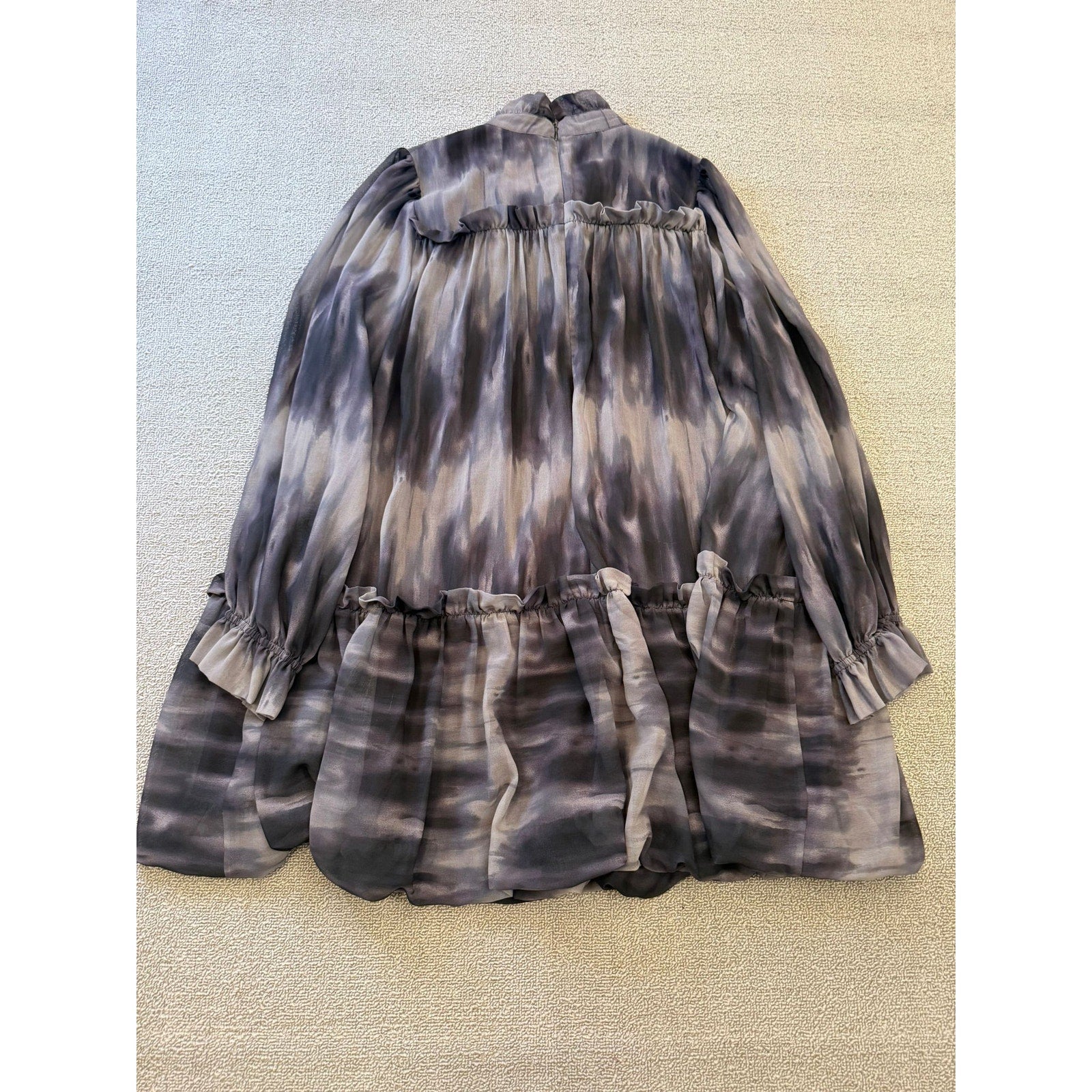 A dreamy tie-dye mini dress by Toccin x RTR in moody charcoal and gray tones, featuring a high ruffled neckline, long balloon sleeves with shirred cuffs, and a flouncy A-line hem. Lightweight, semi-sheer fabric with romantic, almost watercolor stripes; a playful yet elegant youth-driven Y2K aesthetic in size 10 with no visible flaws.