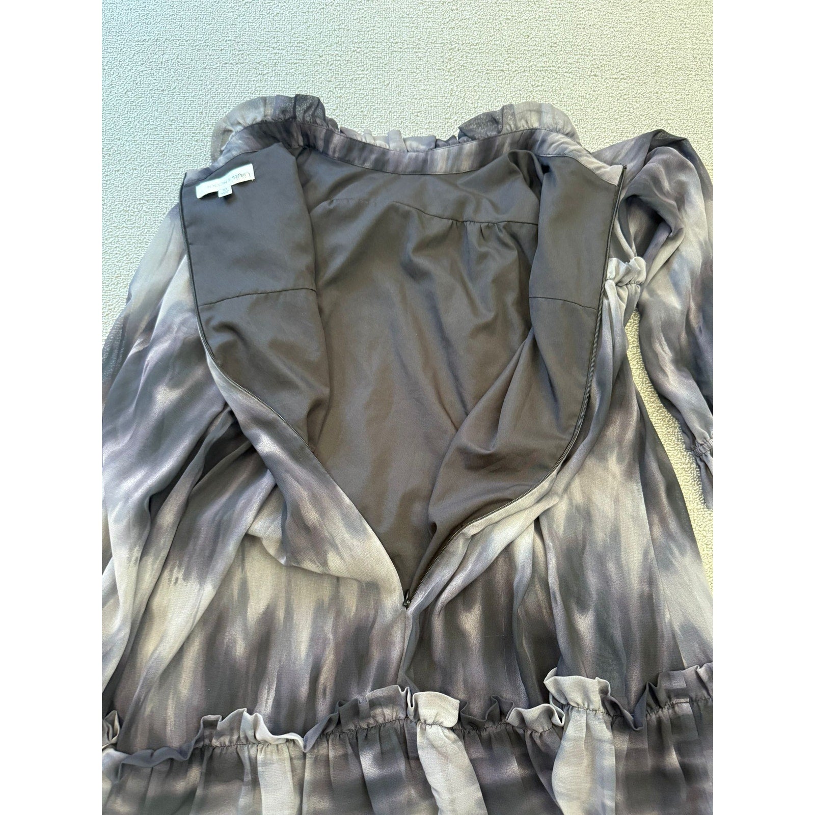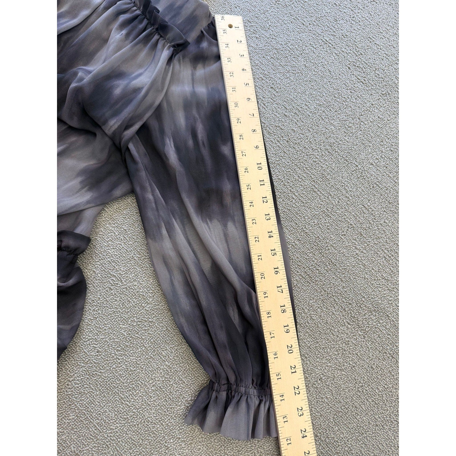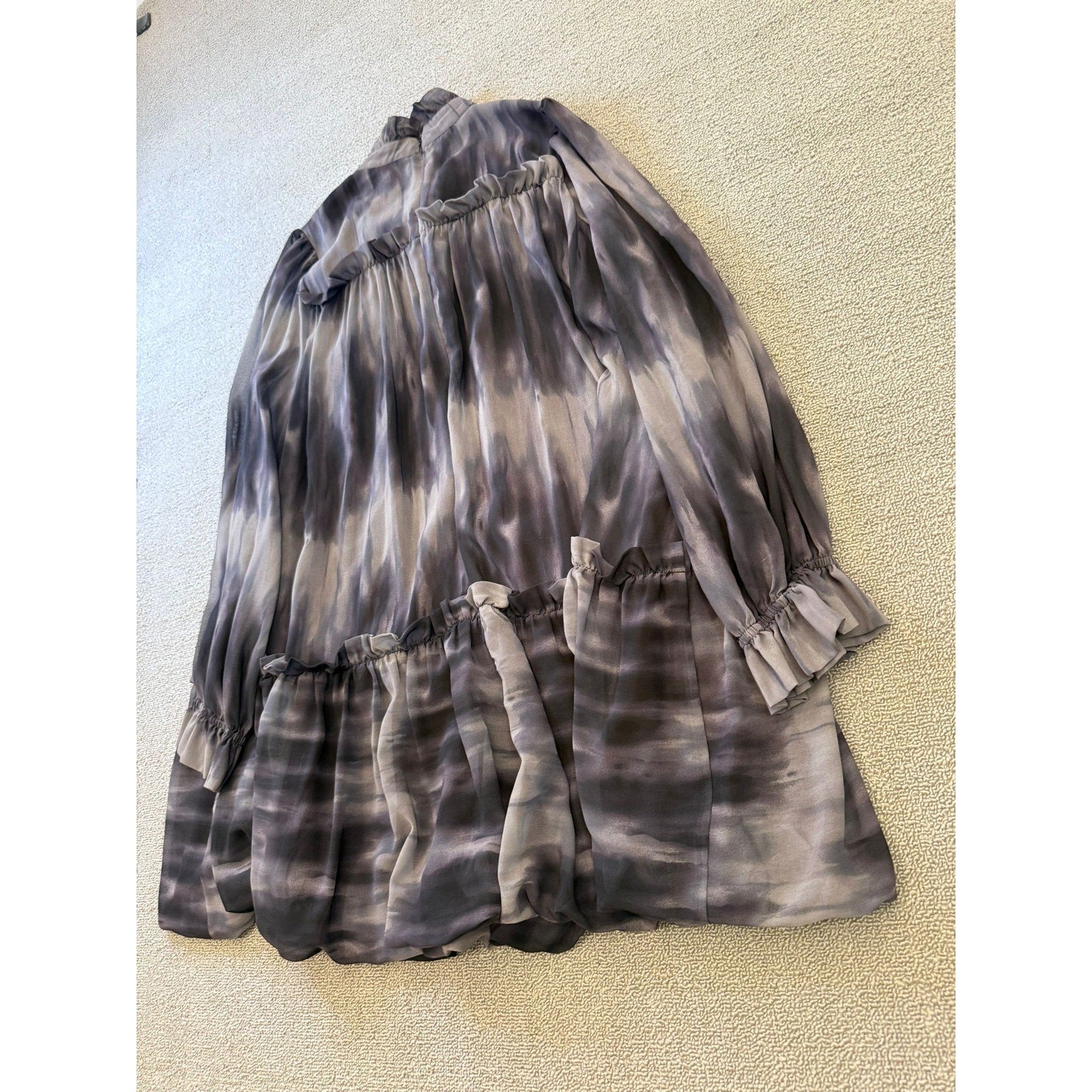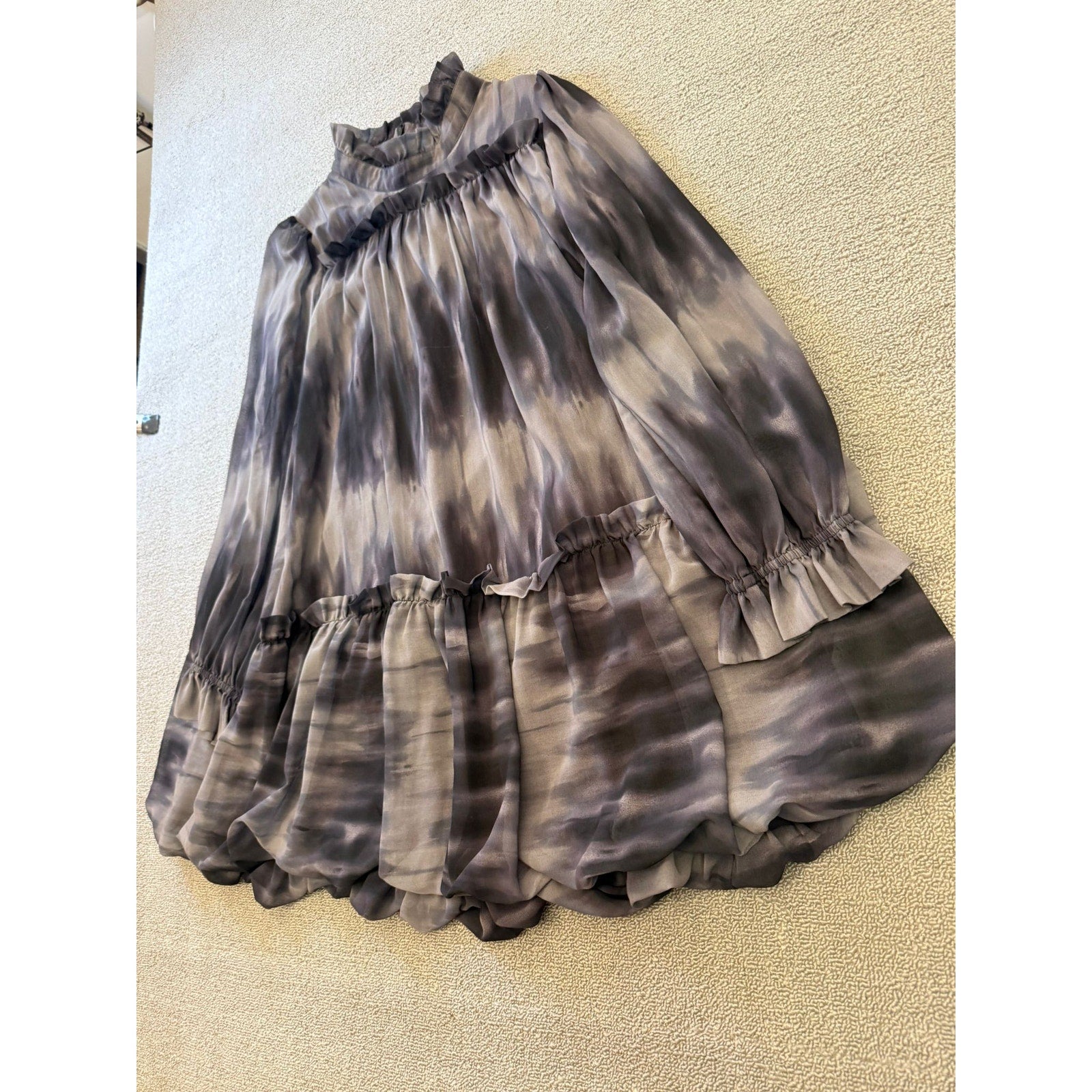 A dreamy tie-dye mini dress by Toccin x RTR in moody charcoal and gray tones, featuring a high ruffled neckline, long balloon sleeves with shirred cuffs, and a flouncy A-line hem. Lightweight, semi-sheer fabric with romantic, almost watercolor stripes; a playful yet elegant youth-driven Y2K aesthetic in size 10 with no visible flaws.