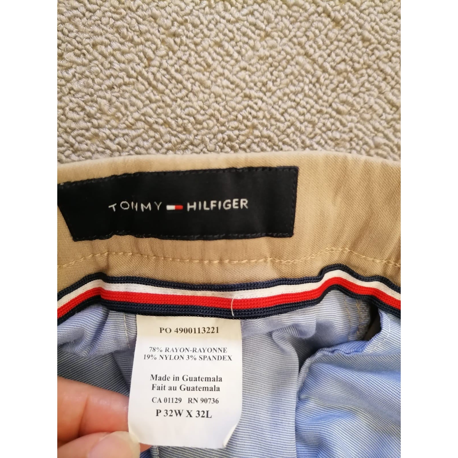 Men's slim/straight-fit Tommy Hilfiger chinos in khaki constructed from a comfortable blend of rayon, nylon, and spandex, offering soft stretch and ease of movement. Features include a mid-rise waist, zipper fly, and classic chino styling with belt loops and front/back pockets.