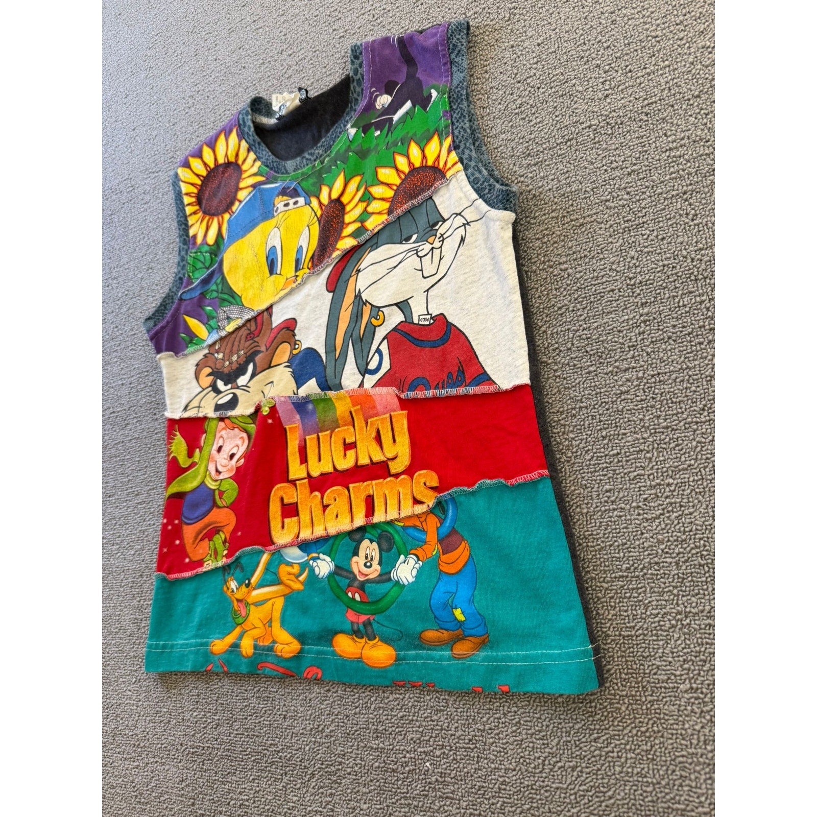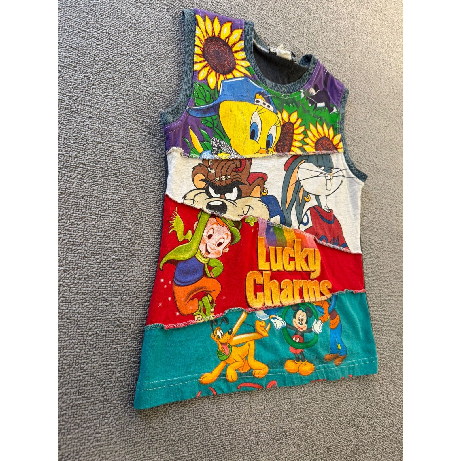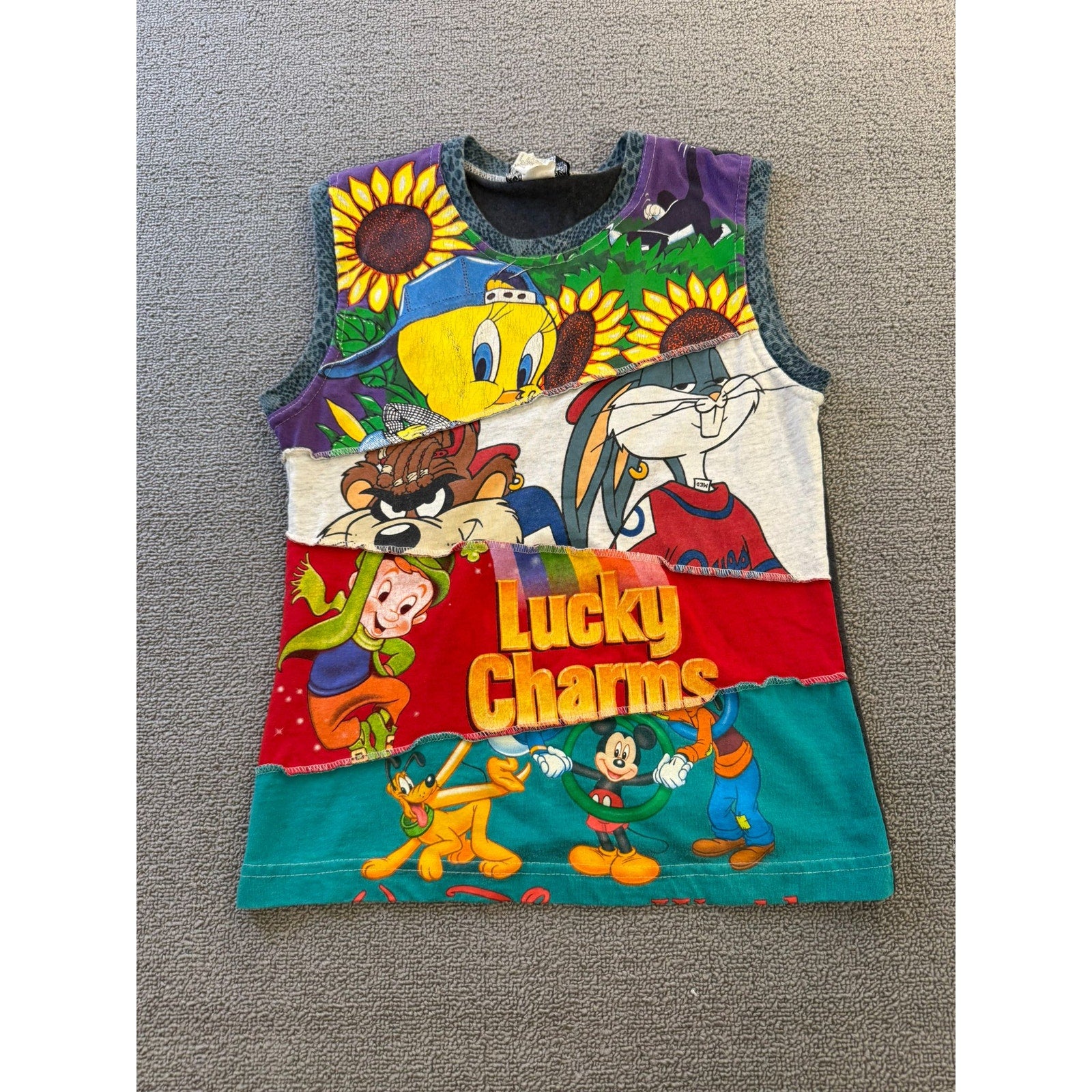 Bold and colorful patchwork sleeveless tank featuring a mix of Looney Tunes, Disney, and Lucky Charms graphics. Unique collage style with Tweety, Bugs Bunny, Taz, Mickey Mouse, Pluto, and Lucky the Leprechaun across panels. Retro Y2K pop culture aesthetic, perfect as a statement piece.