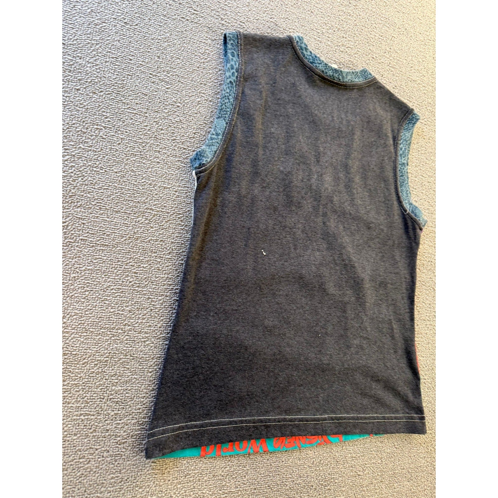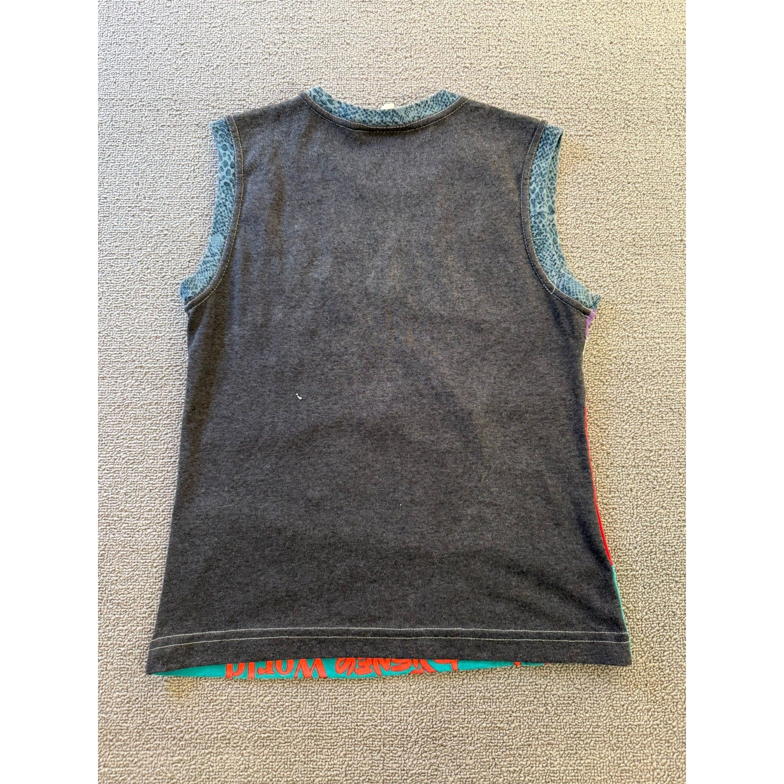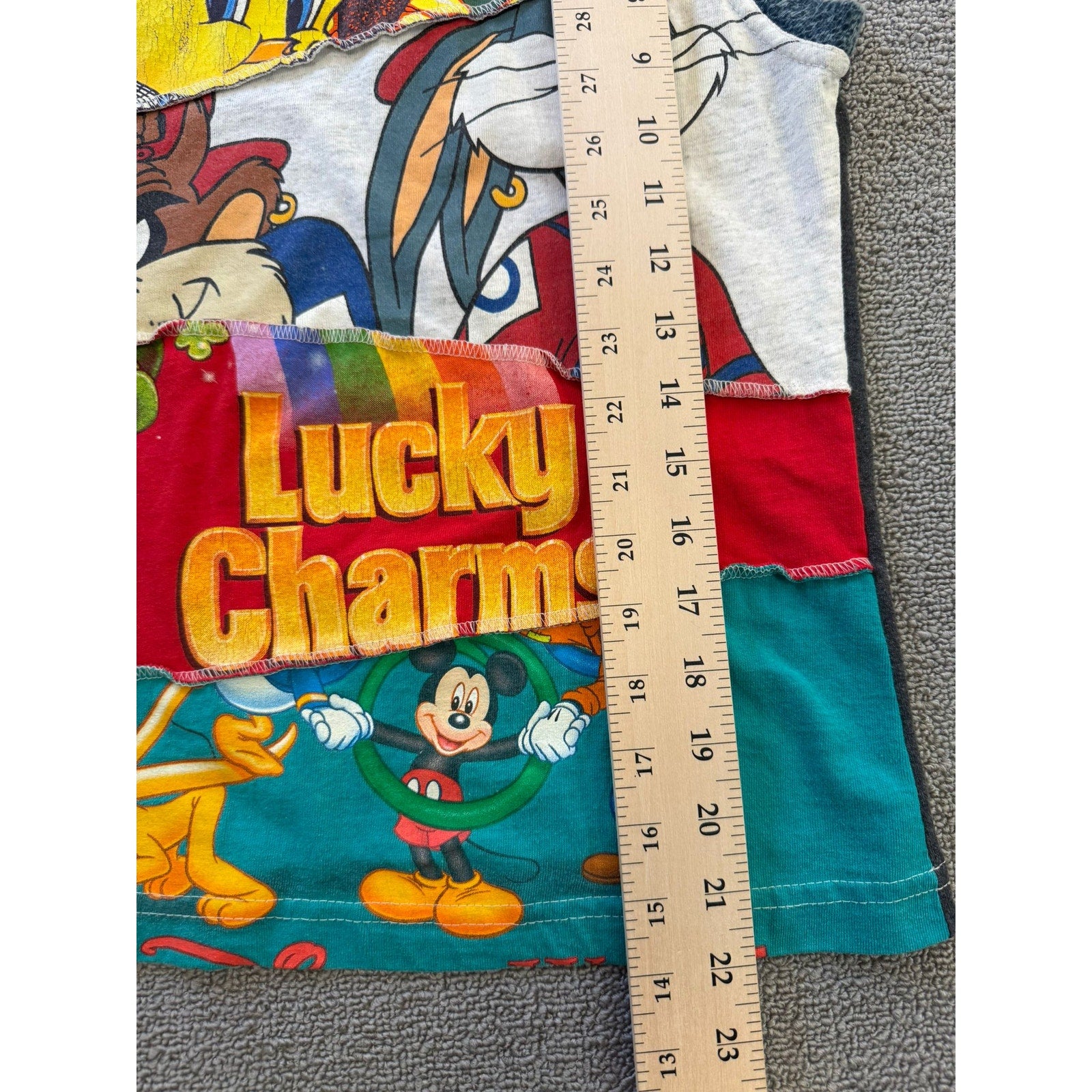 Bold and colorful patchwork sleeveless tank featuring a mix of Looney Tunes, Disney, and Lucky Charms graphics. Unique collage style with Tweety, Bugs Bunny, Taz, Mickey Mouse, Pluto, and Lucky the Leprechaun across panels. Retro Y2K pop culture aesthetic, perfect as a statement piece.