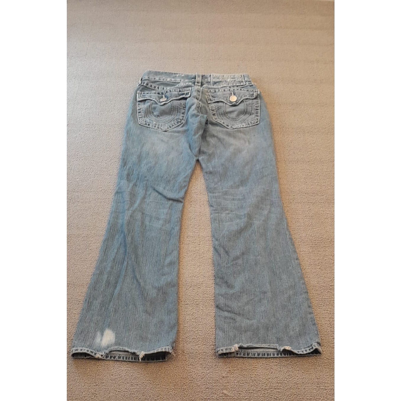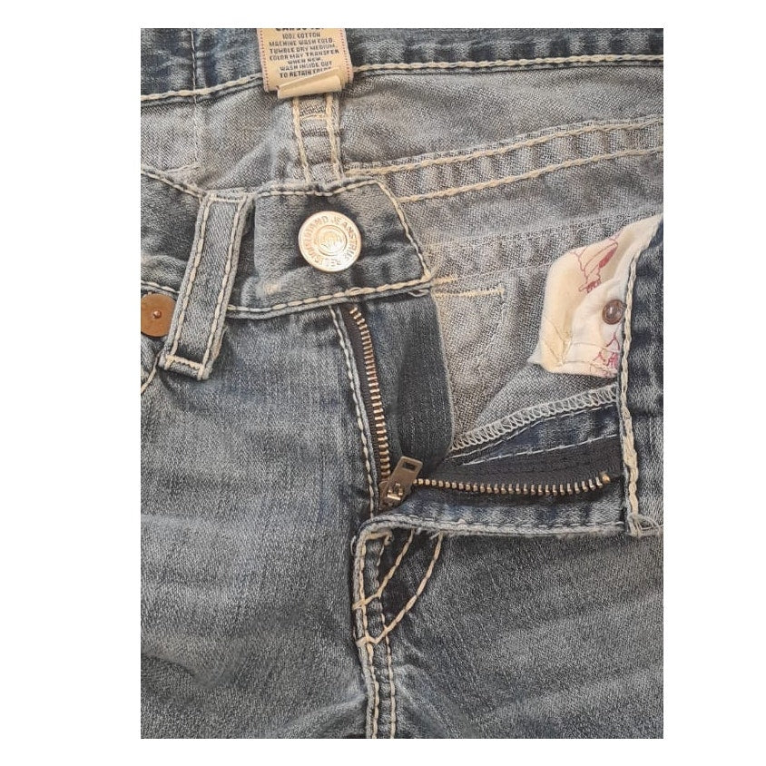 Vintage True Religion bootcut jeans in light wash denim featuring deliberate distressing at the knees, signature flap pockets, and contrast stitching—classic early-2000s Y2K aesthetic. Made in USA tag adds vintage appeal and authenticity.