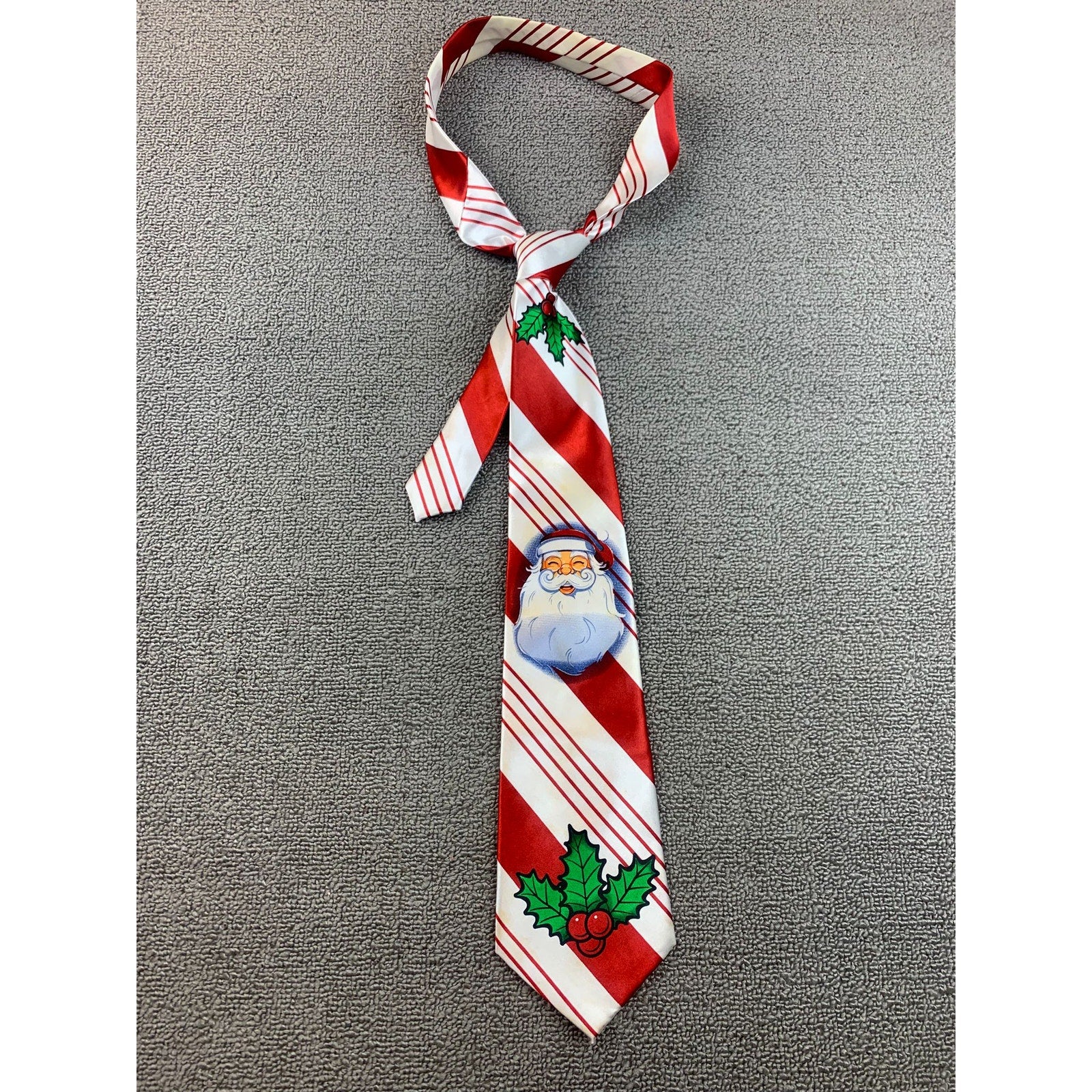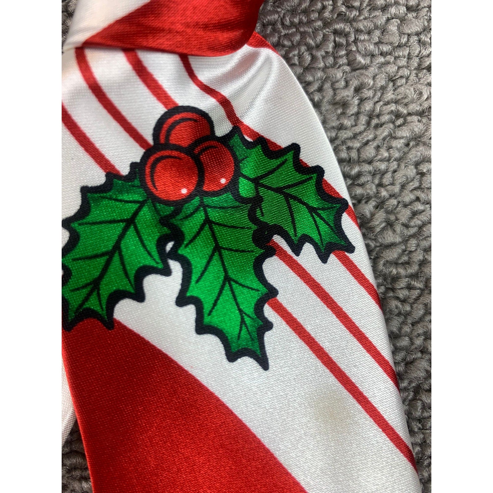 Fun and festive Christmas necktie in a red-and-white striped candy-cane pattern, embellished with cheerful Santa faces and holly clusters—perfect for holiday parties, seasonal wear, or themed events.