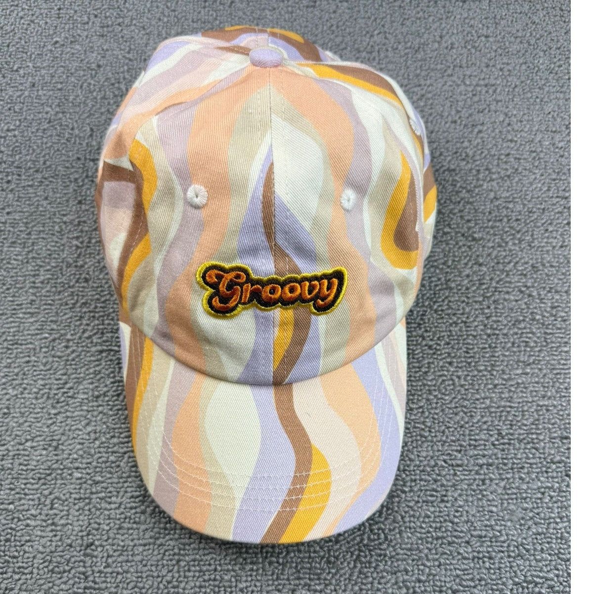 A multi-colored baseball cap featuring a wavy, retro pattern. The front is embroidered with the word "Groovy".