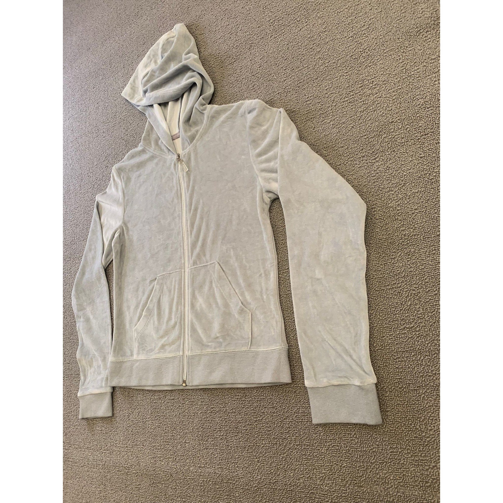 This Verona hoodie features a soft velour-like fabric in a light pastel gray with a full zip front, split kangaroo pockets, and ribbed cuffs and hem. A cozy throwback piece perfect for layering, lounging, or channeling Y2K casual streetwear style.