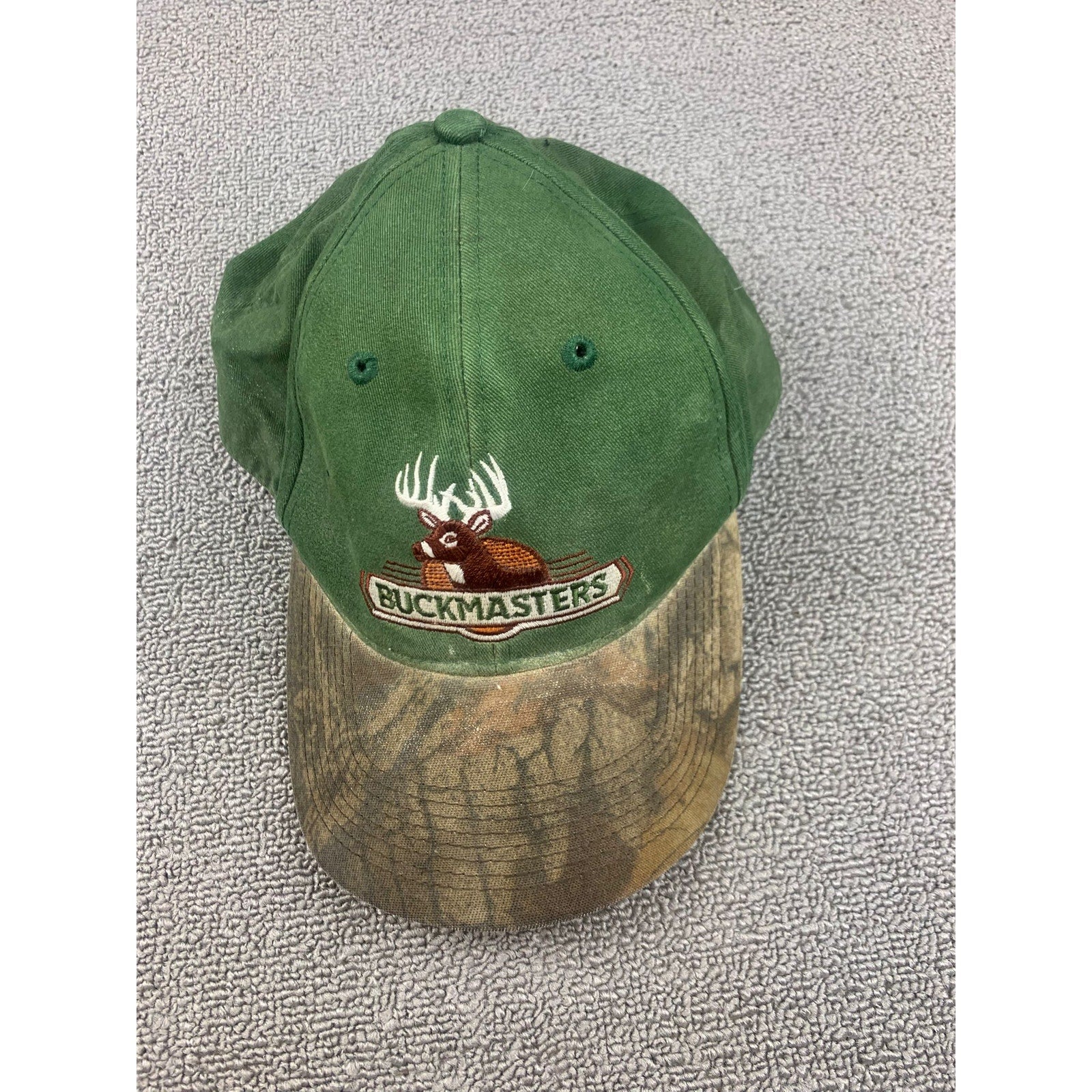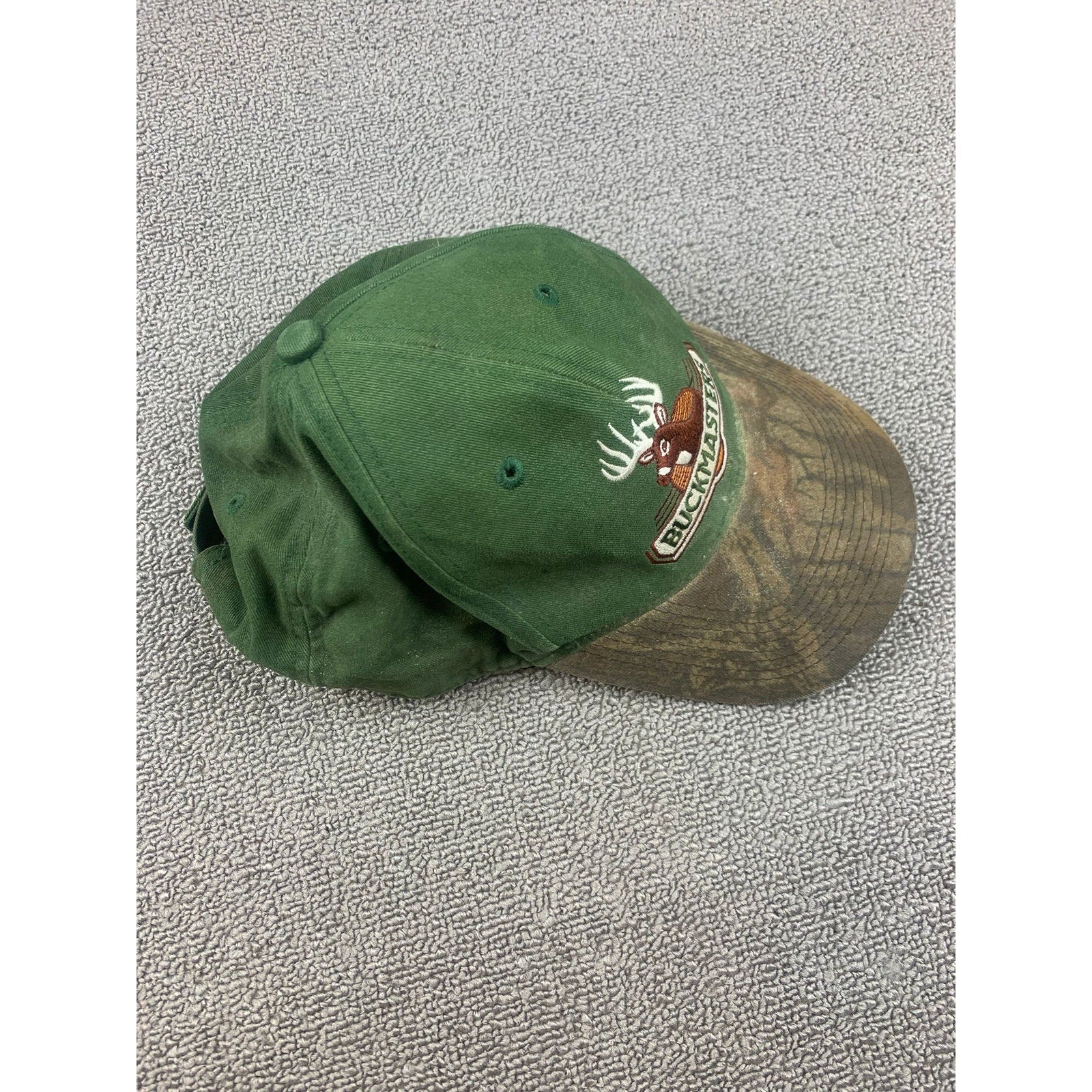 Vintage Buckmasters hunting cap featuring embroidered buck logo on the front. Classic green crown with camouflage print bill. Adjustable back closure.