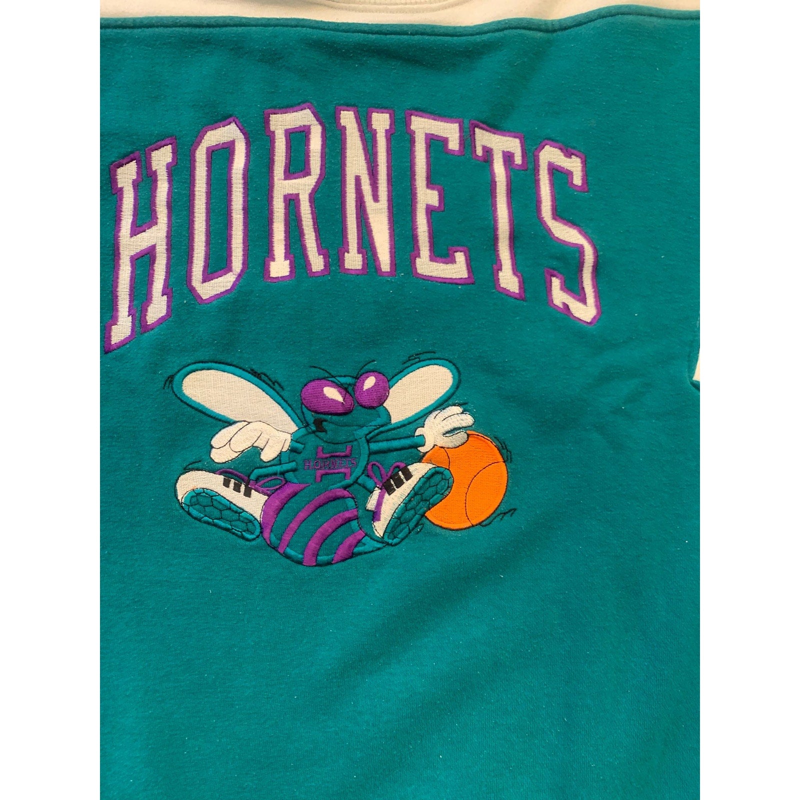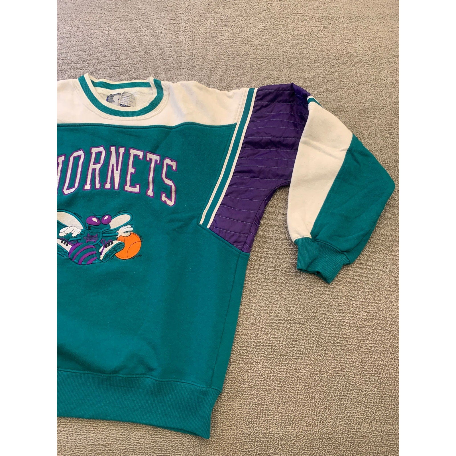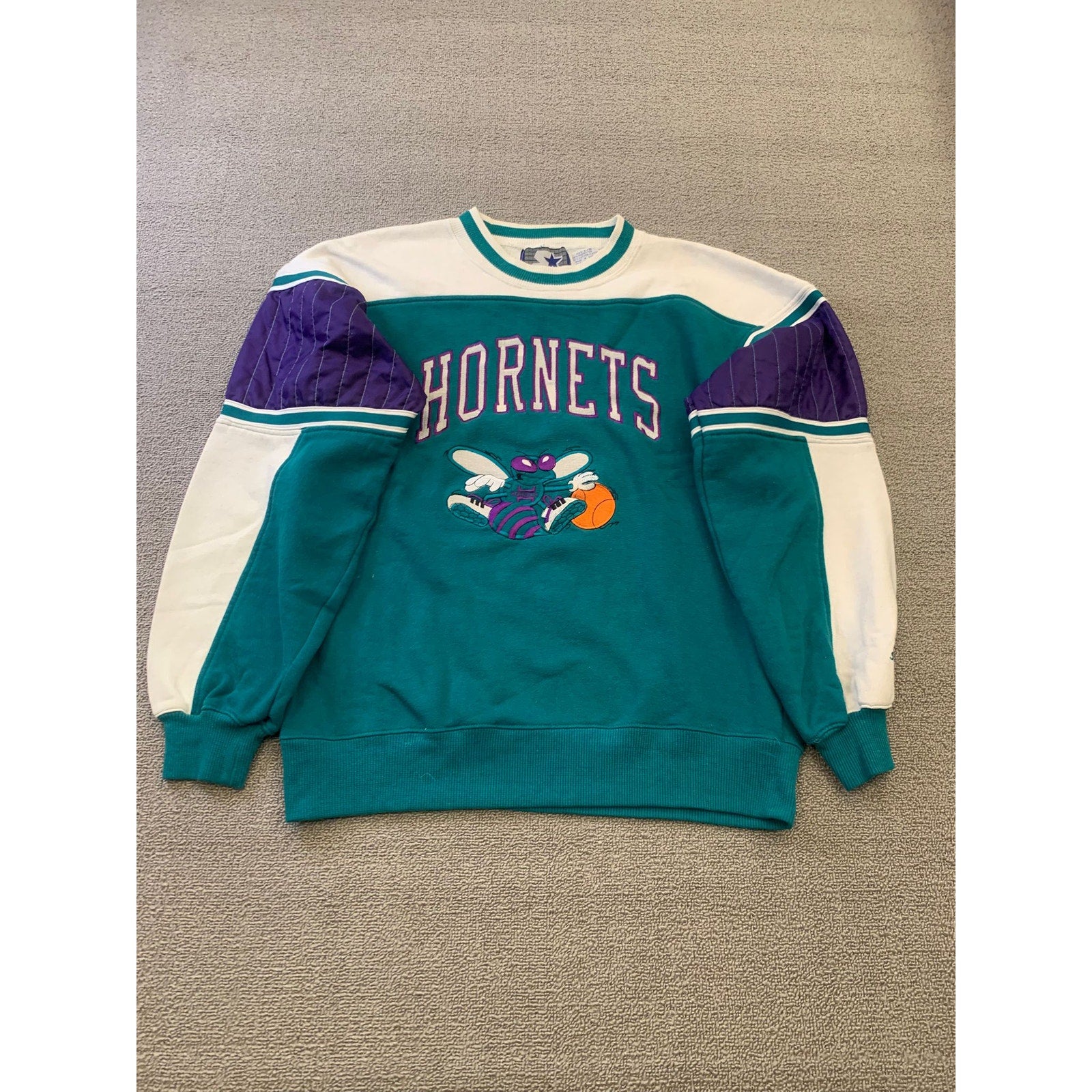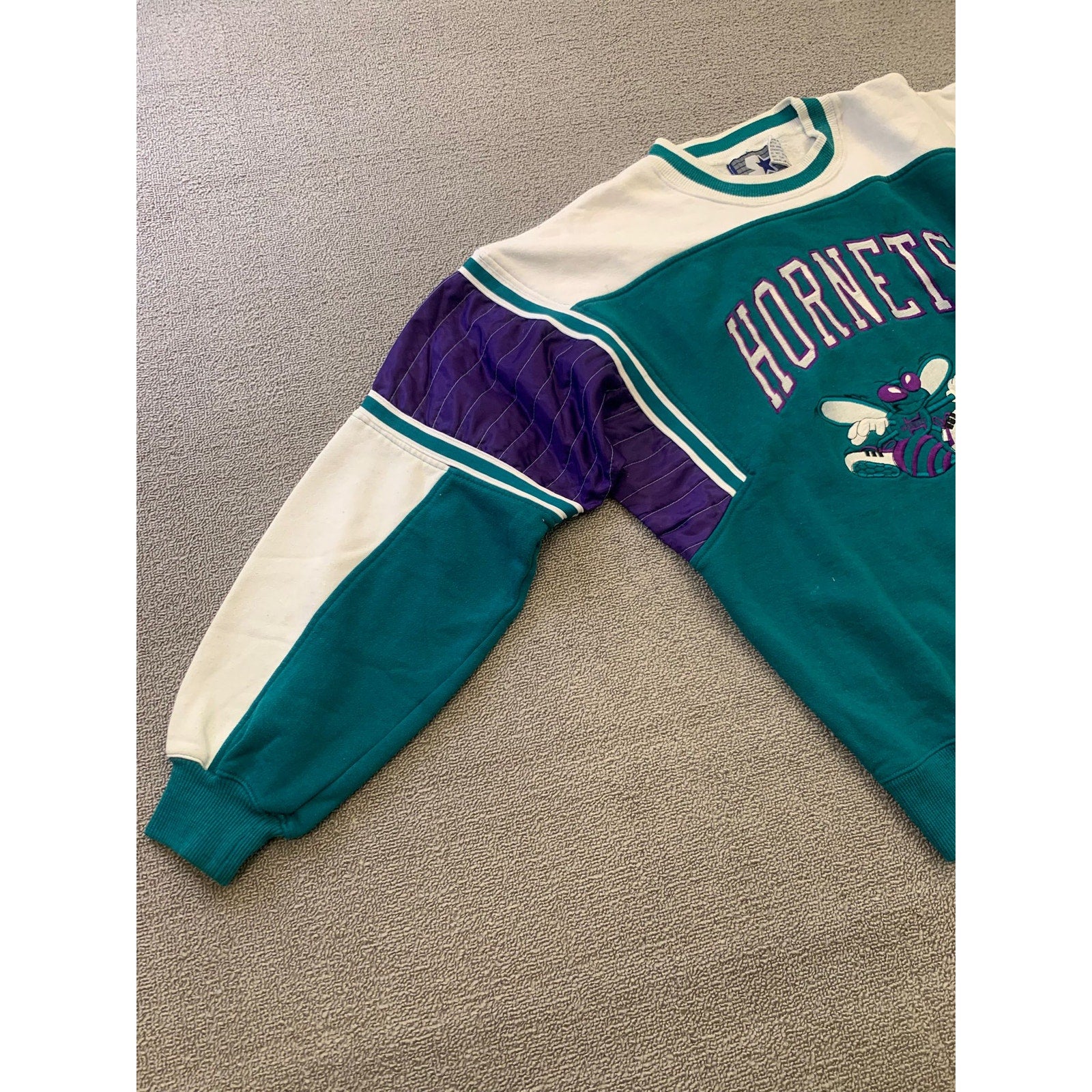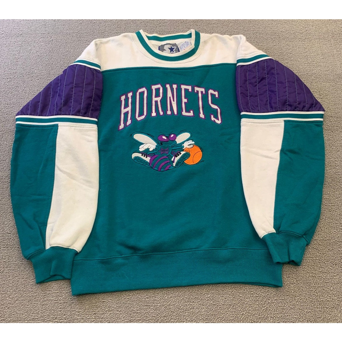 Vintage Starter sweatshirt in teal with bold "Hornets" team text and the original mascot graphic, complemented by purple and white paneling on the shoulders and sleeves.