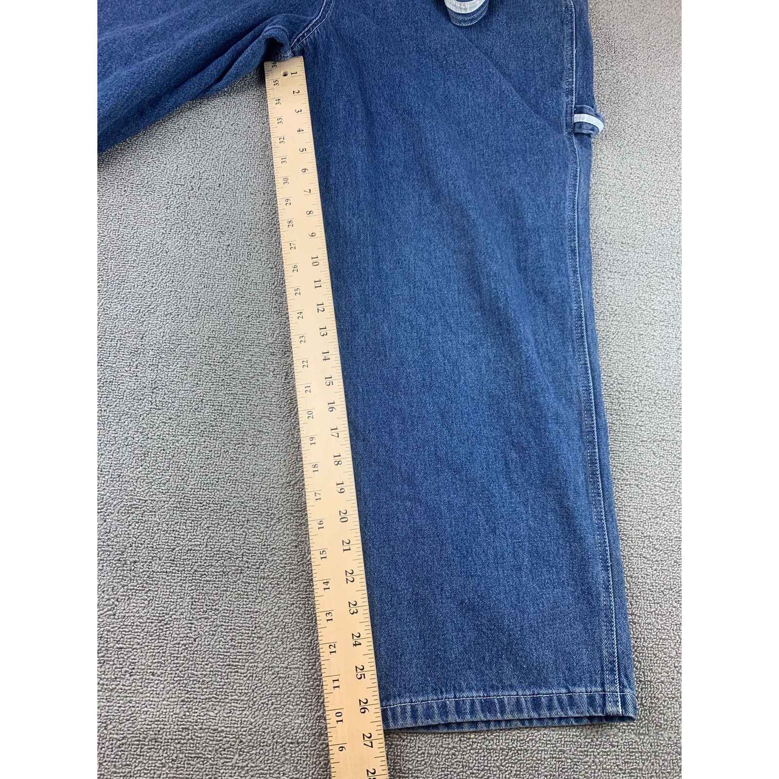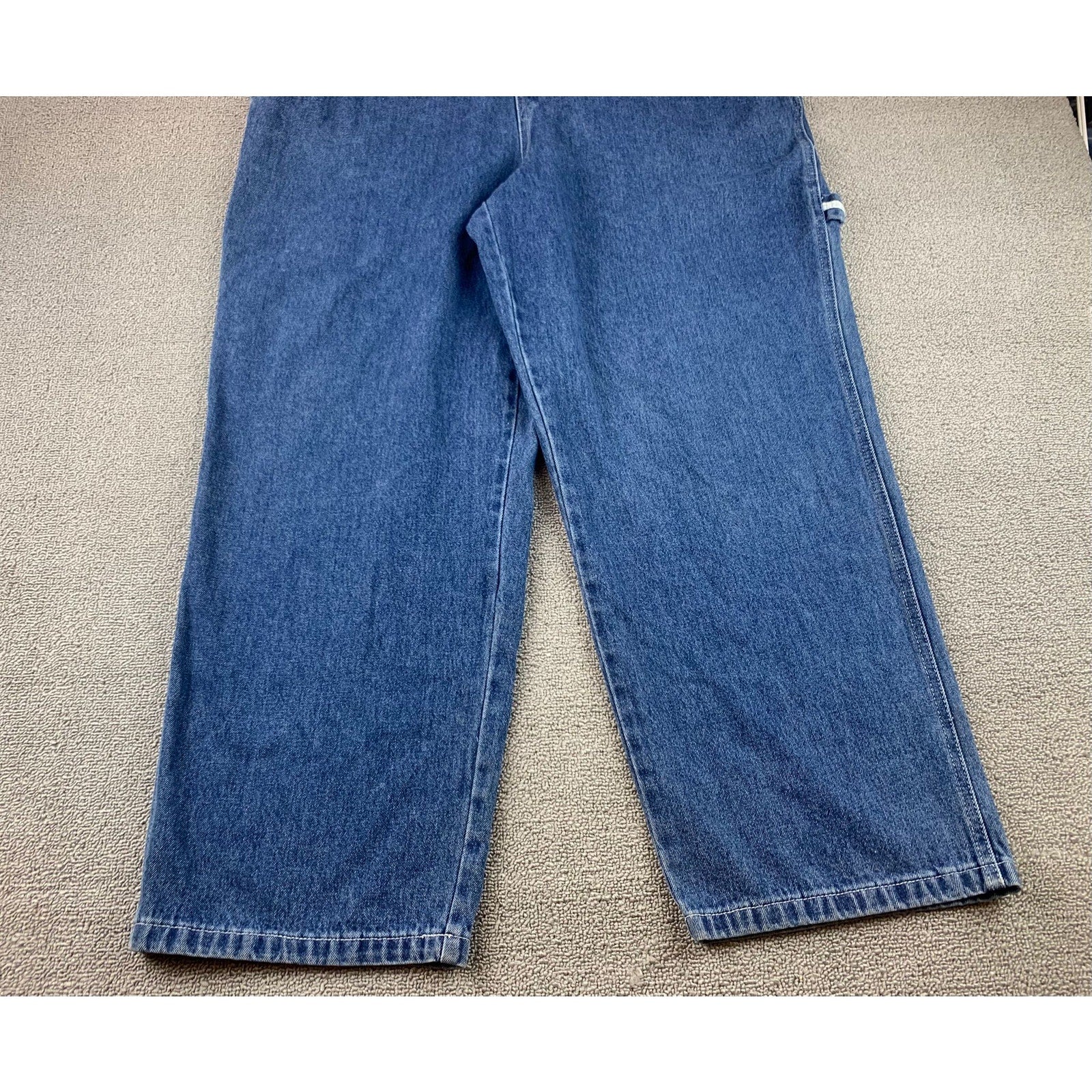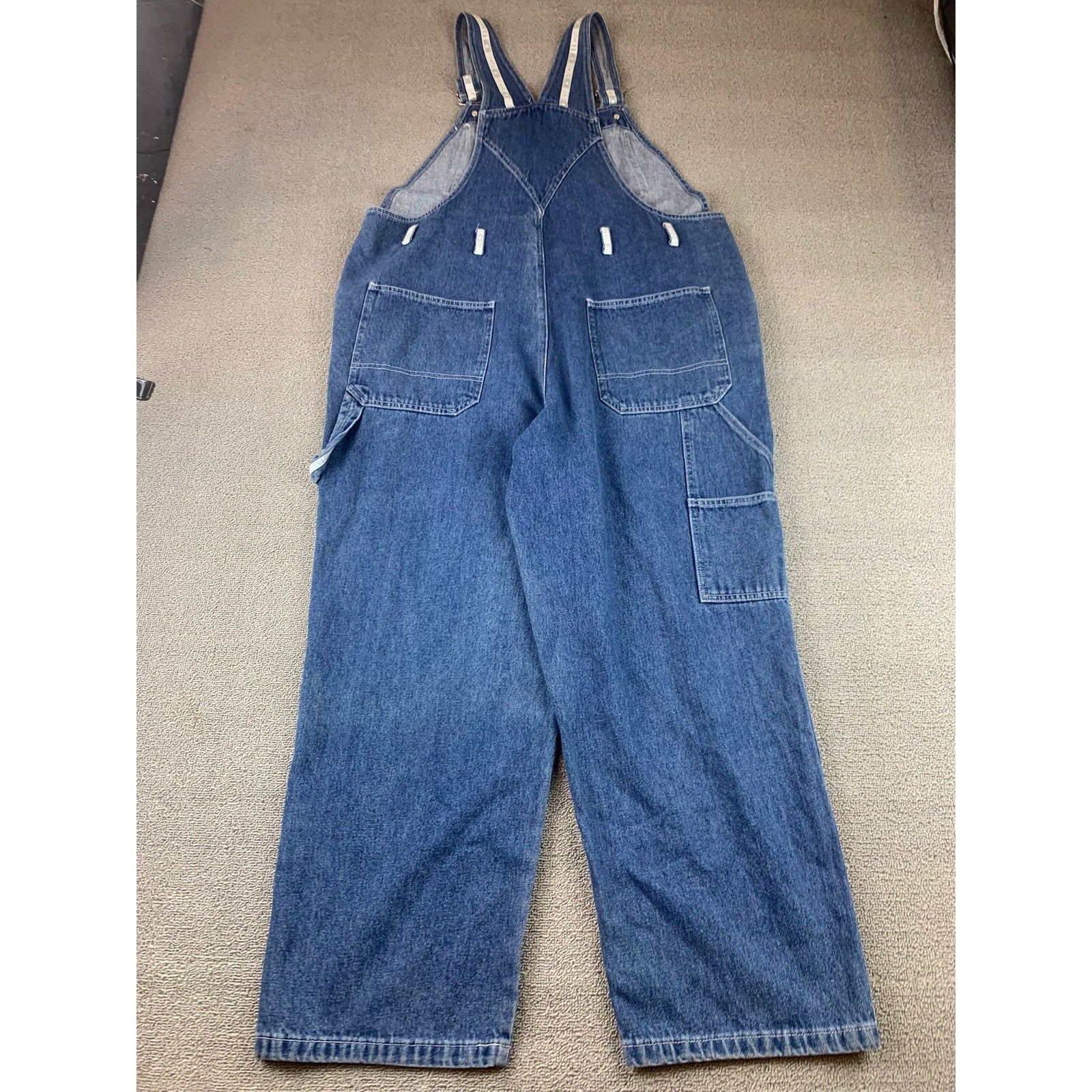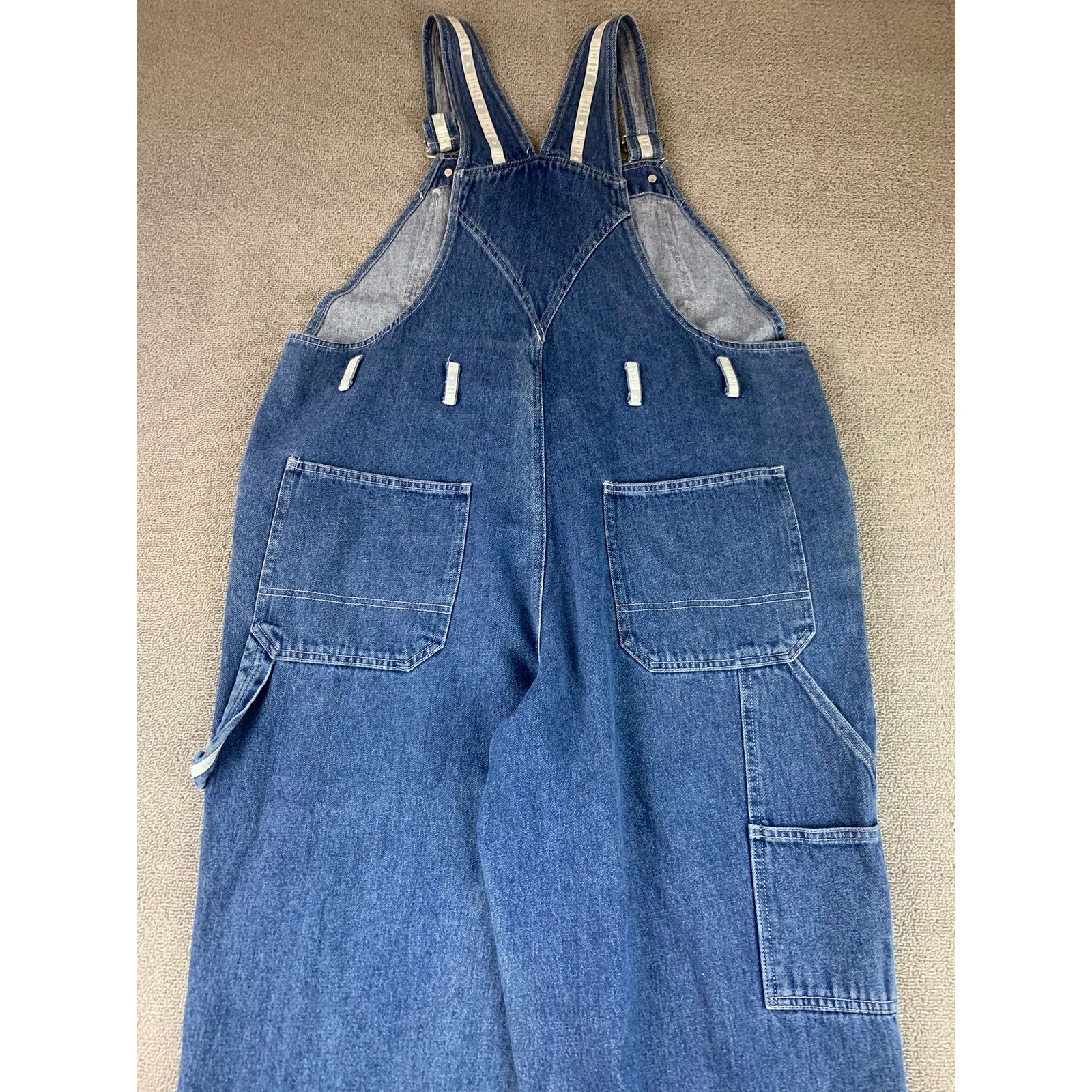 Vintage Disney Catalog denim bib overalls with large MICKEY chest patch and contrast stitching. Classic carpenter details with utility pockets and hammer loop; relaxed straight leg in medium indigo. Made in Macau, material made of cotton.