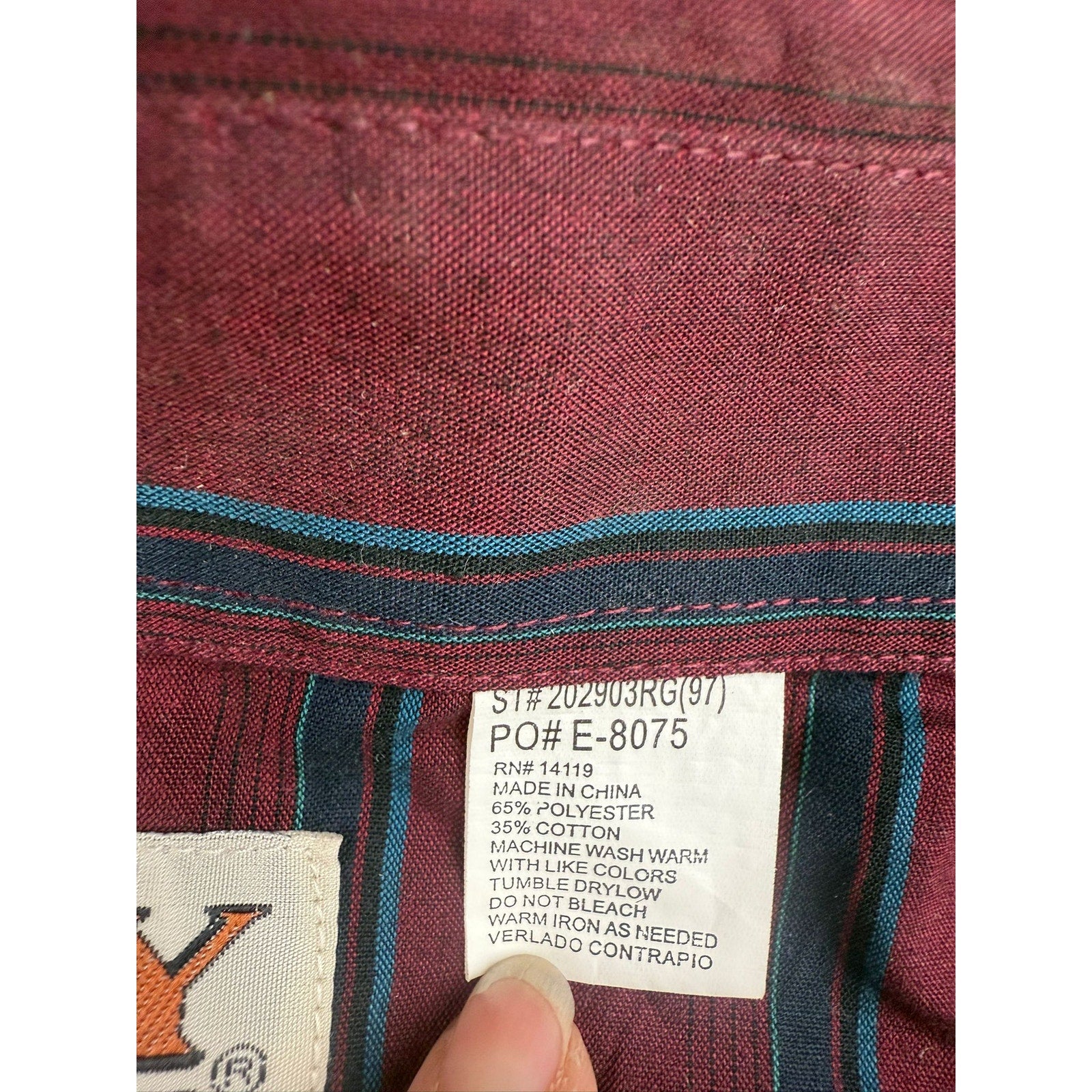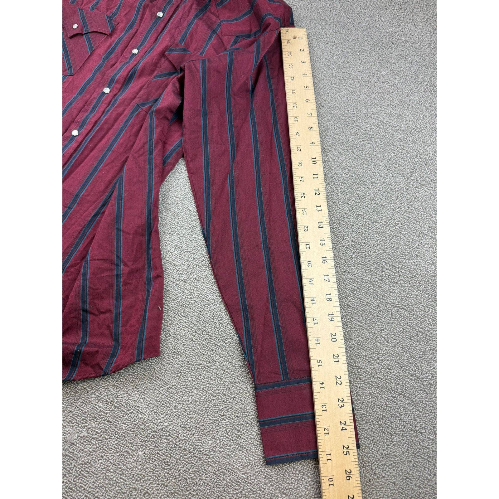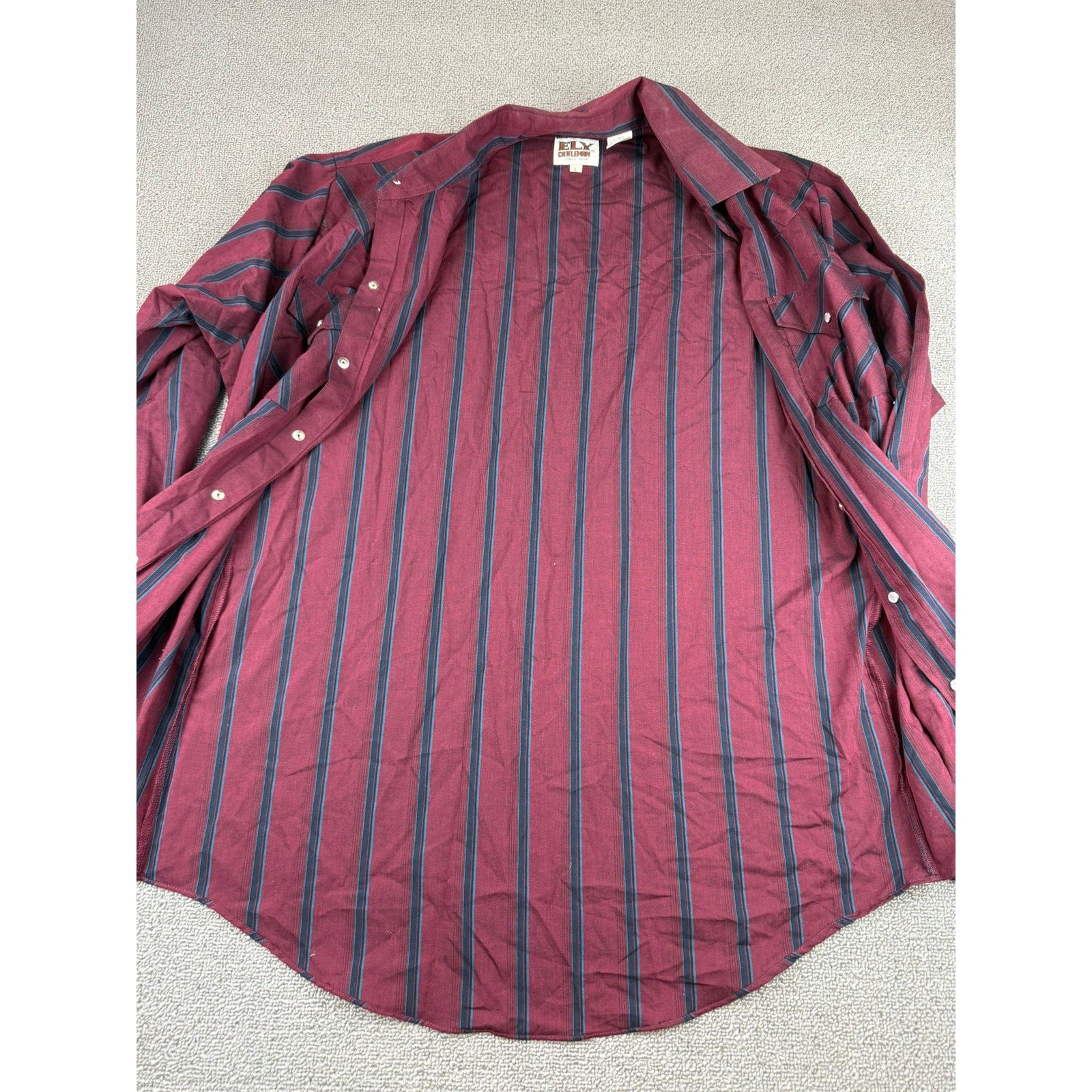 Classic Ely Cattleman long sleeve western shirt in burgundy with black and teal vertical stripes. Features pearl snaps, pointed front and back yokes, dual flap pockets, three-snap cuffs, and a curved hem—easy cowboycore staple.