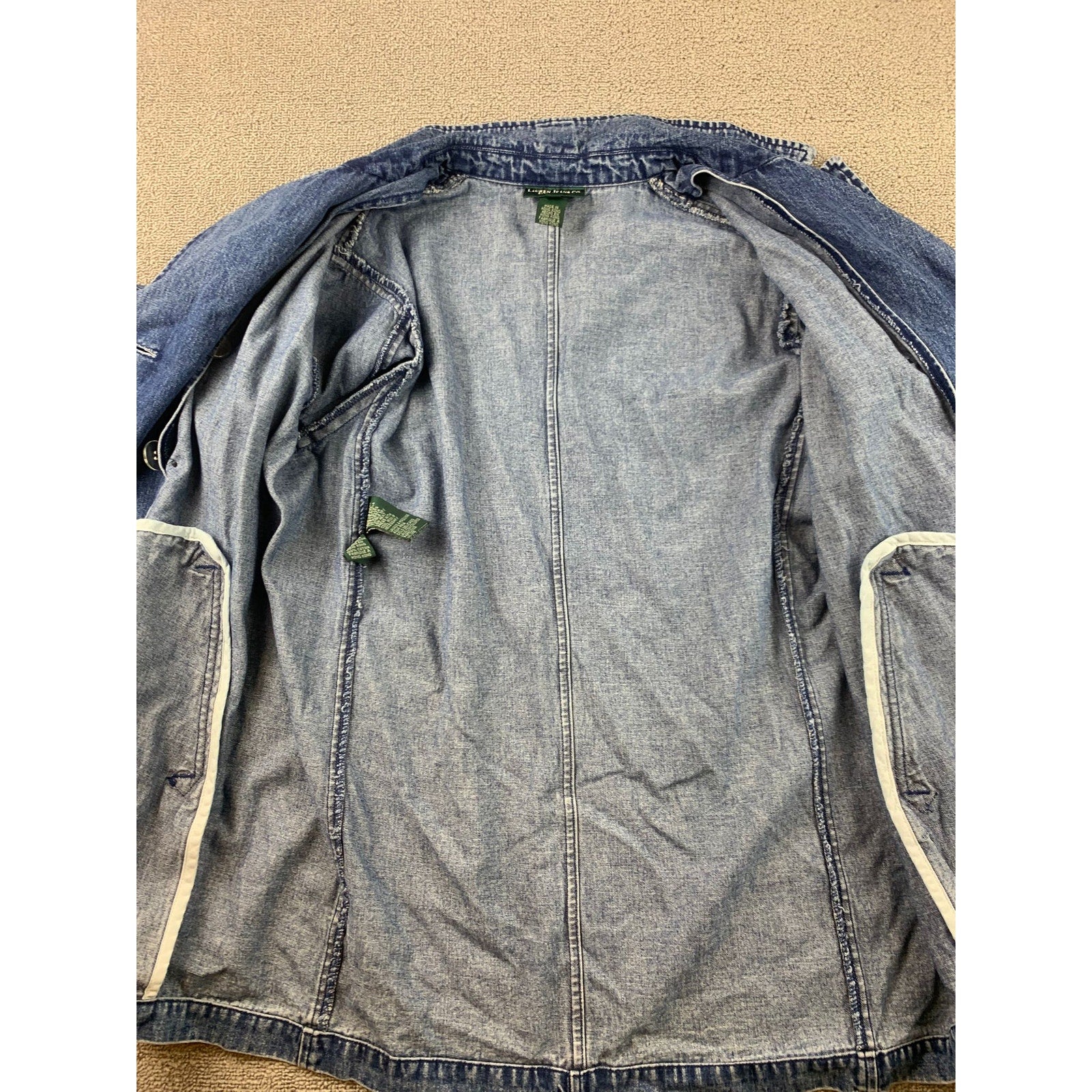 Classic Lauren Jeans Co Ralph Lauren denim peacoat style jacket with notched lapels, button front, and slanted welt pockets. Green “Lauren Jeans Co Ralph Lauren” tag.