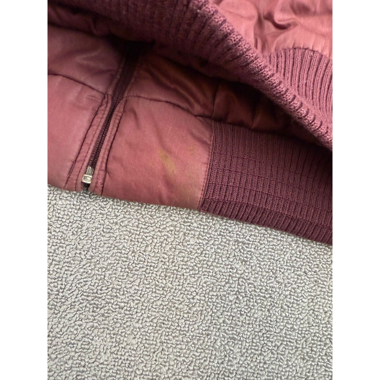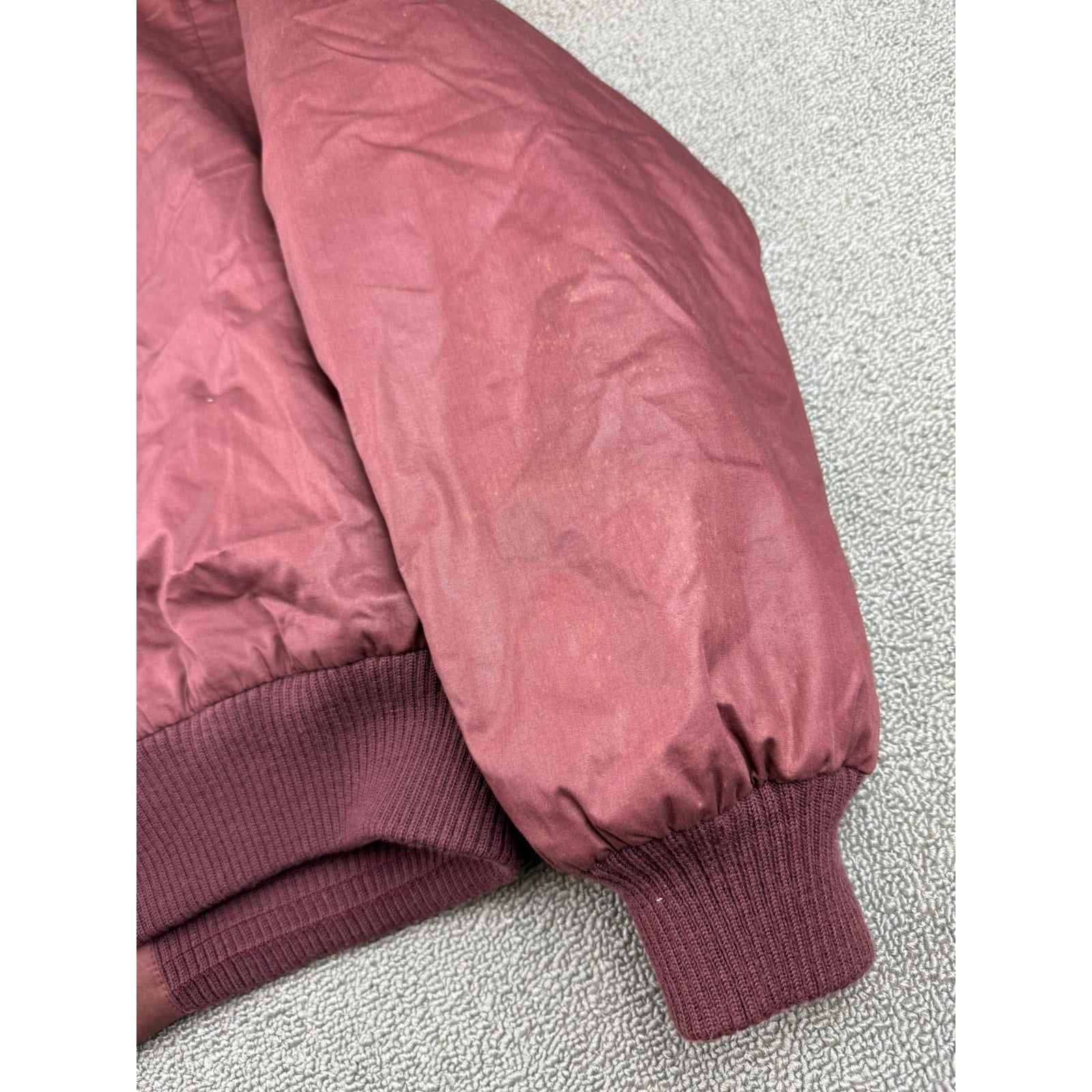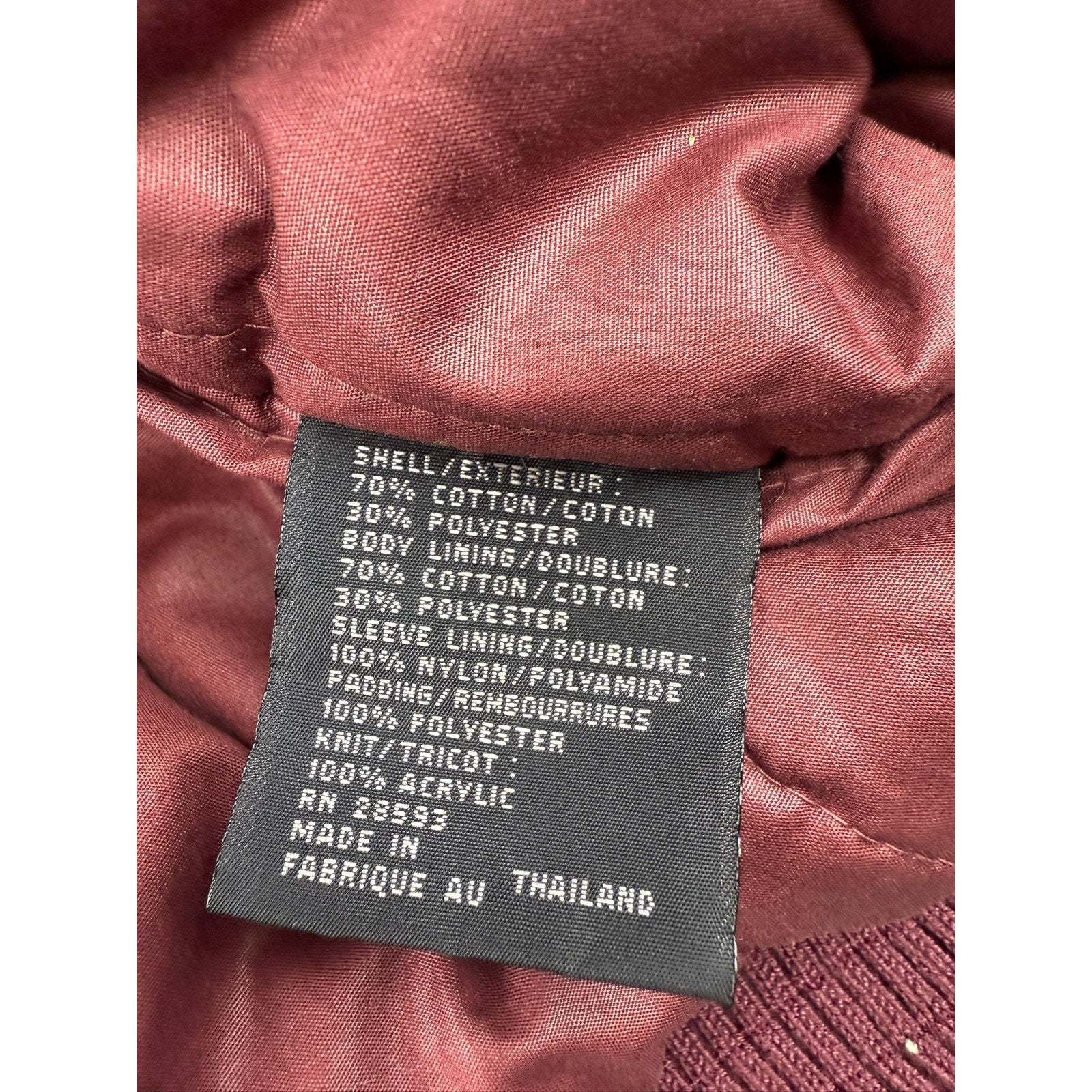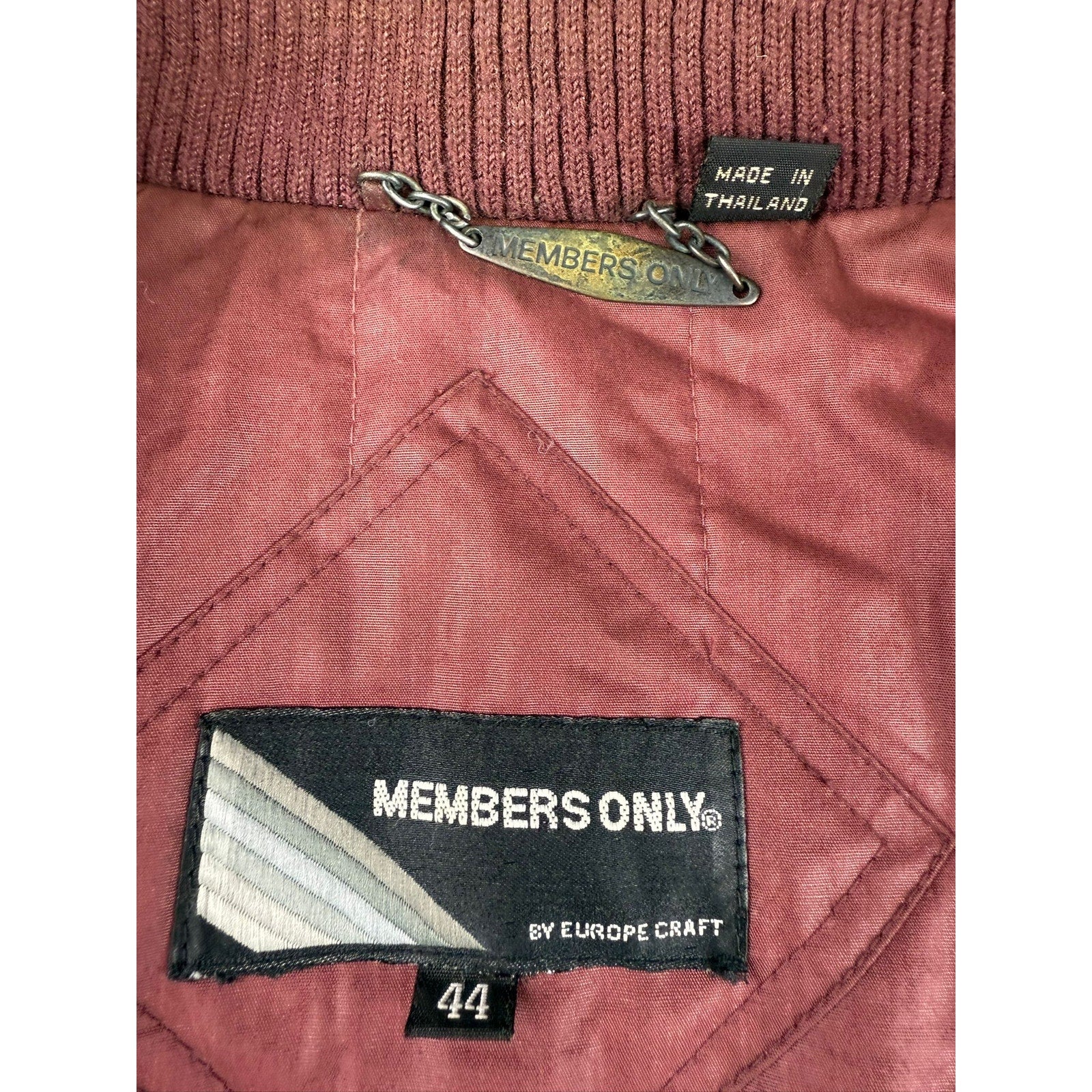 A vintage Members Only bomber jacket by Europe Craft in a rich burgundy color. Features durable quilted construction, military-style epaulettes, a standing collar with snap closure, full front zipper, and ribbed waistband and cuffs—sporty retro style from the iconic brand.